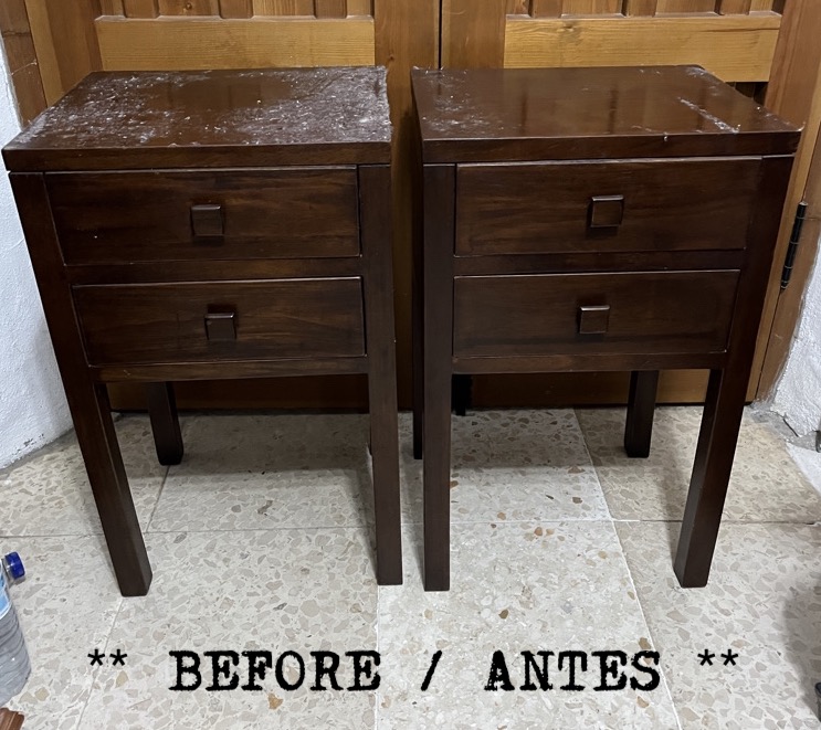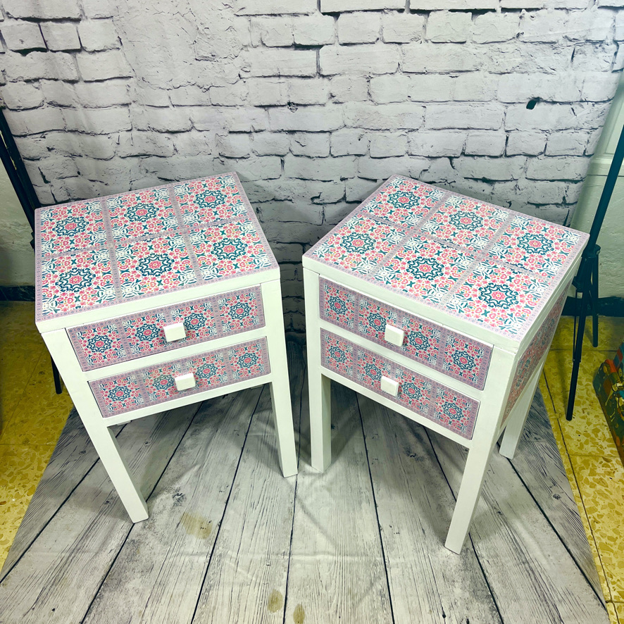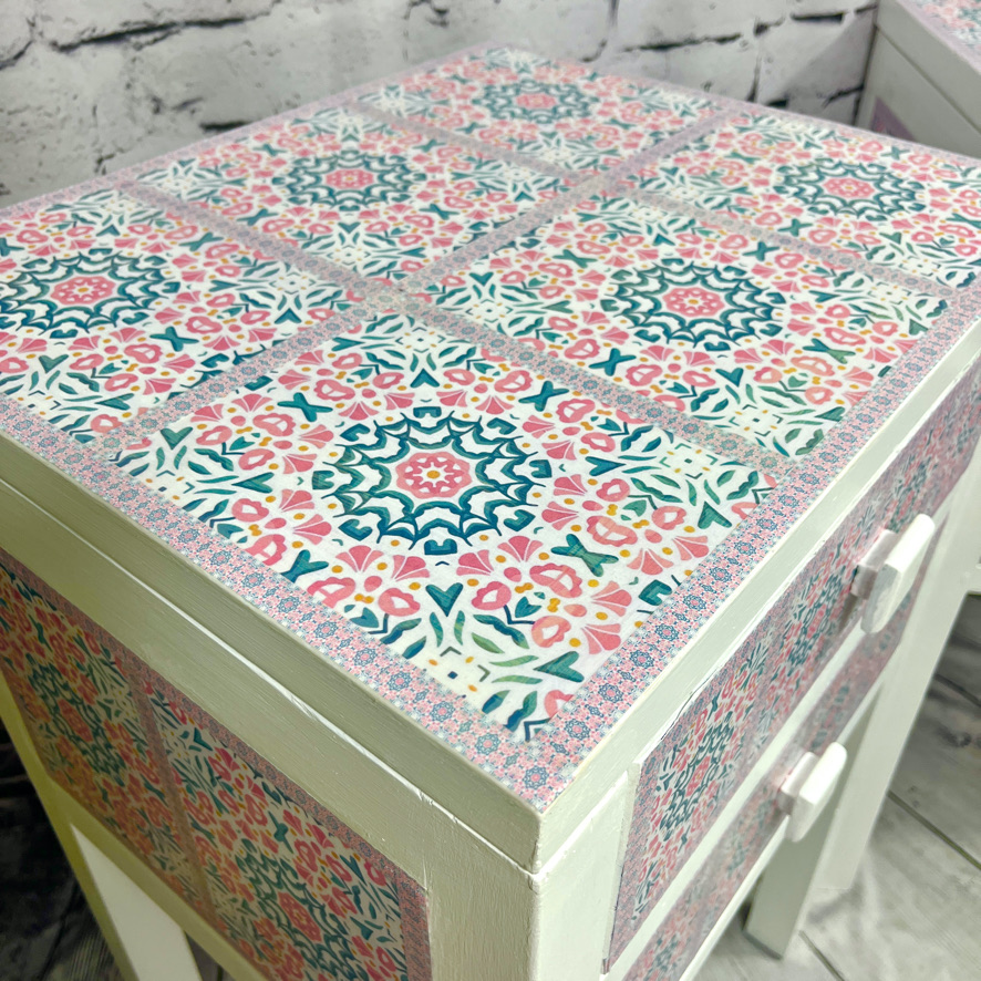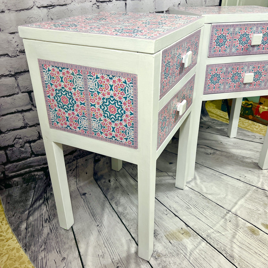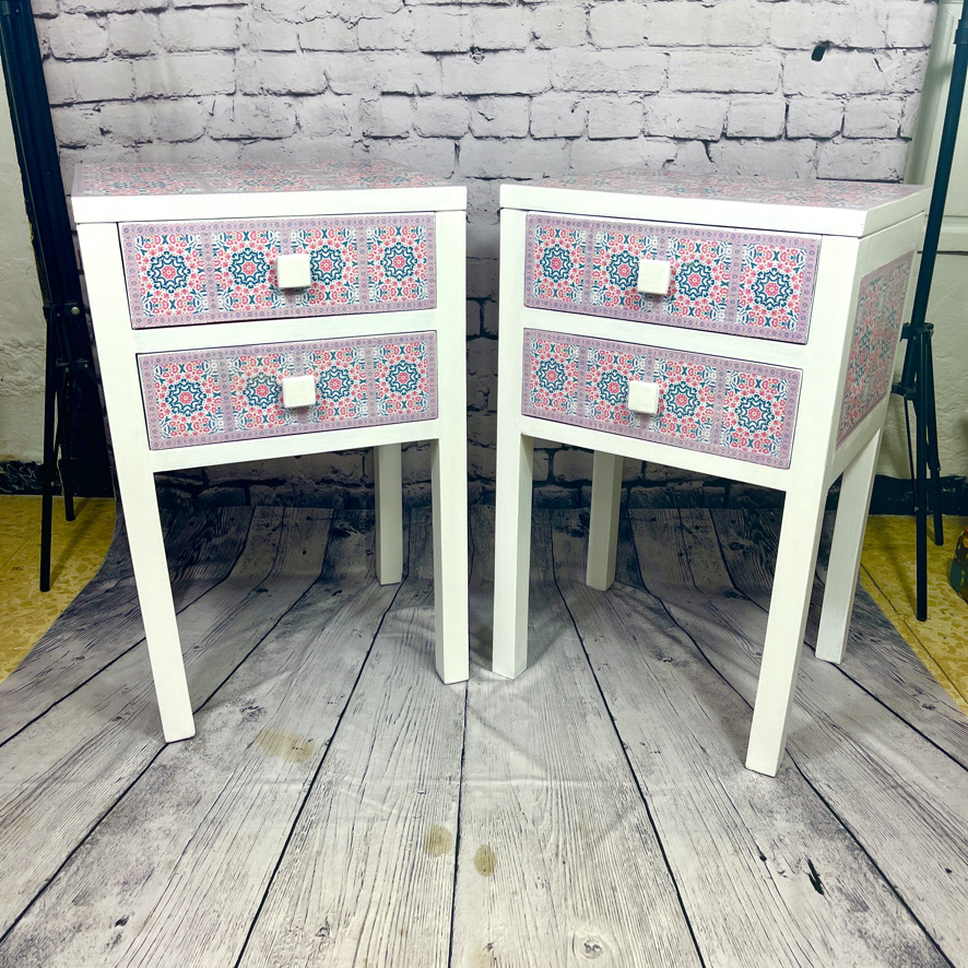 These 2 solid, but plain, side units have been given a new lease of life with a white painted and decoupaged makeover, using a moorish, geometric pattern.