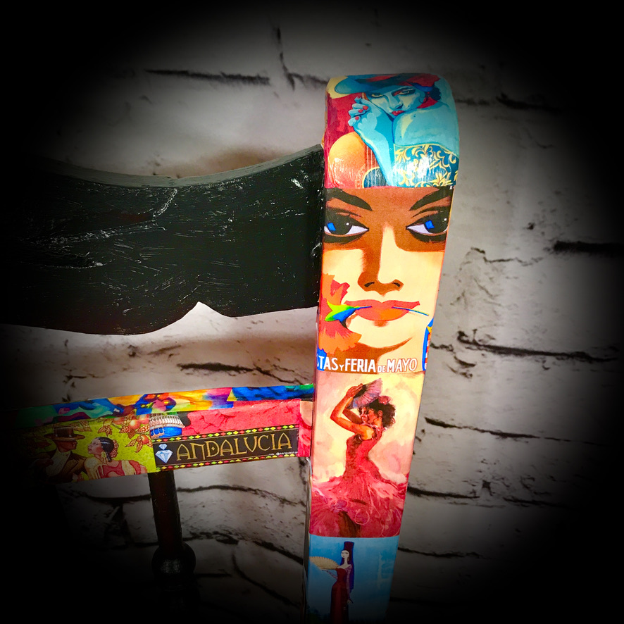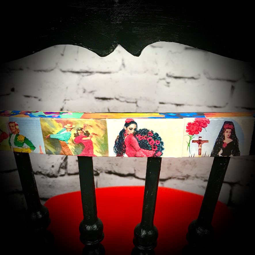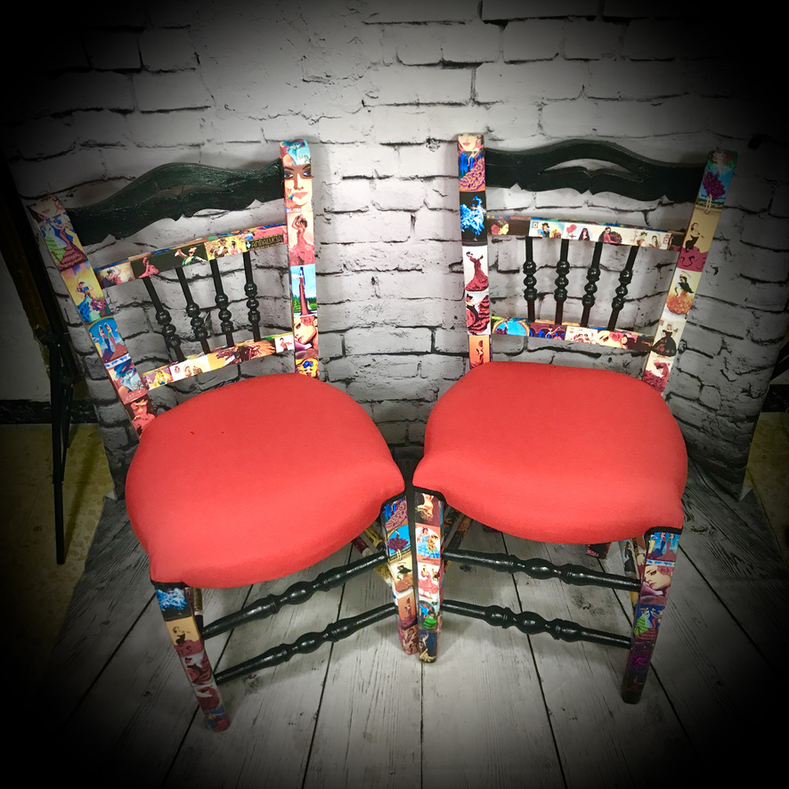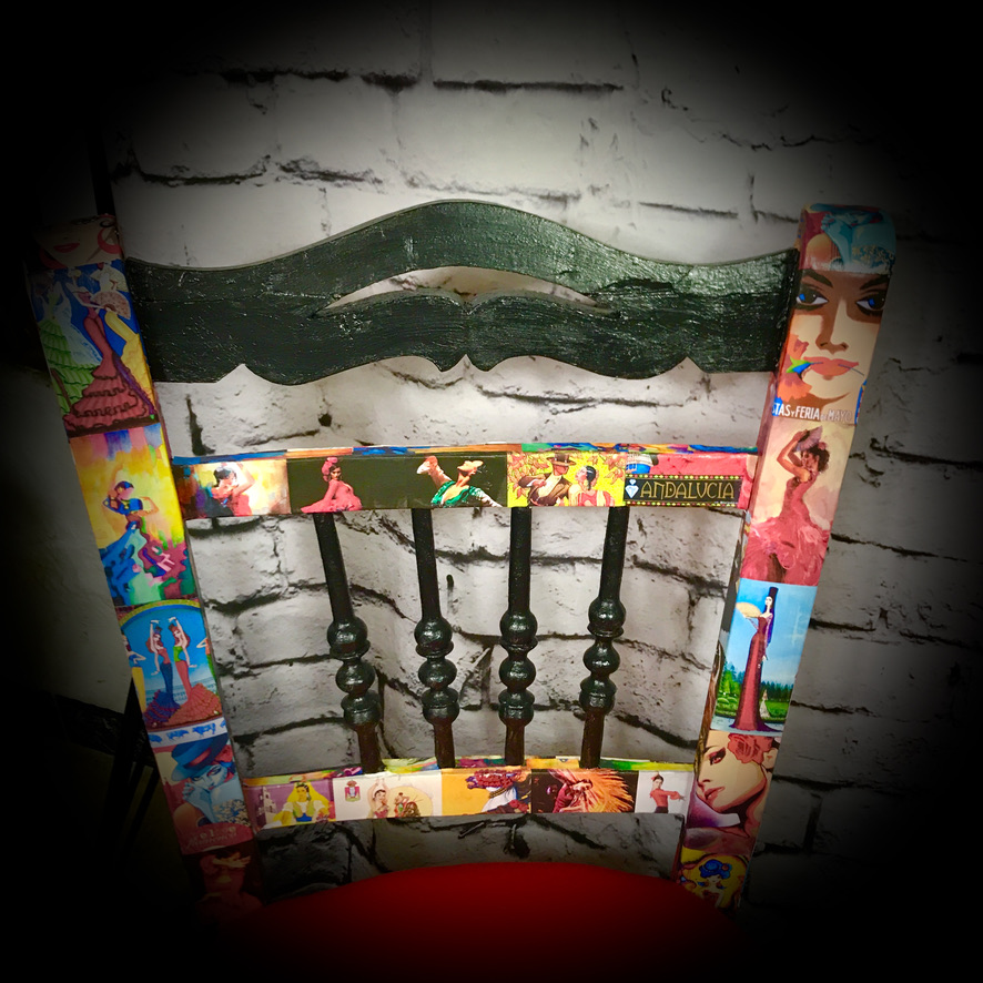 These 2 traditional chairs have been given new, foam seat pads covered in red and the frames hve been decoupaged with flamenca images to make truly unique pieces.