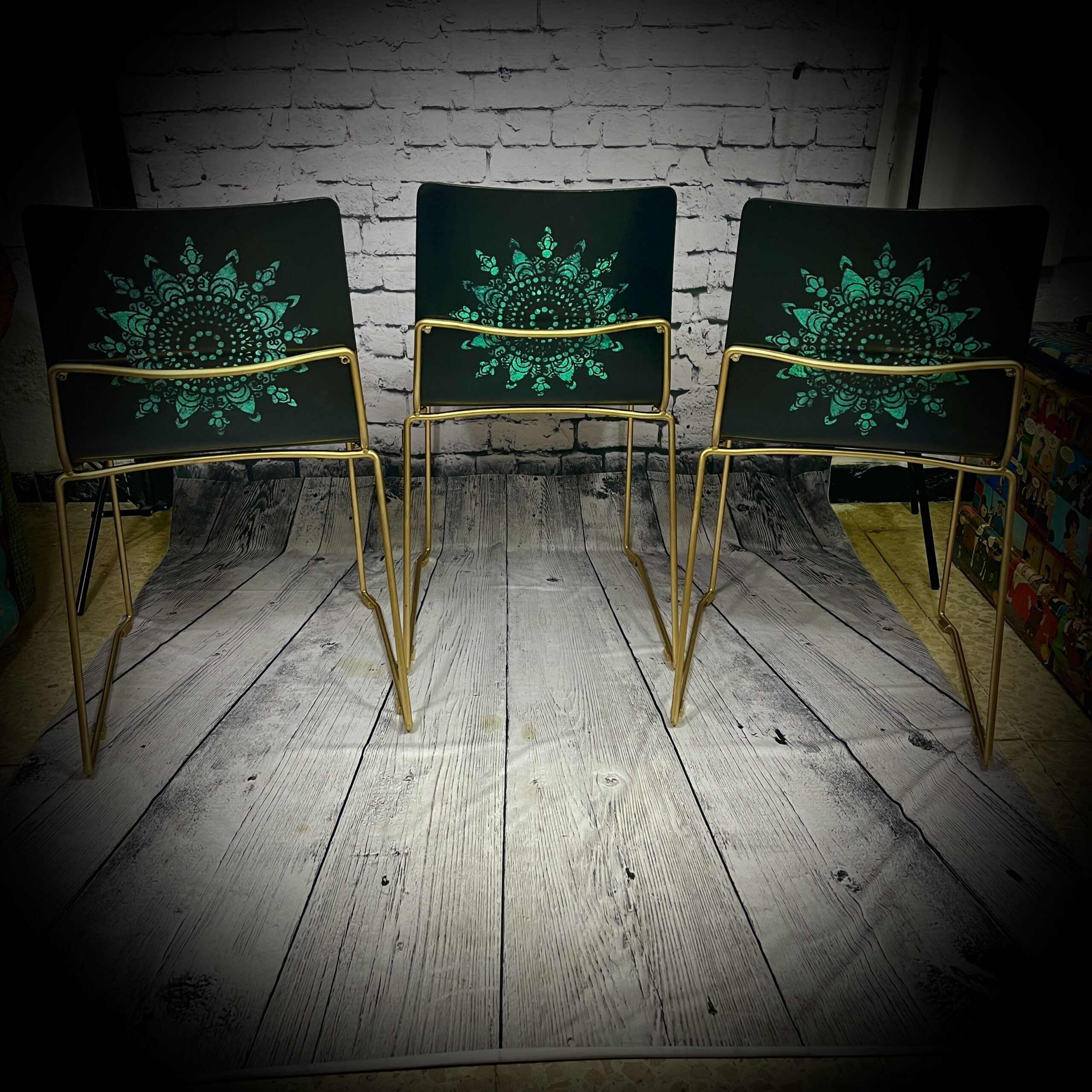 3 black and gold mandala chairs 250613