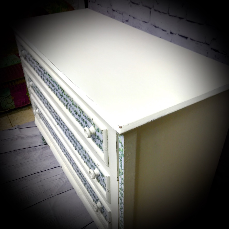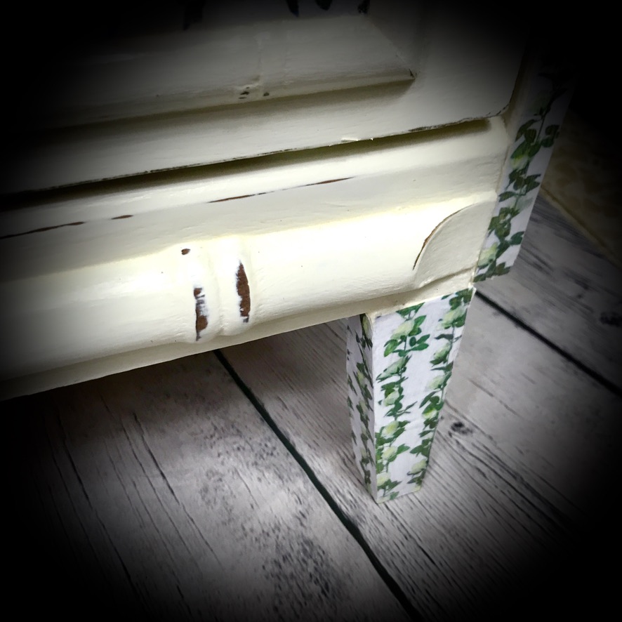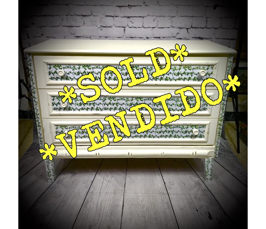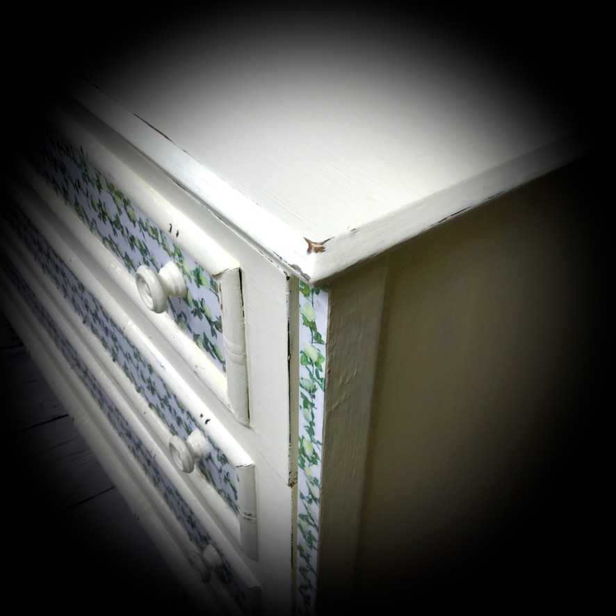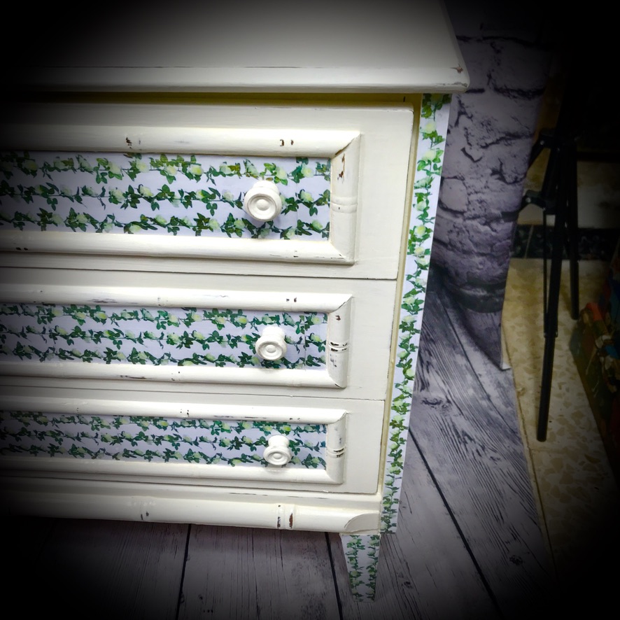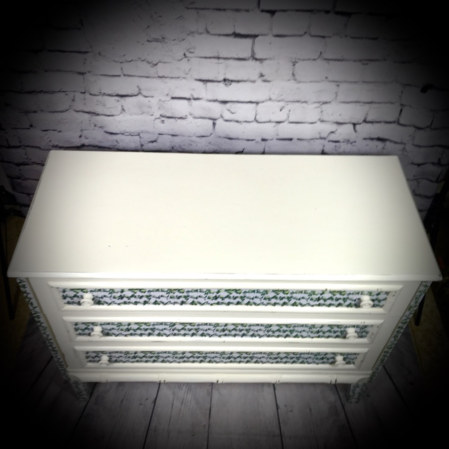 3 drawer chest of drawers painted in antique white, distressed and finished with a floral trim.