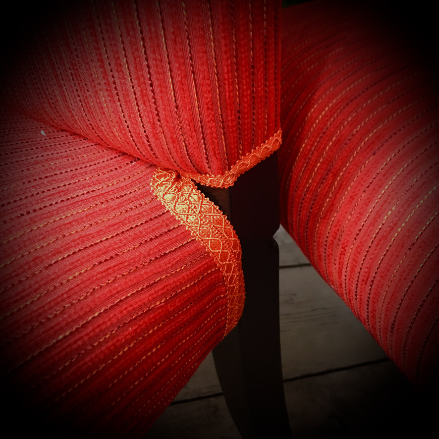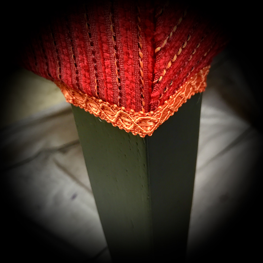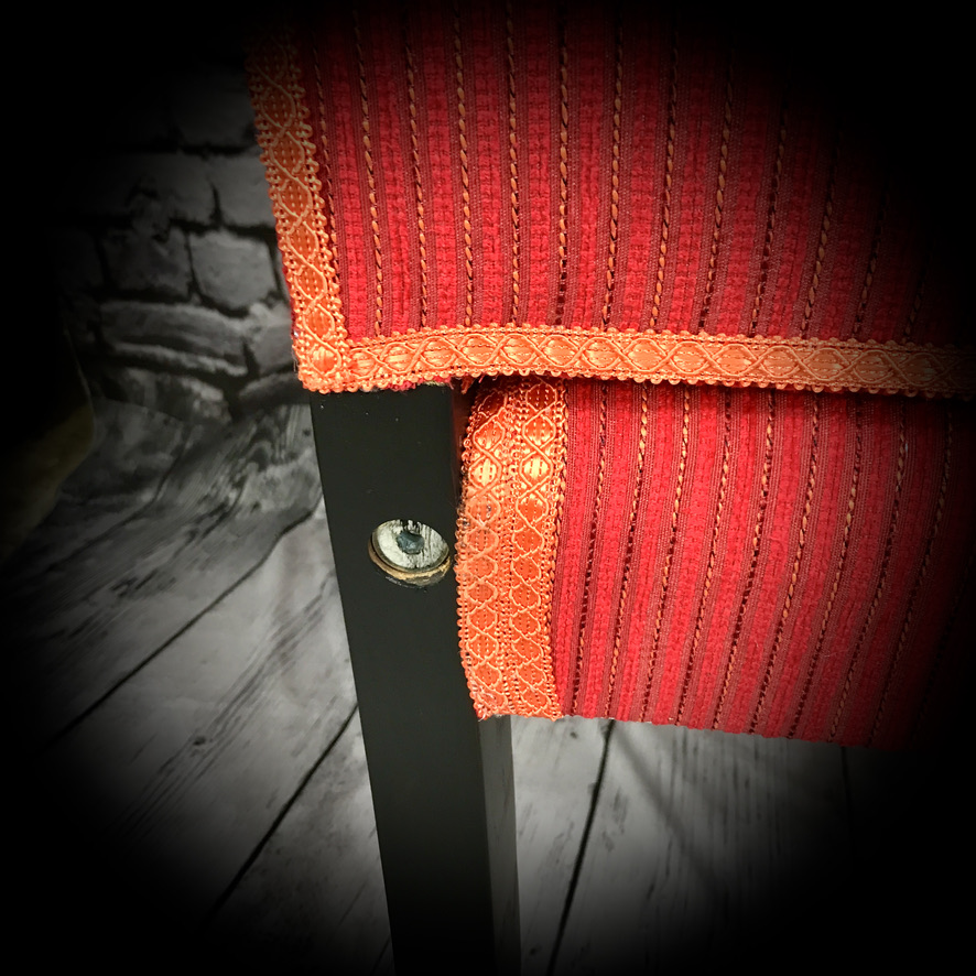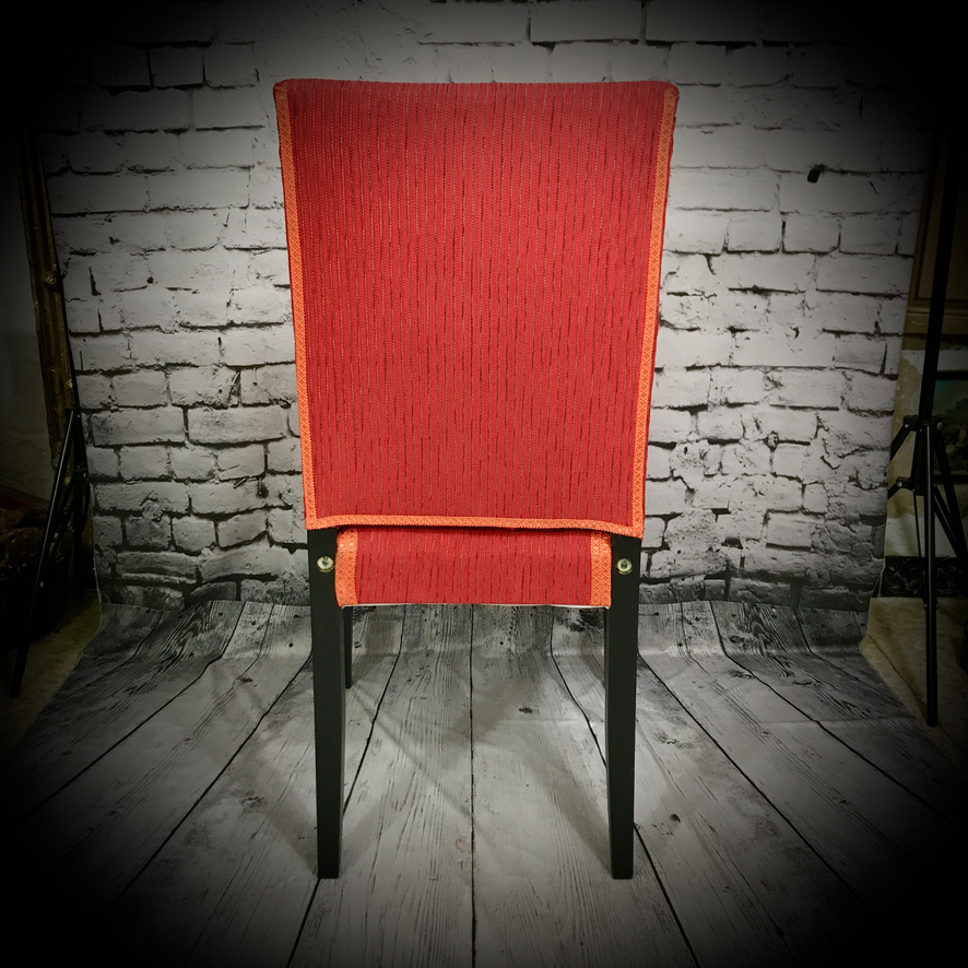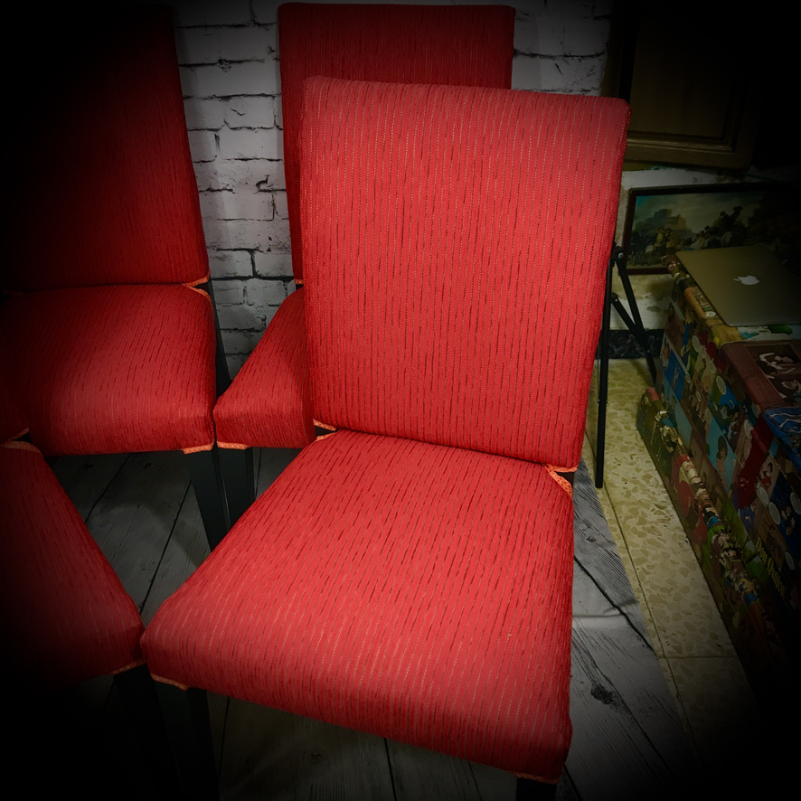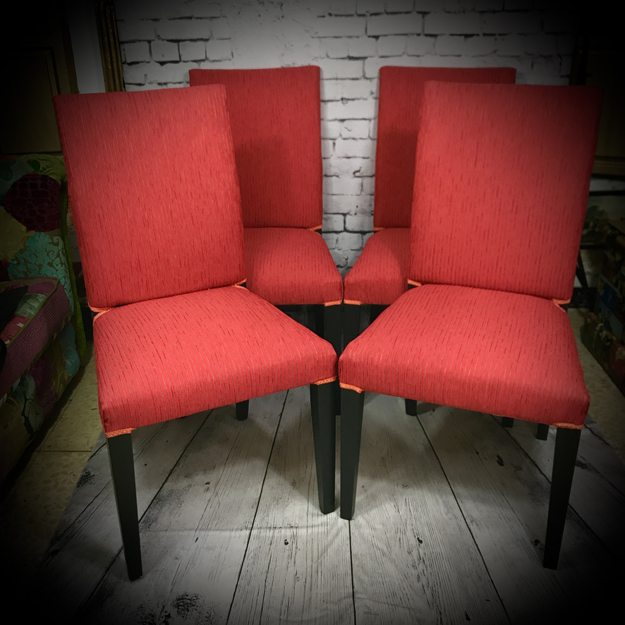 These IKEA chairs have been re-upholstered in a red fabric with orange thread, black paintwork on the frames and finished off with orange trimming.