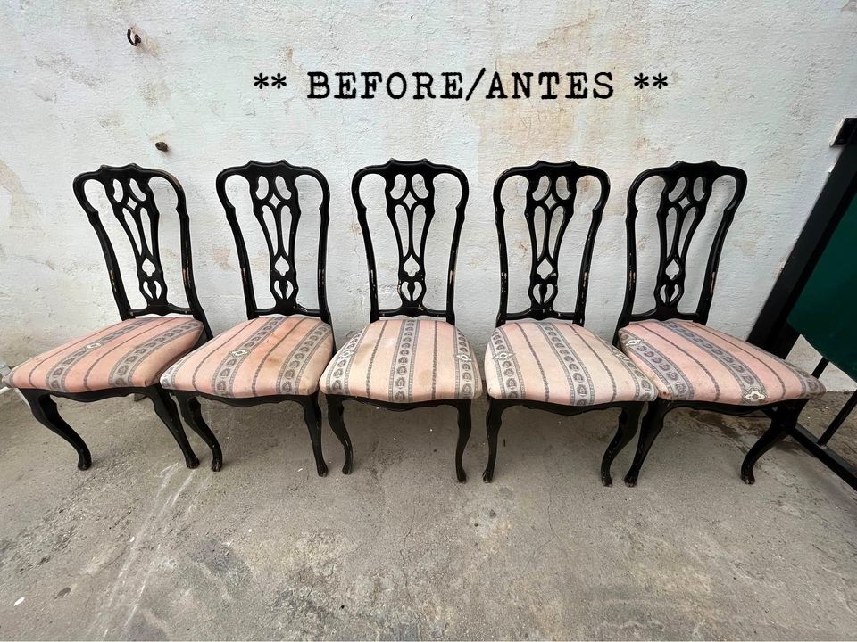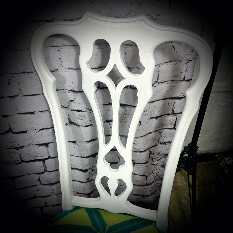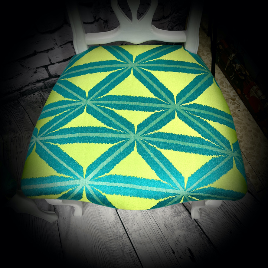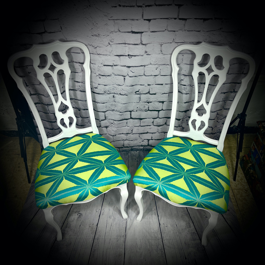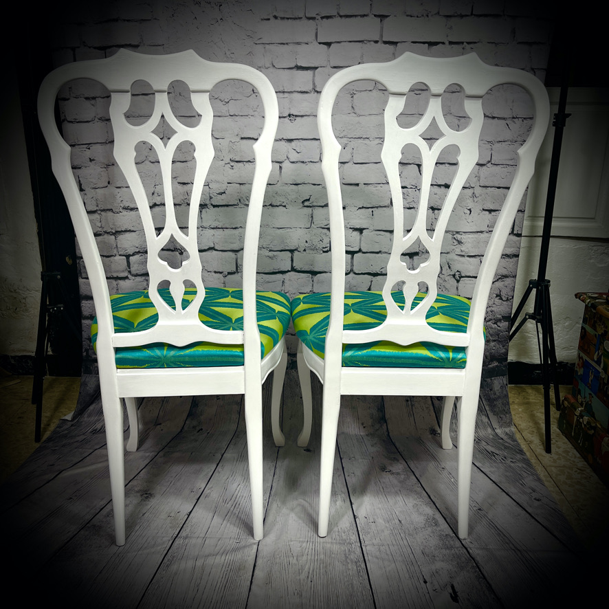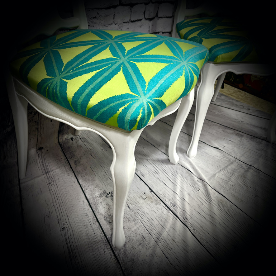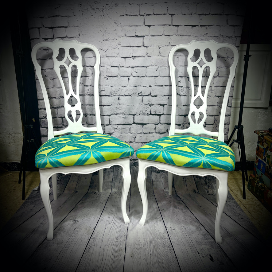 These solid wooden chairs have been saved from landfill and transformed into unique, eye-catching pieces of furniture. With white-painted frames and seats upholstered in an eye-catching, hardwearing fabric, these chairs would stand out in any room!