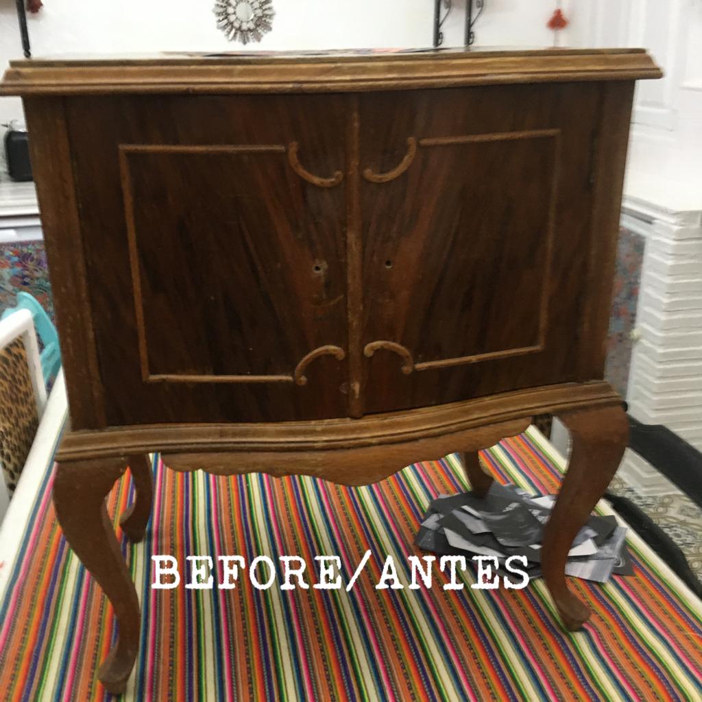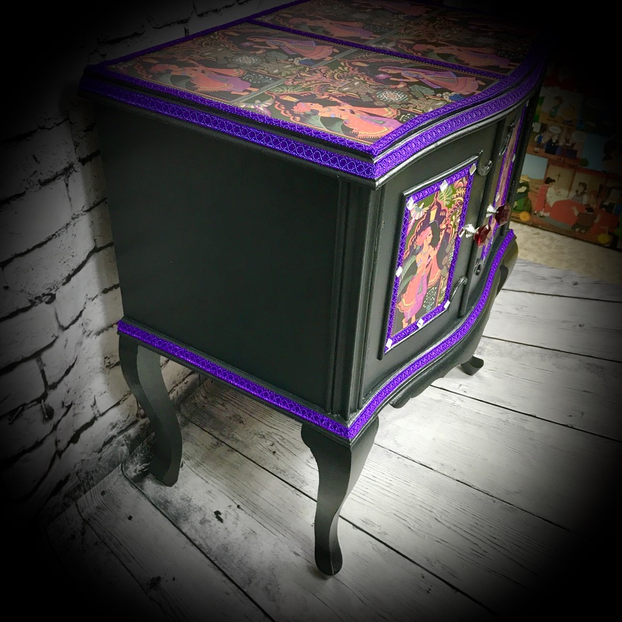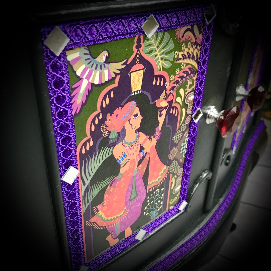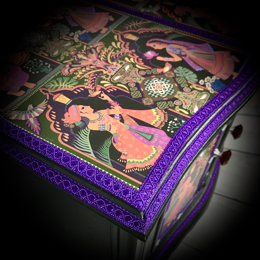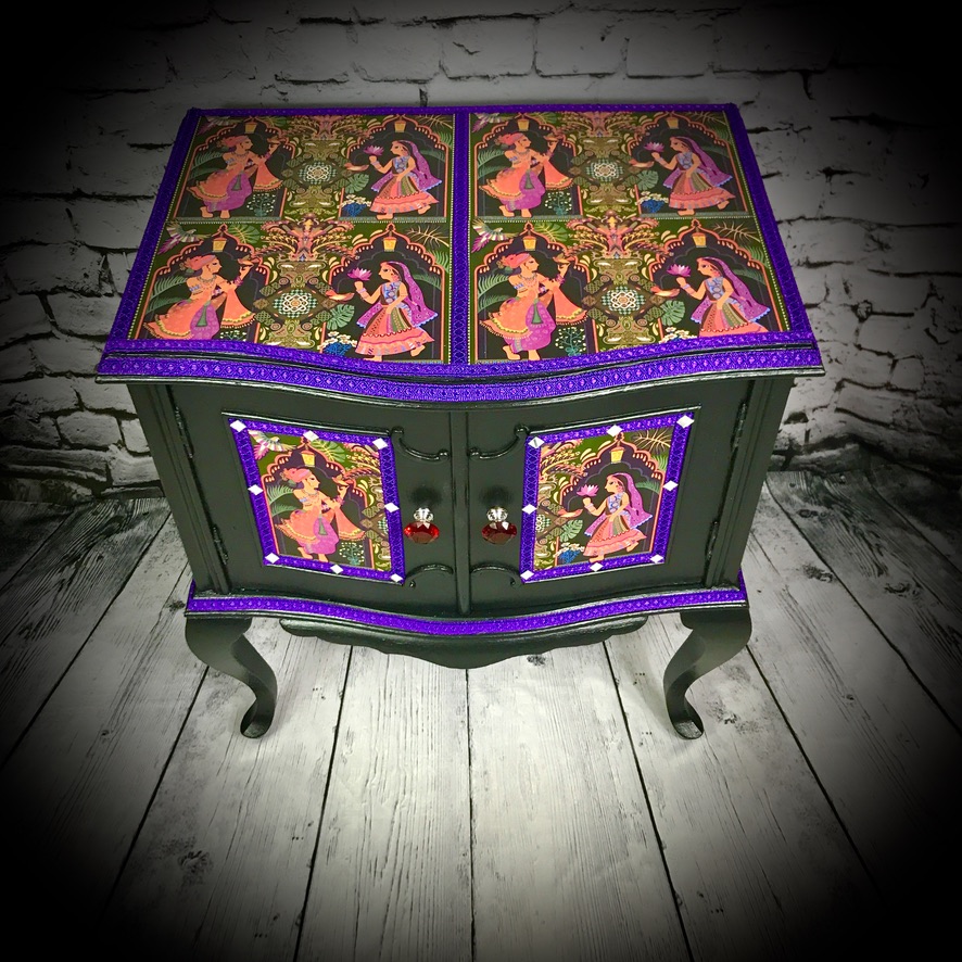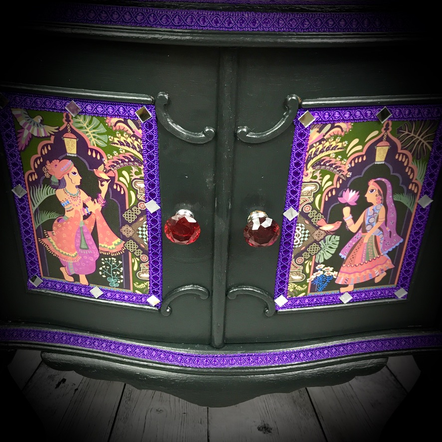 This plain brown cabinet has been given a black paint job and decorated with an Indian print, trimmings and other decoration.