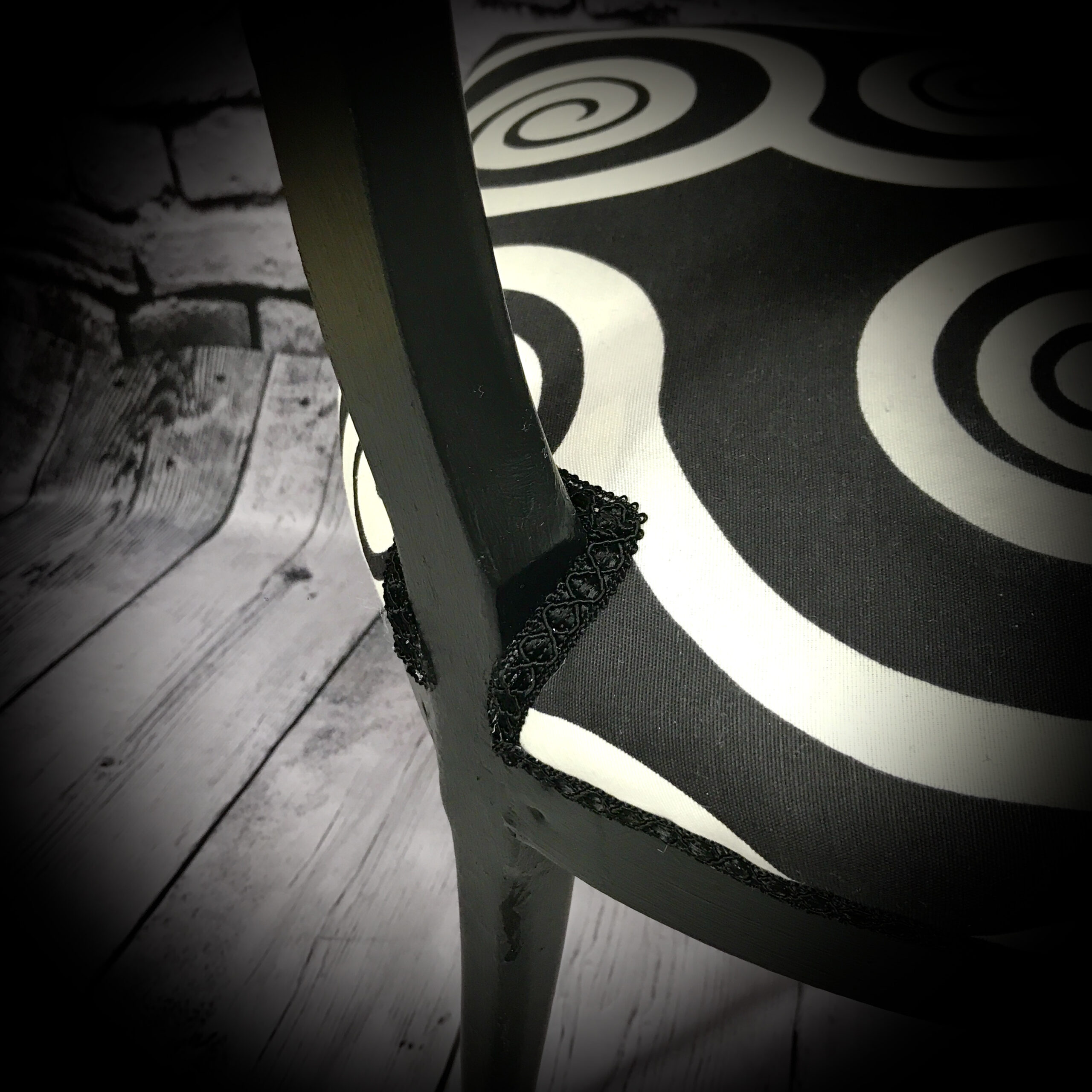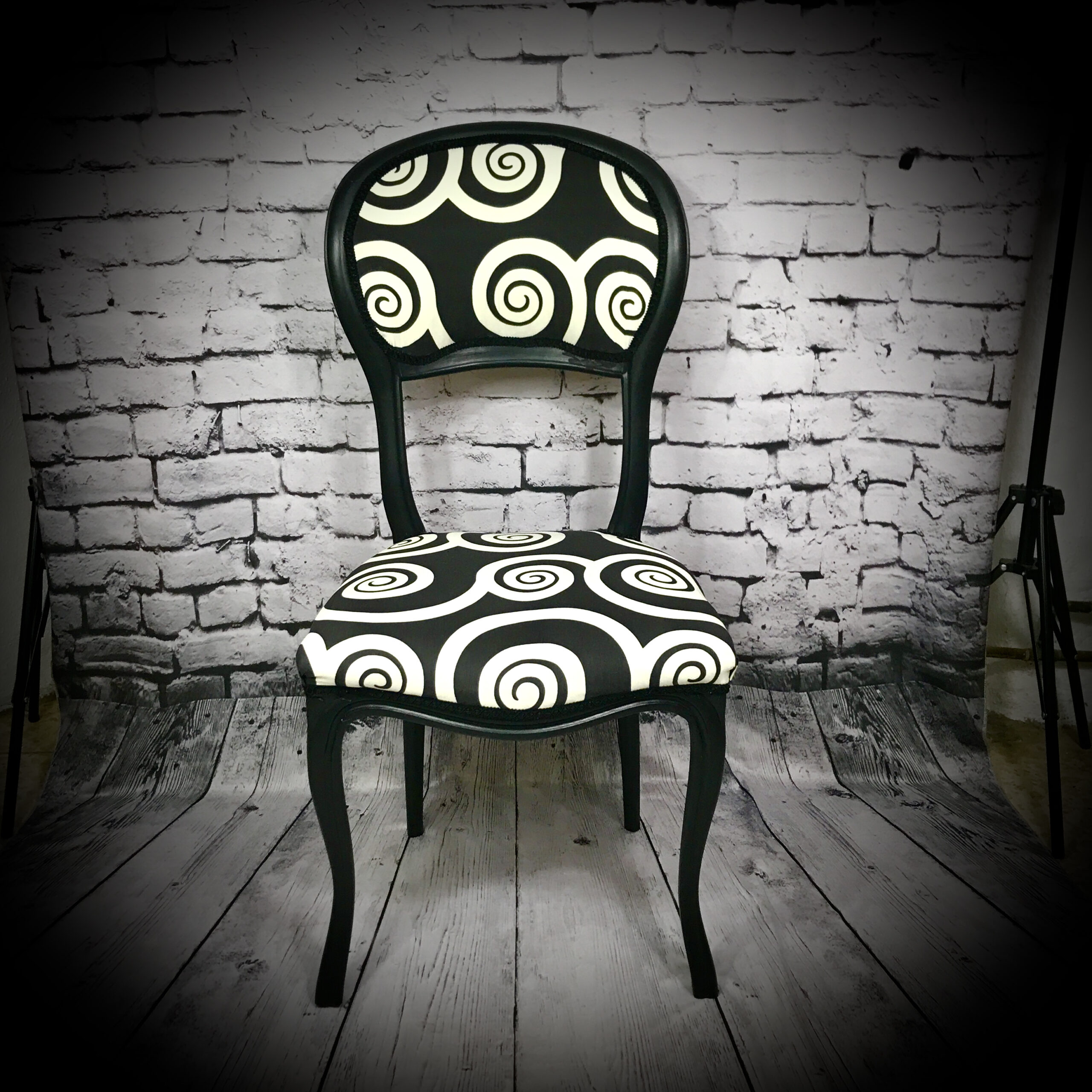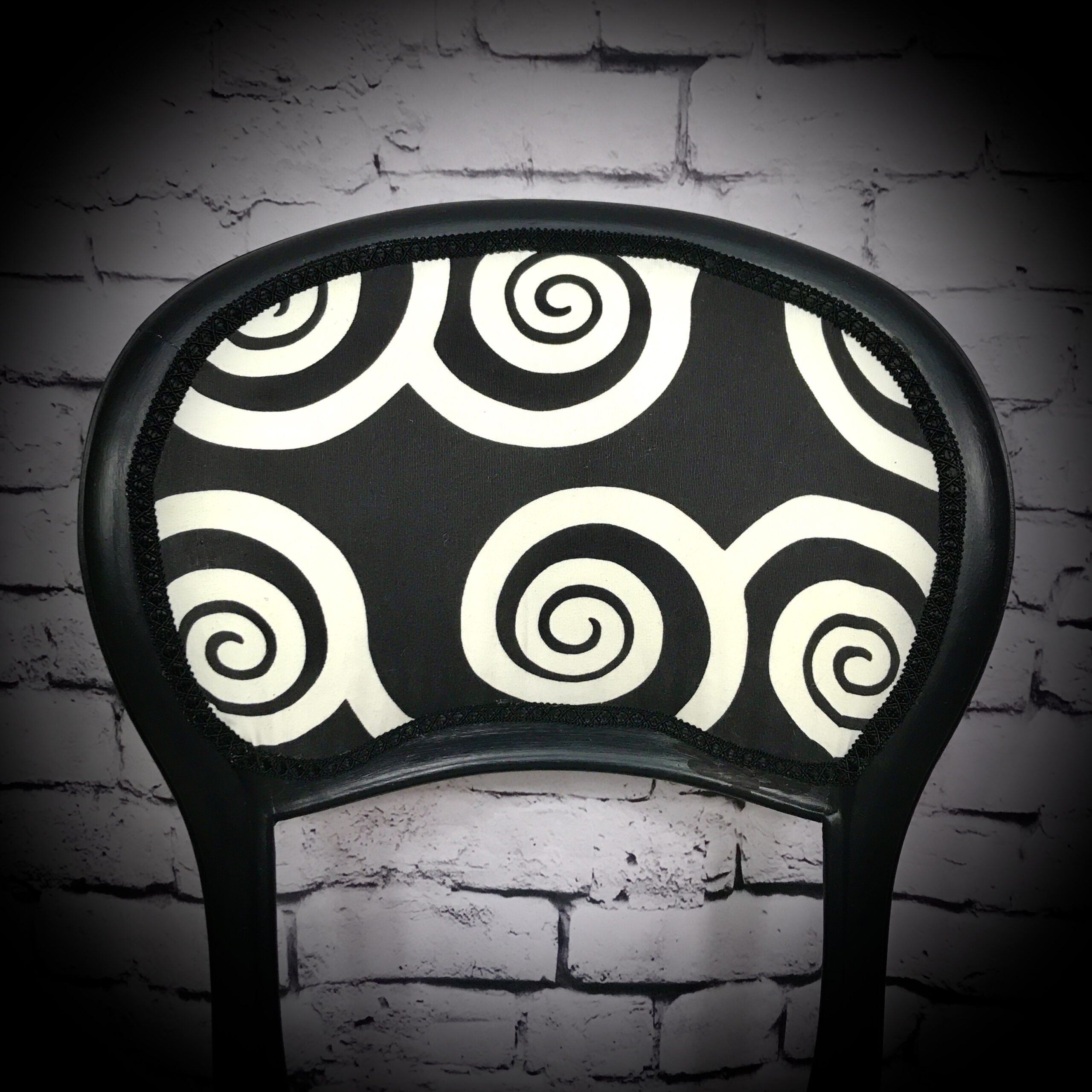 This wood-framed chair has been given a black paint job and re-upholstered in a black and white swirl fabric.