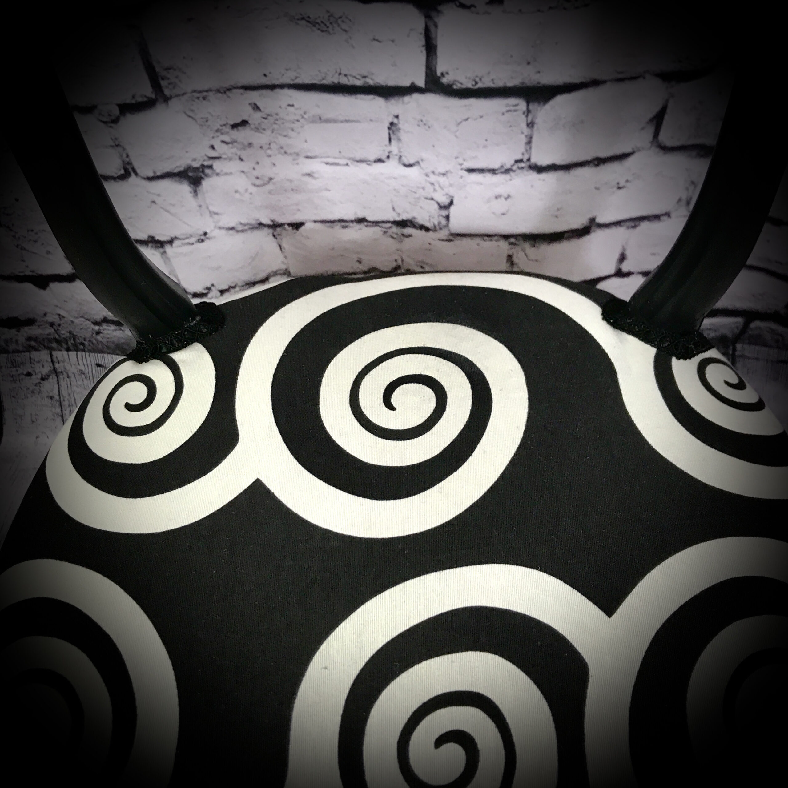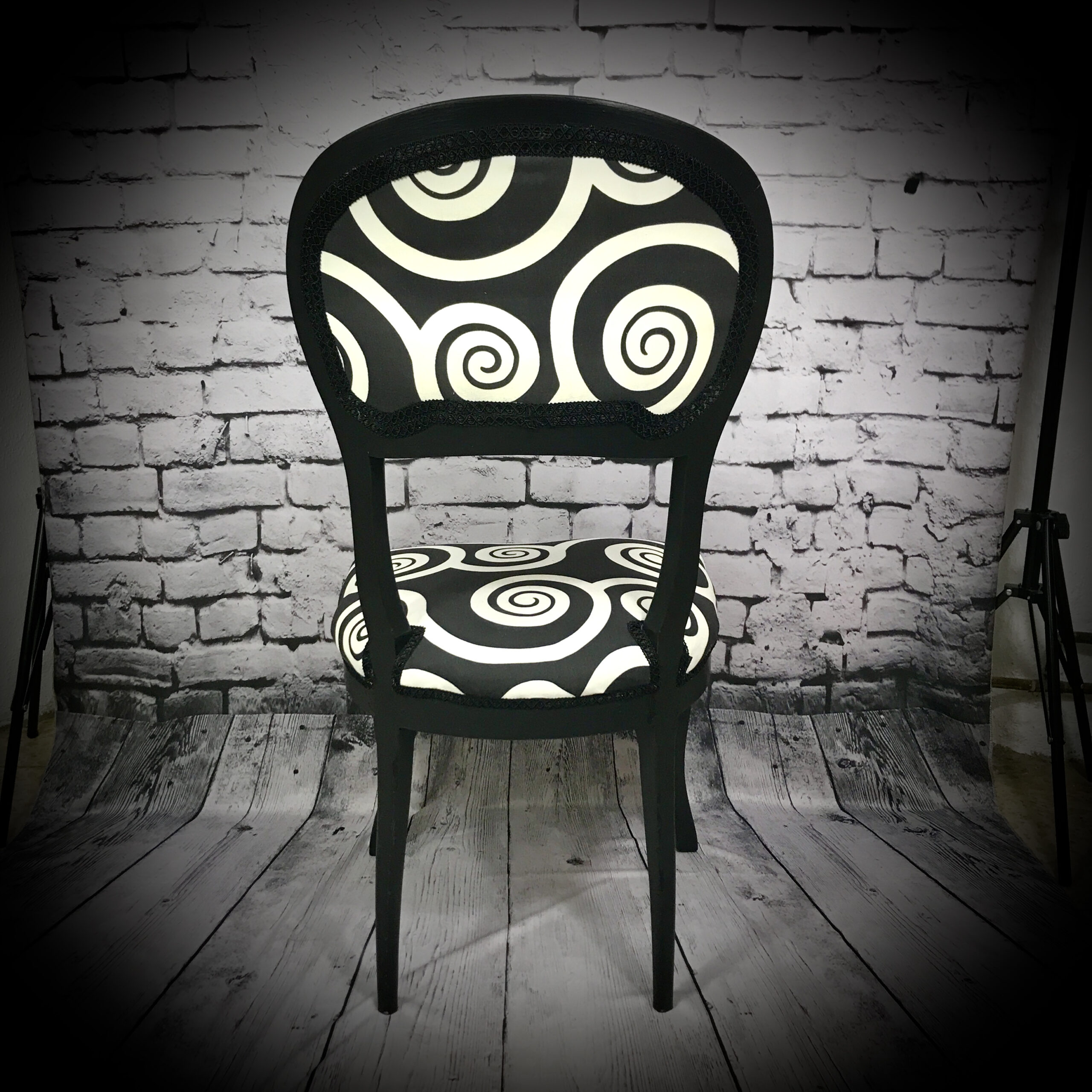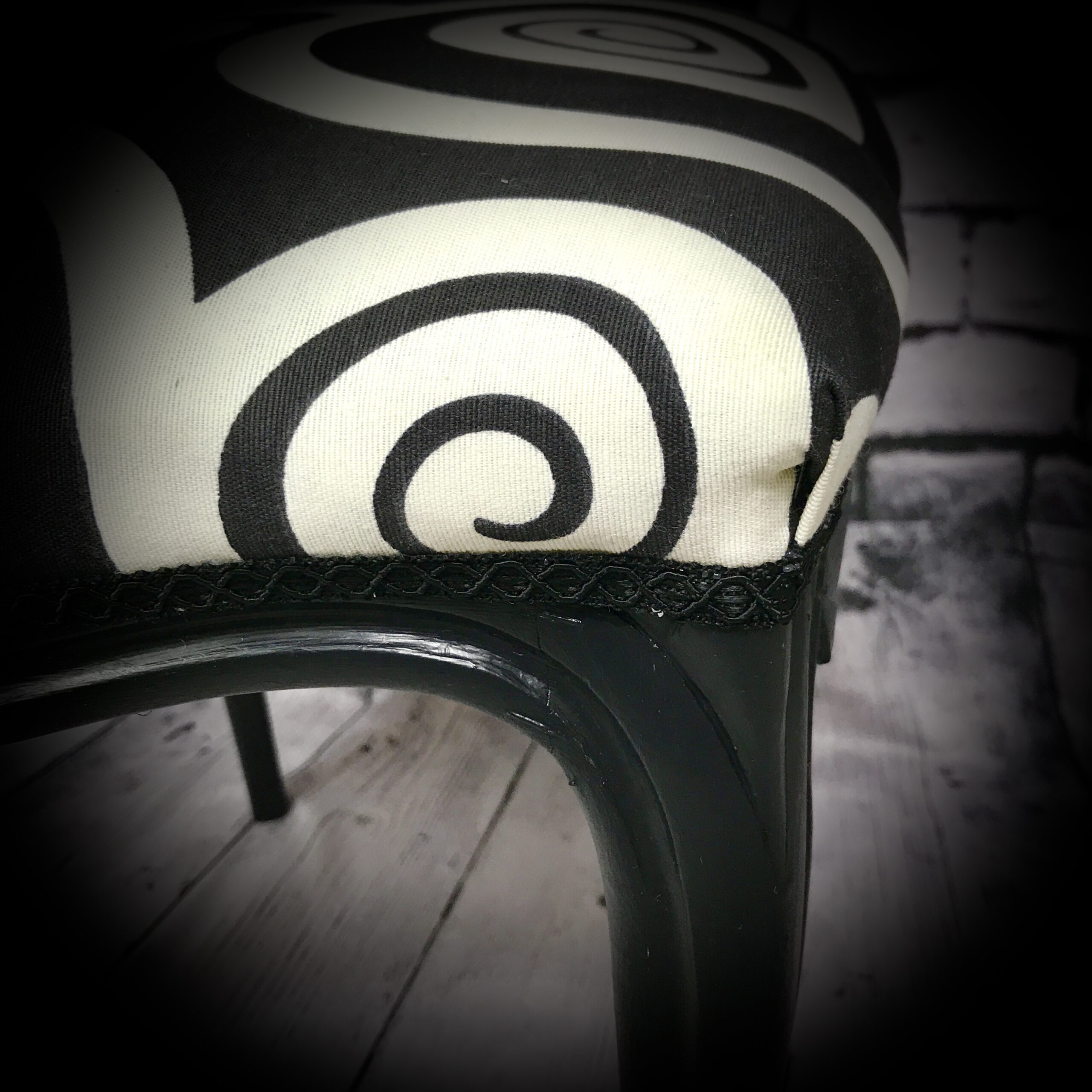 This wood-framed chair has been given a black paint job and re-upholstered in a black and white swirl fabric.
