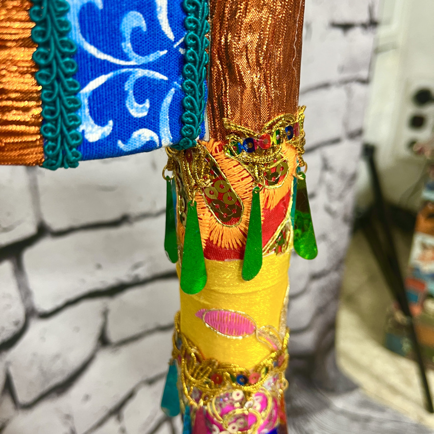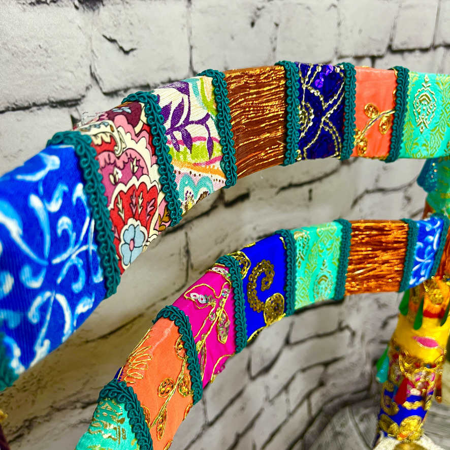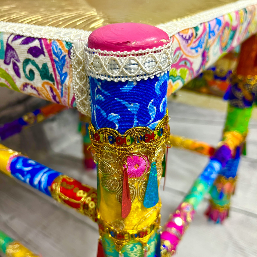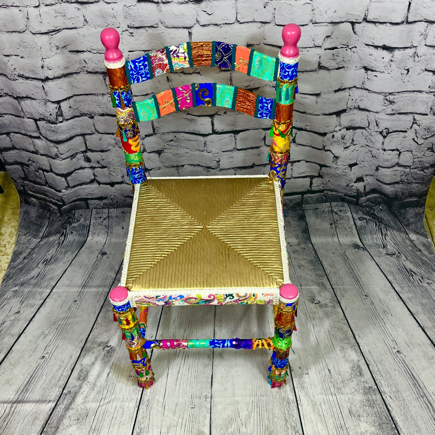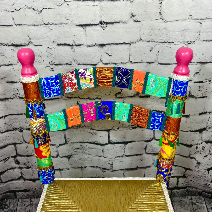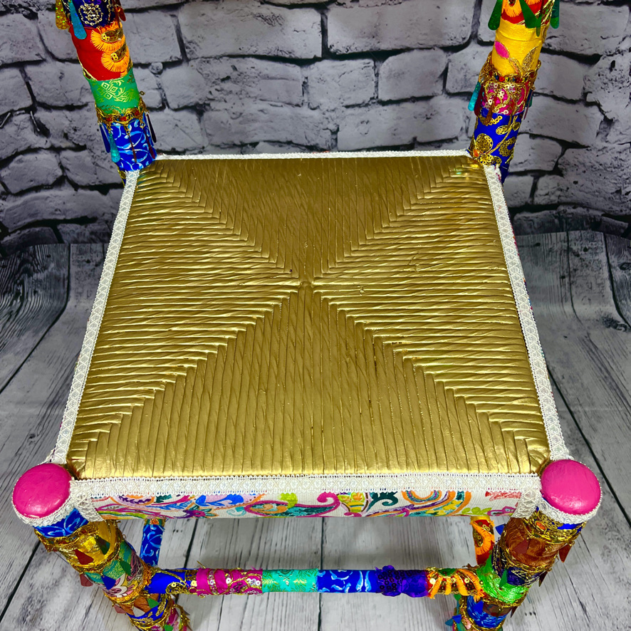 A classic ‘andalus’ style, this chair has been given a multi-coloured, “BoHo” makeover using Indian sari fabric pieces, Indian trimmings and a gold seat to make a truly stunning, standout piece of furniture.