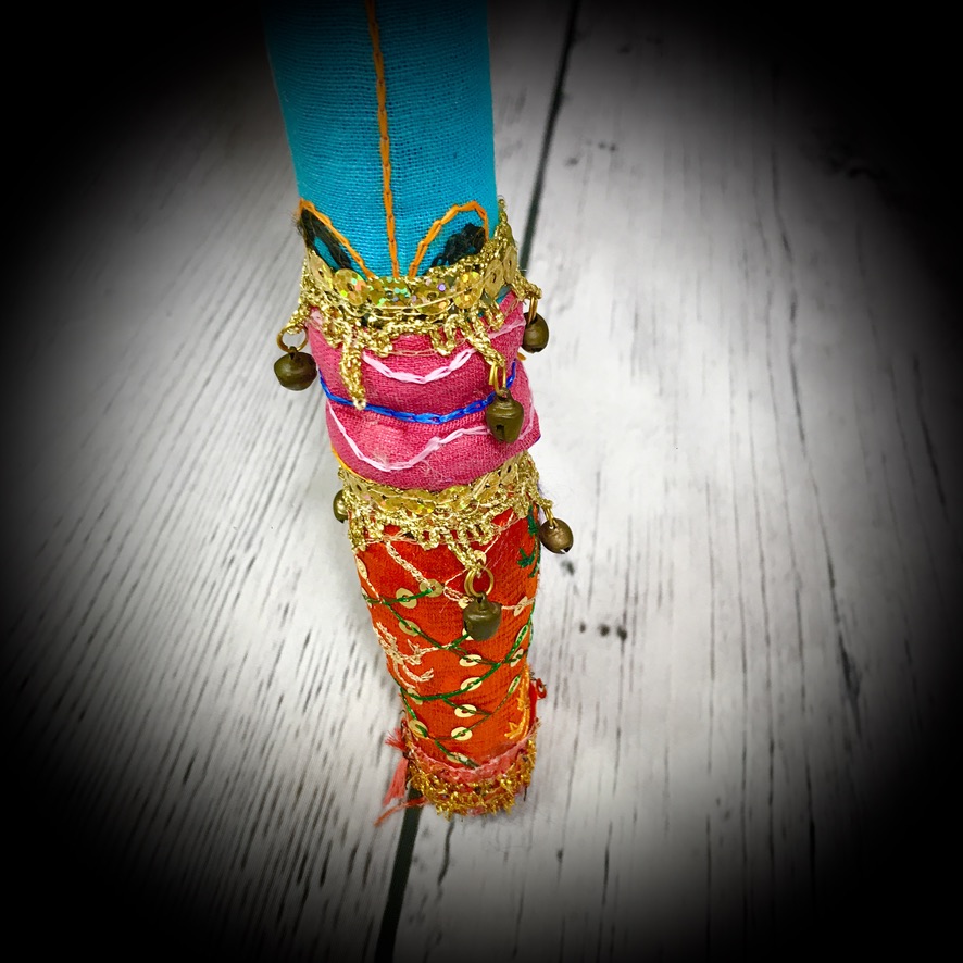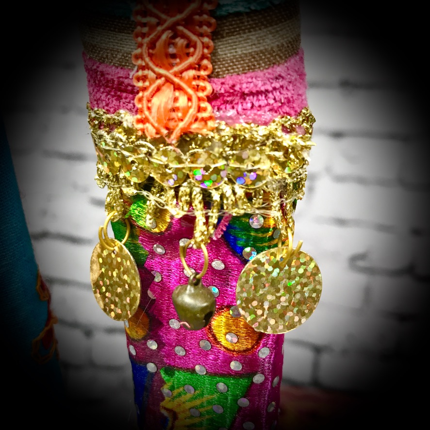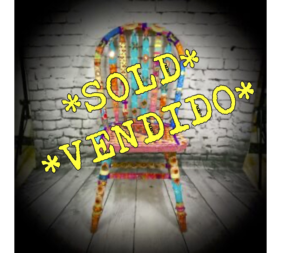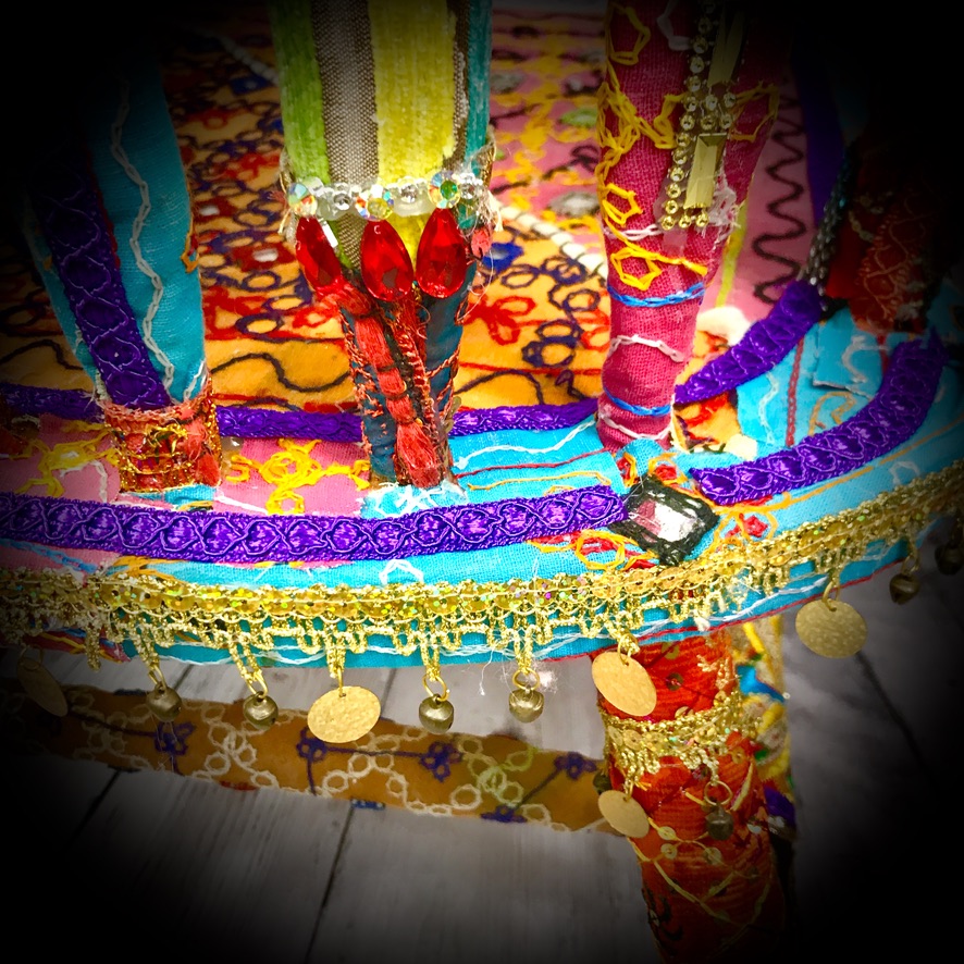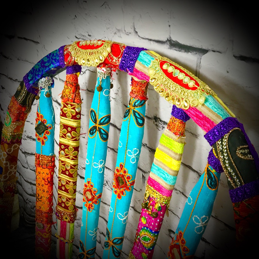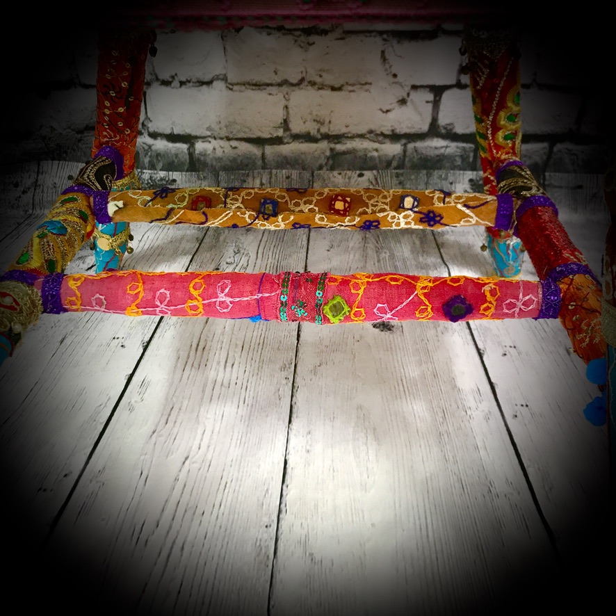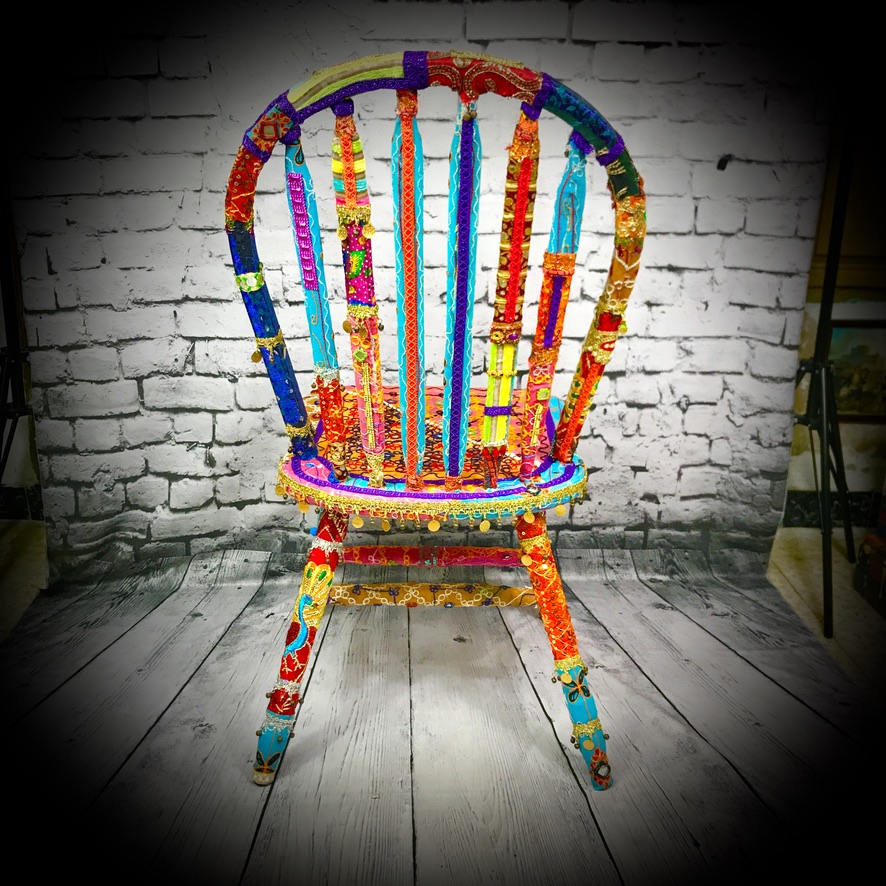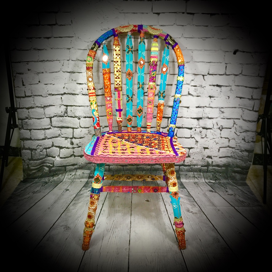 This wooden chair has been covered in pieces of fabric and trimmings to create a colourful and unique piece of furniture in a BoHo style.