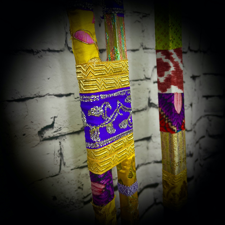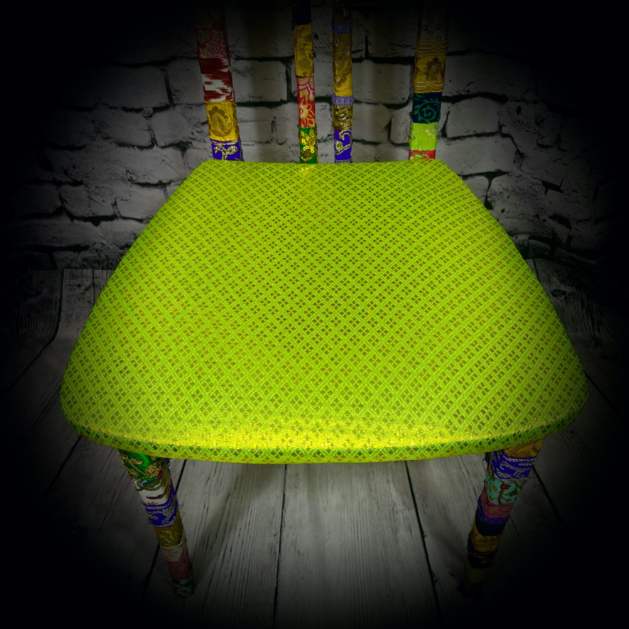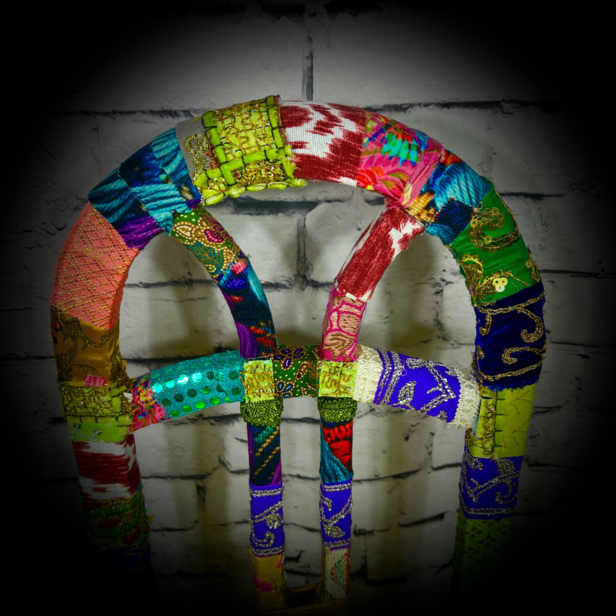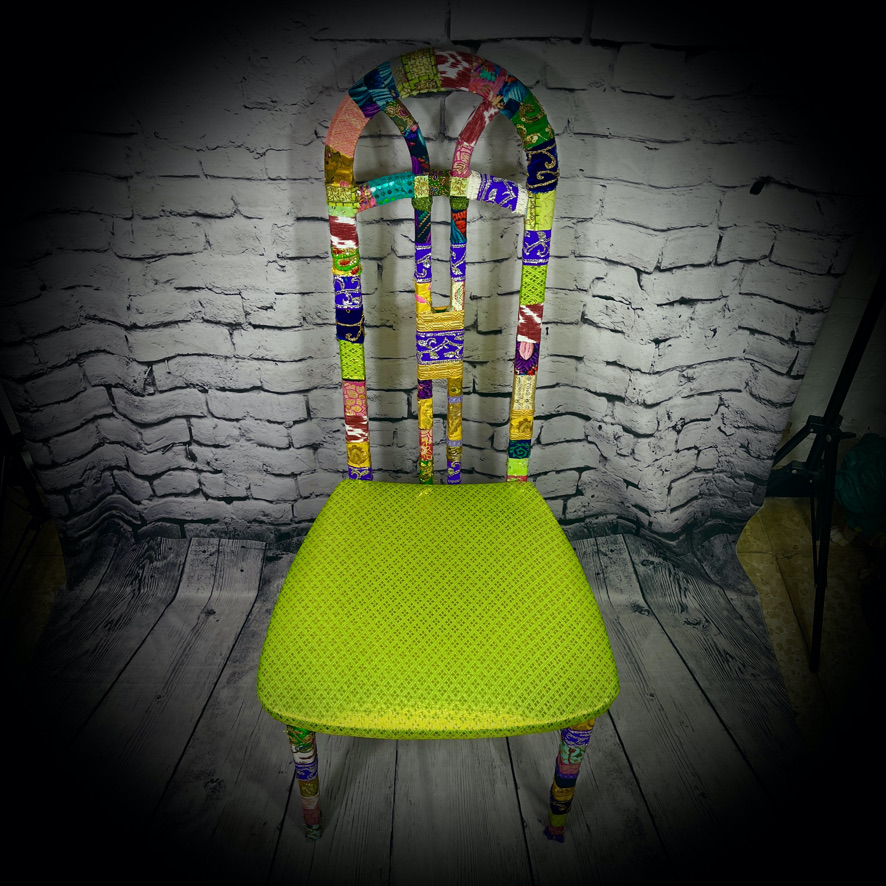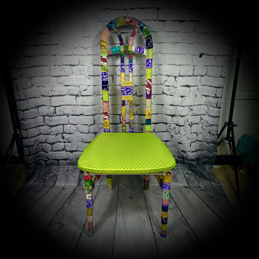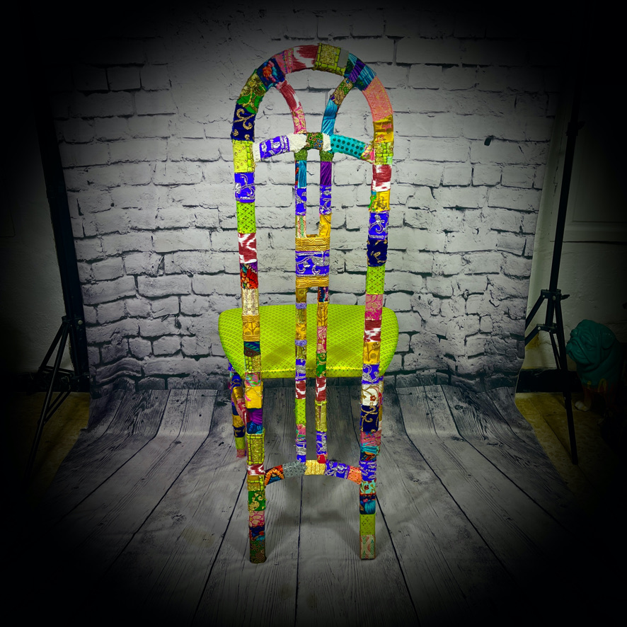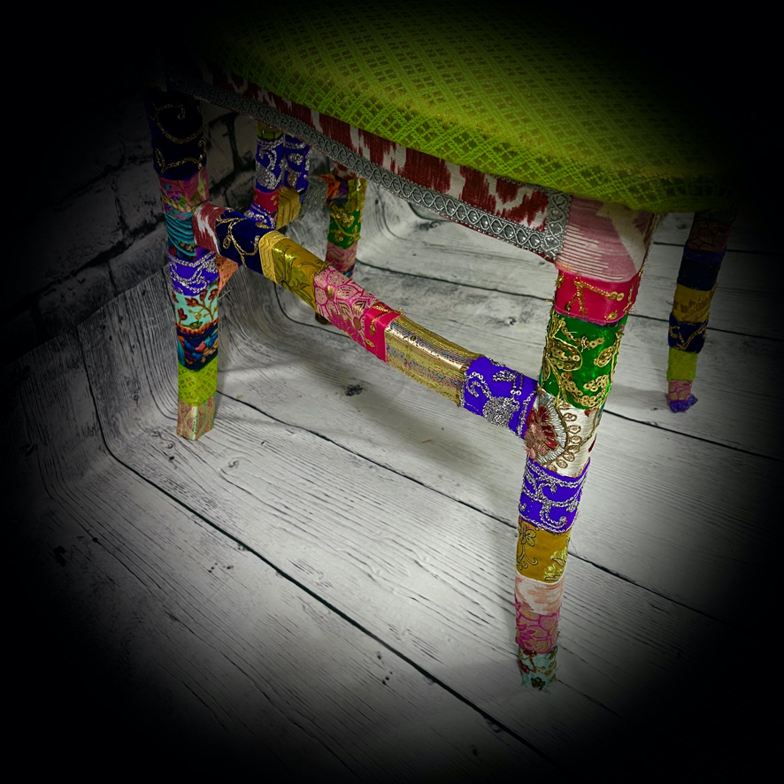 This solid, high back chair has been given a “BoHo” makeover with a range of fabrics, mostly of Indian make, to produce a unique, standout and useful piece of furniture.