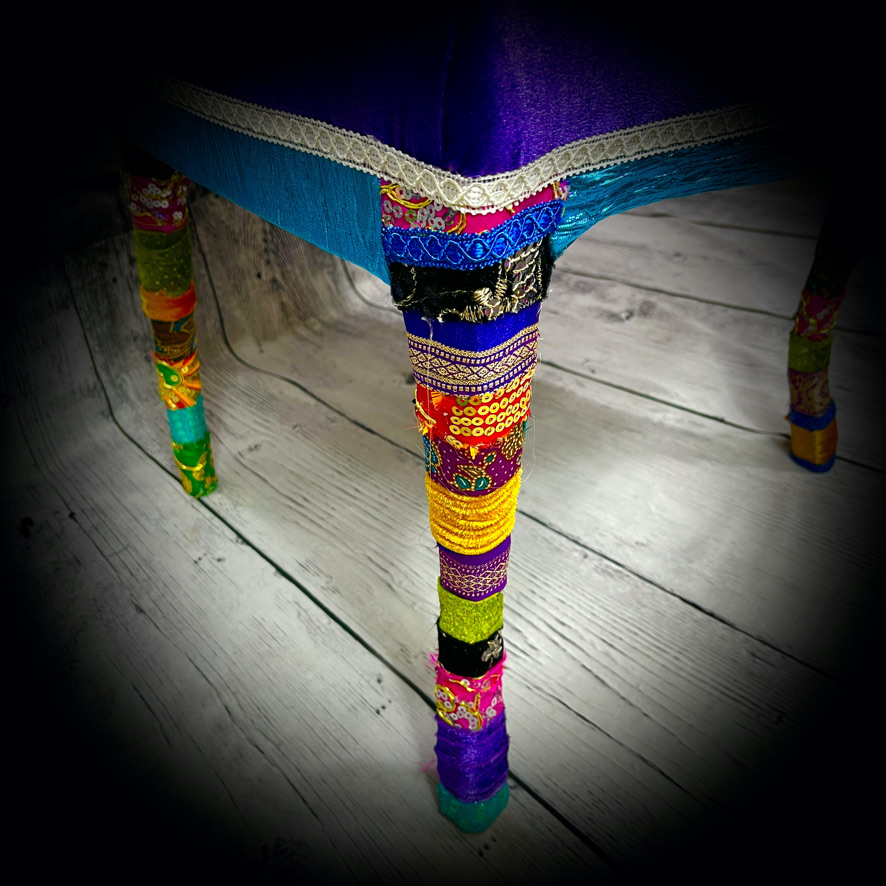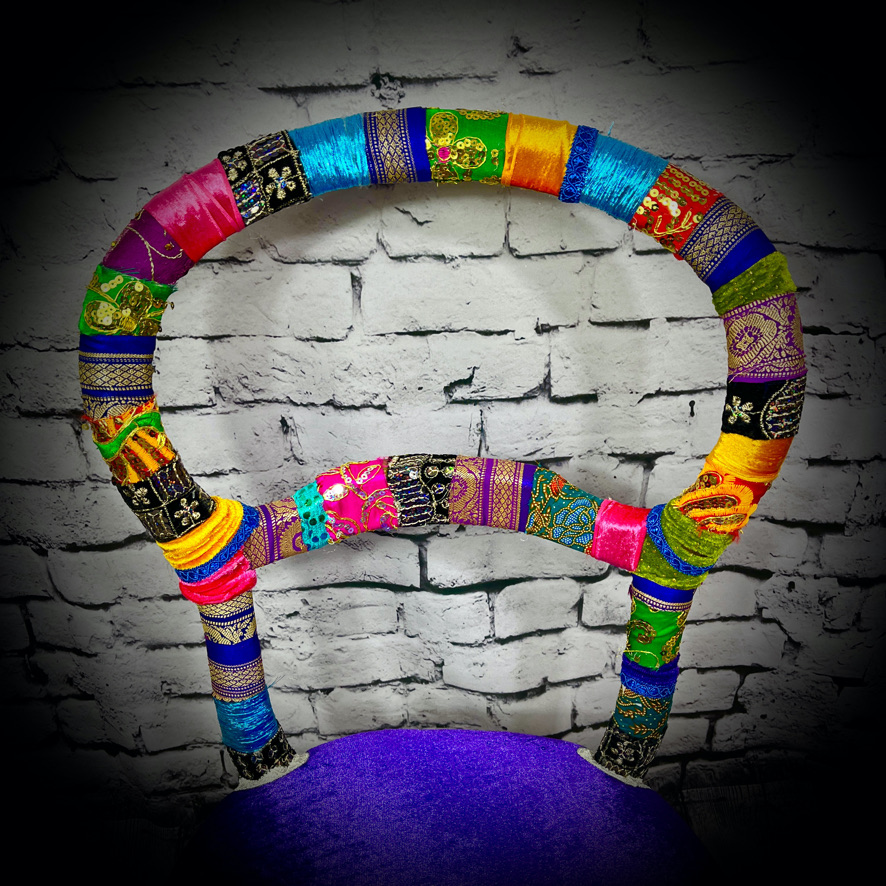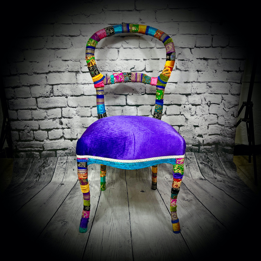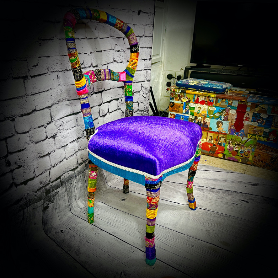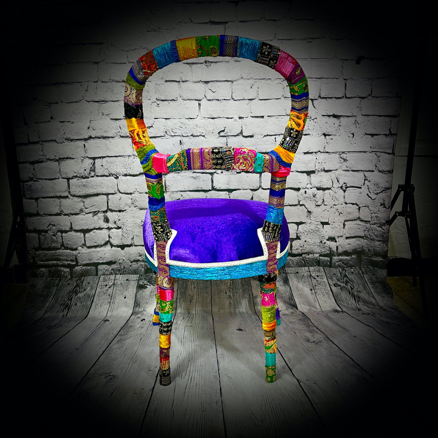 This stylish chair has been rescued from a trip to the landfill and given a colourful ribbon-wrapped makeover and re-upholstered seat to make a wow-factor and functional piece of furniture.
