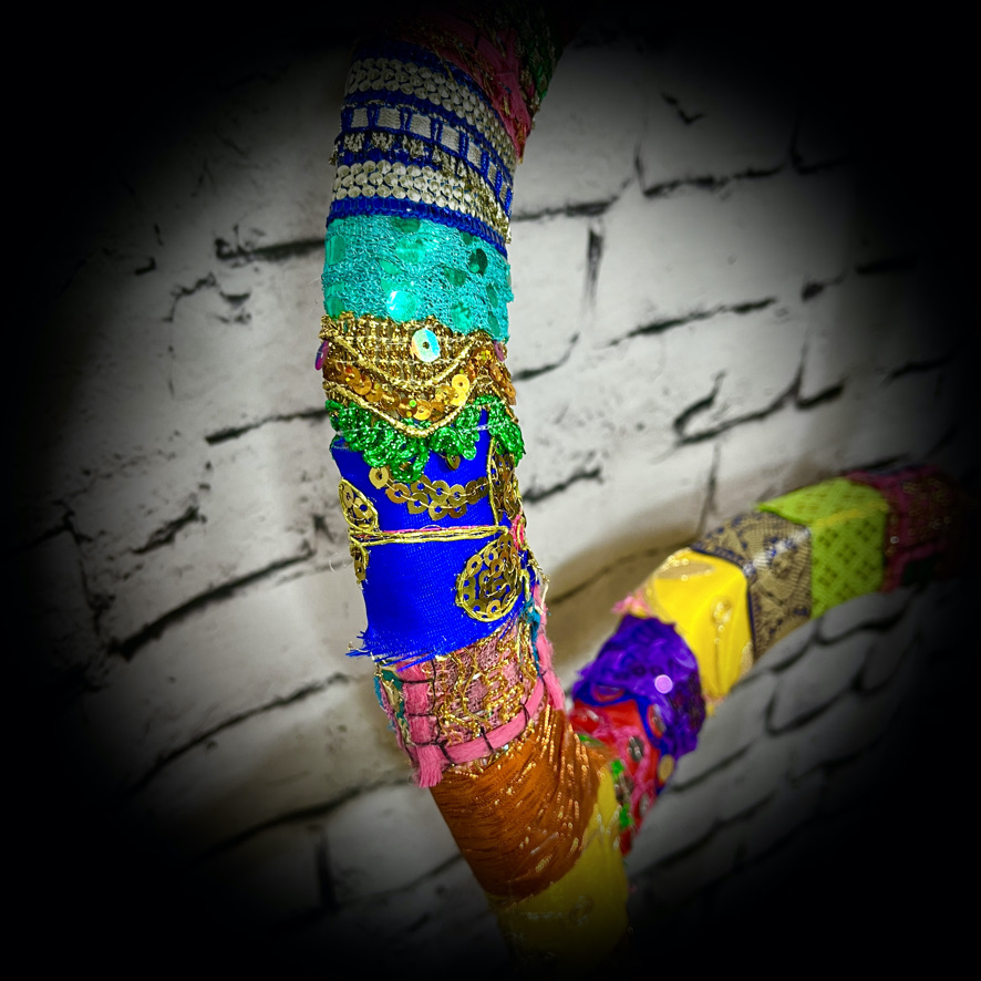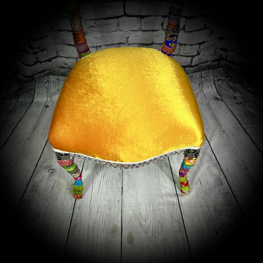 This stylish chair has been rescued from a trip to the landfill and given a colourful ribbon-wrapped makeover and re-upholstered seat to make a wow-factor and functional piece of furniture.