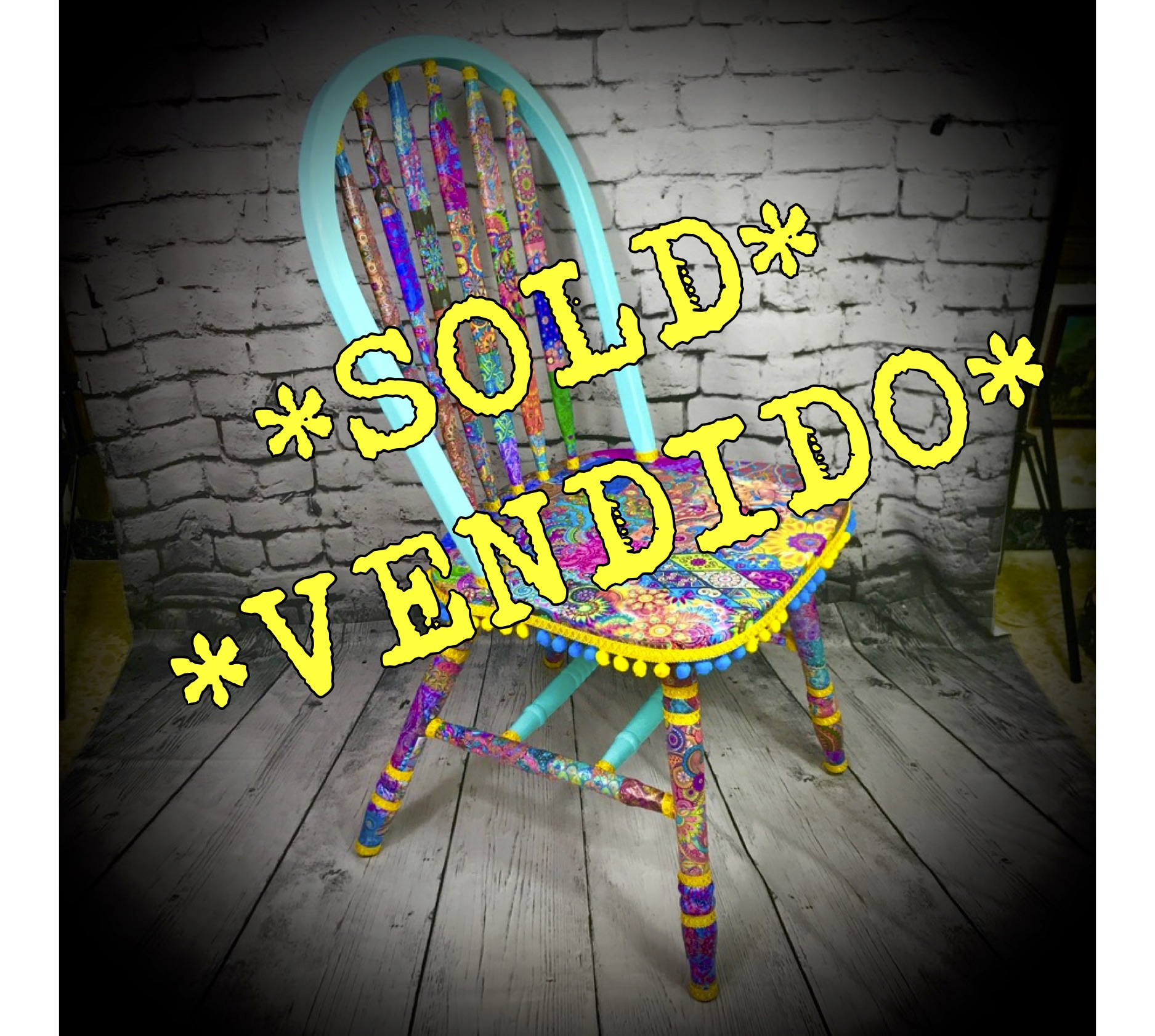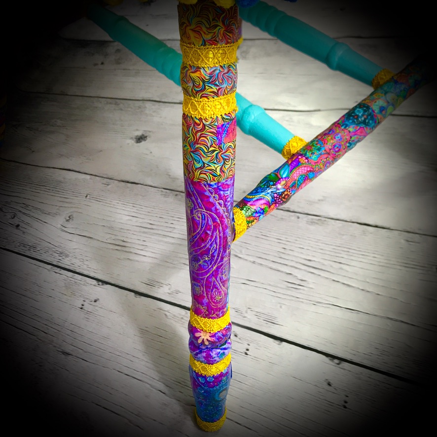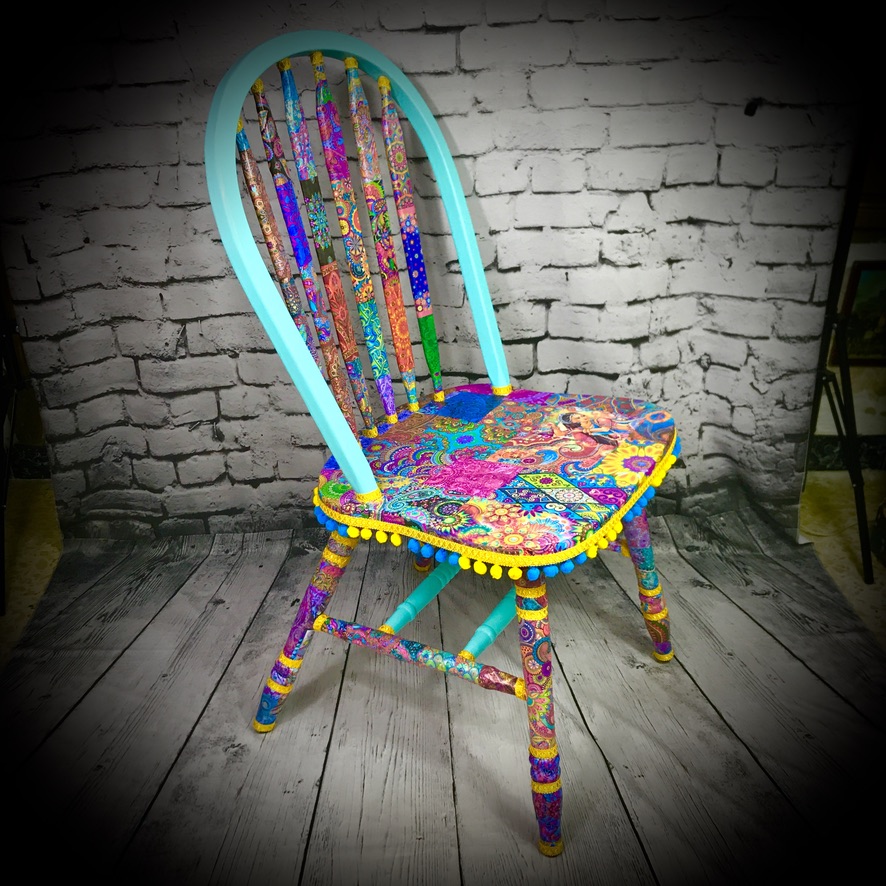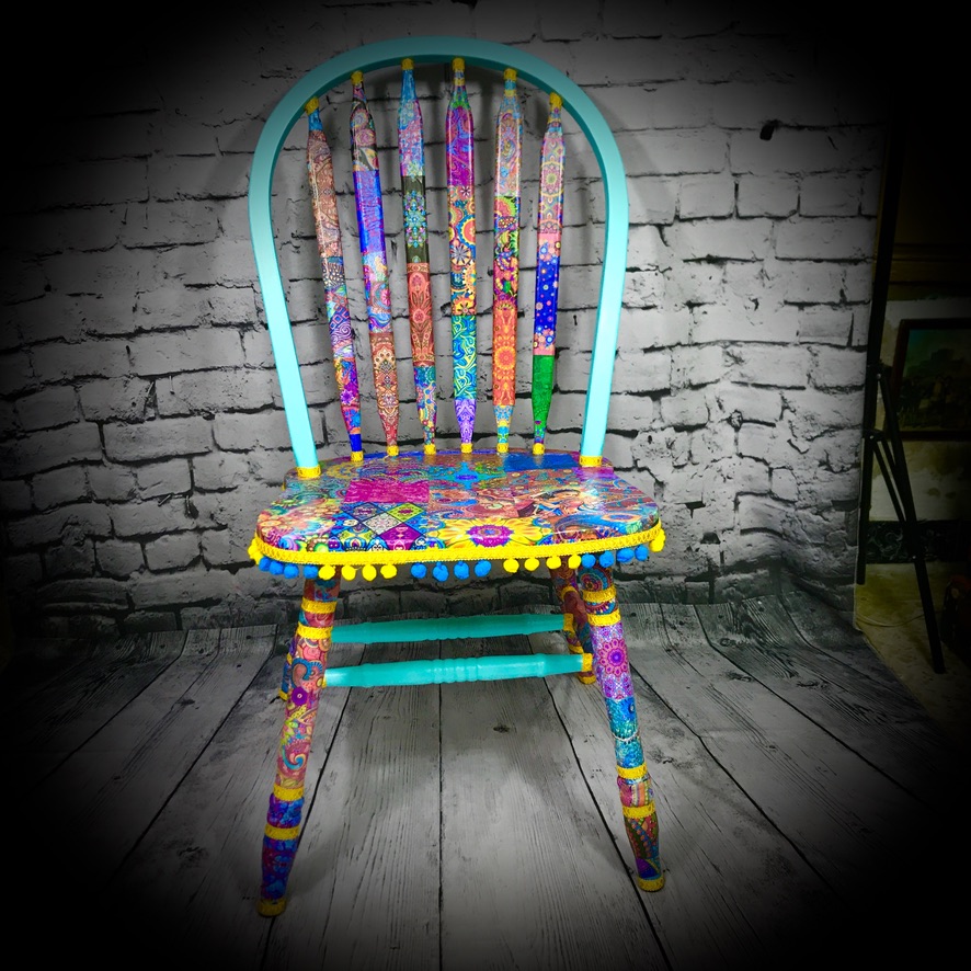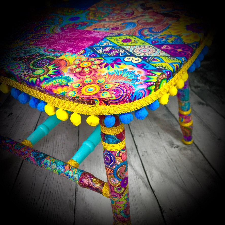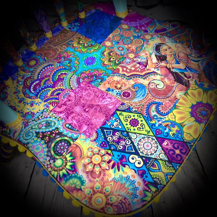 This solid, wooden chair has been given a “Bollywood” decoupaged makeover. Its still the functional piece of furniture it always was, its just now it has a real WOW! factor – bright and colourful!