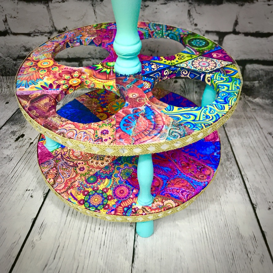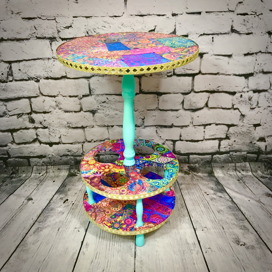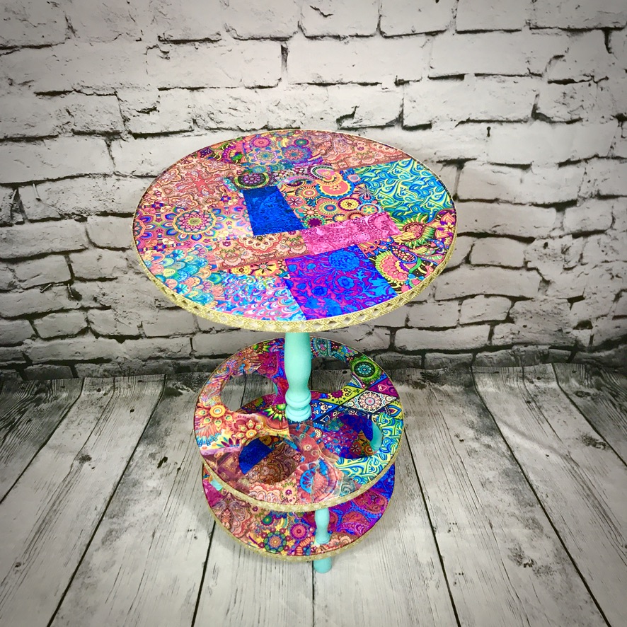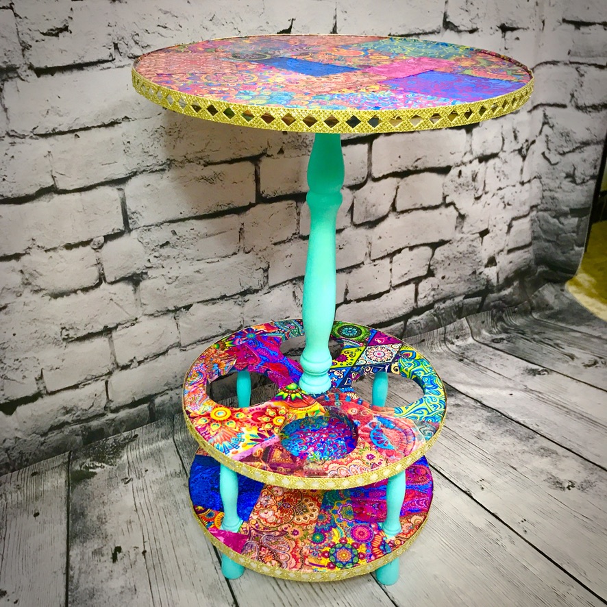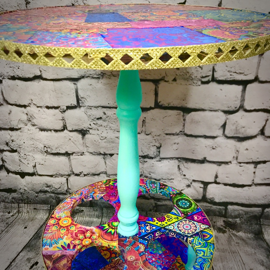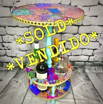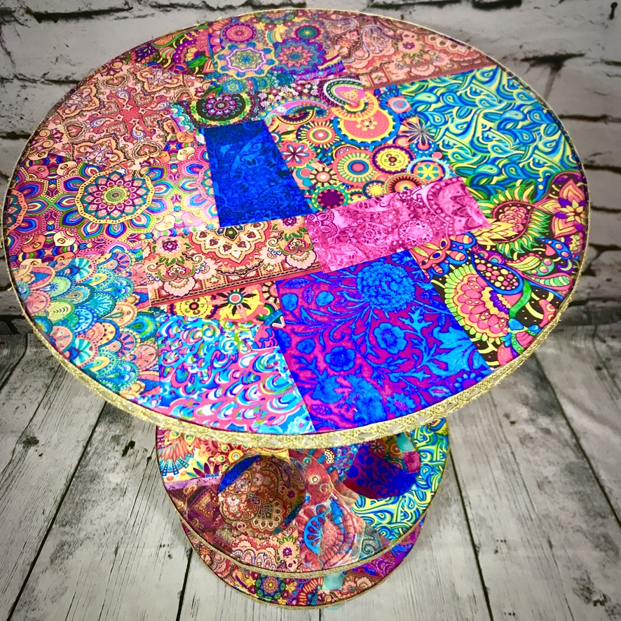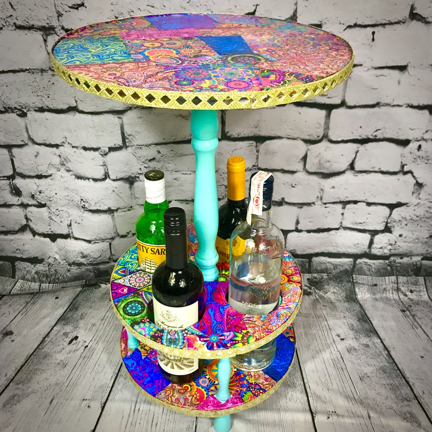 Something to brighten up our world in these tough times – a lovely round table with ‘storage’ for 4 bottles. Decorated in ‘bollywood’ style prints and trimmings. Just what you need to be prepared for a summer without restrictions!!!
