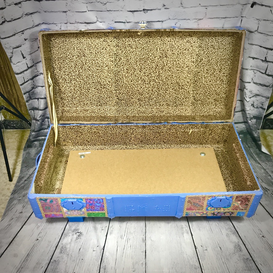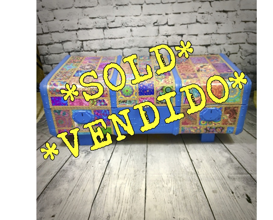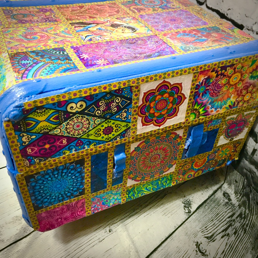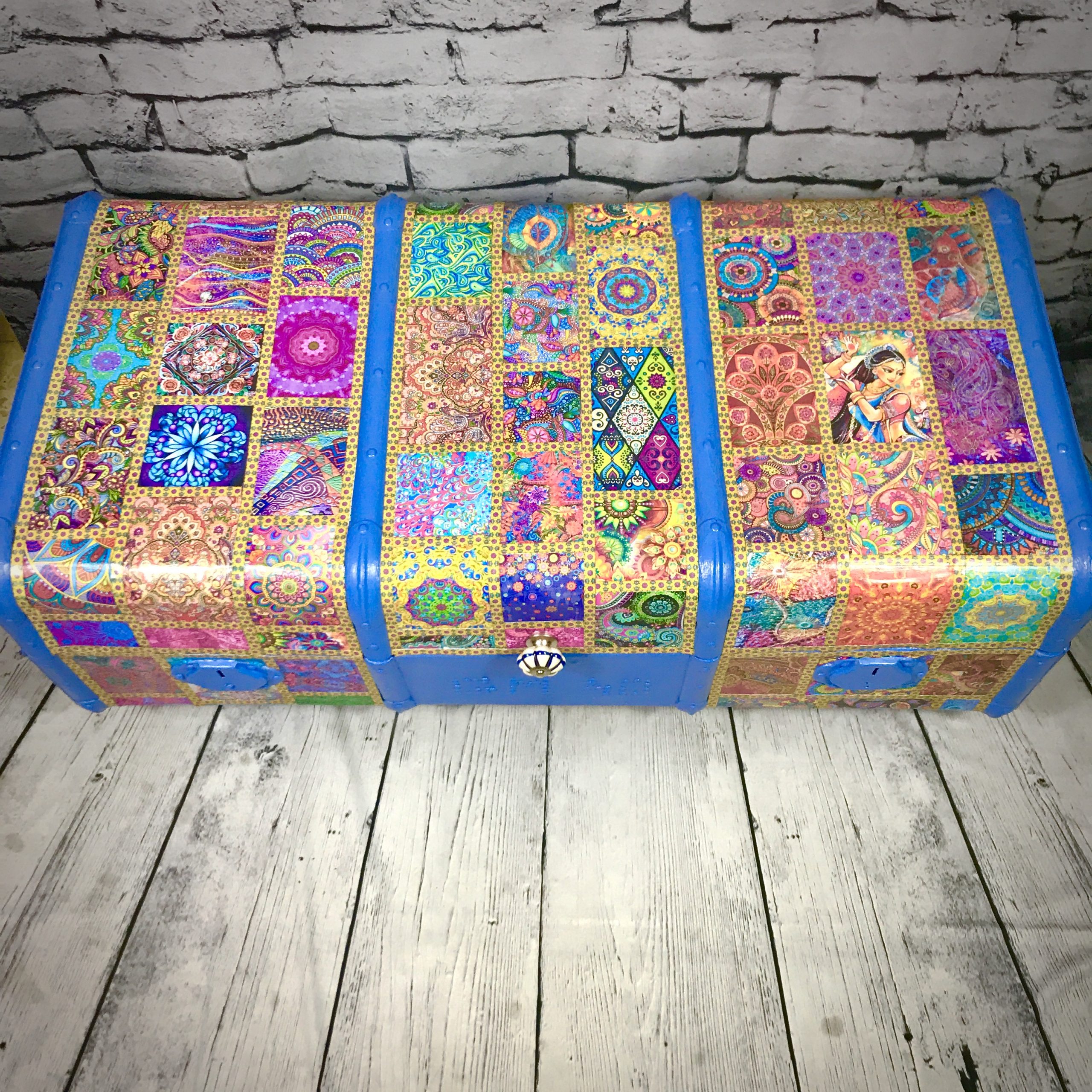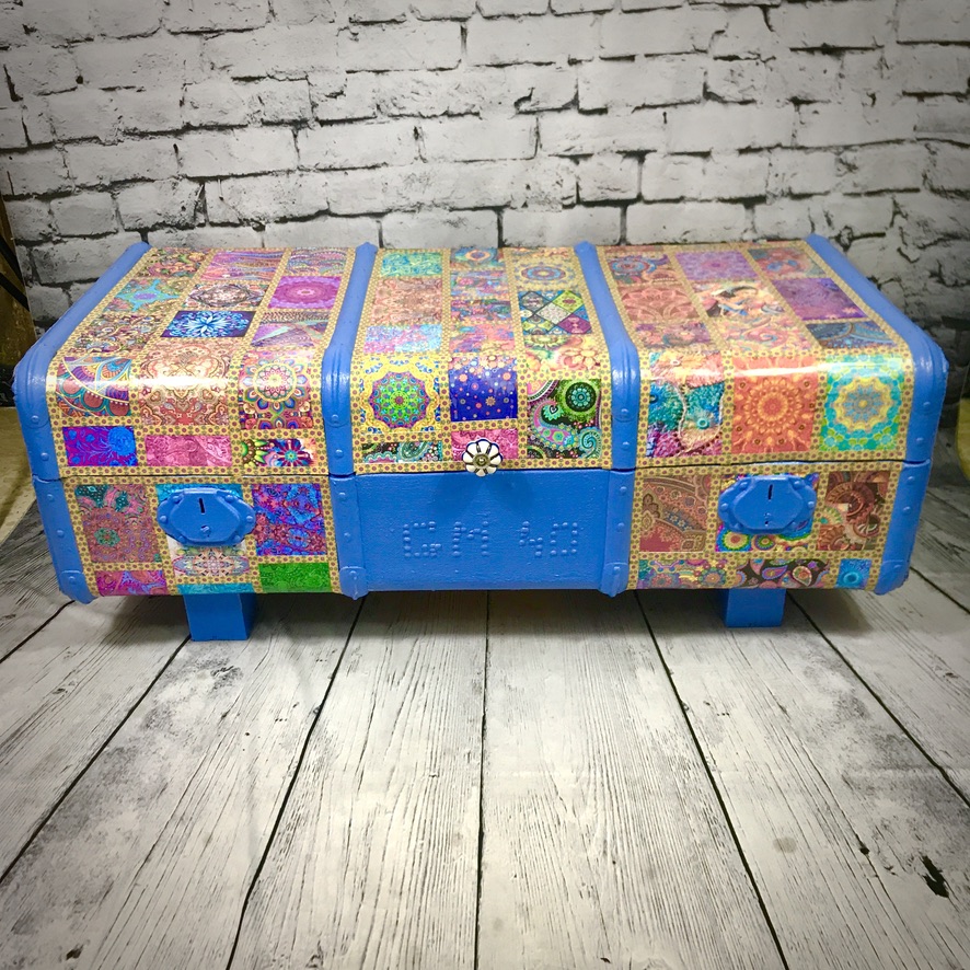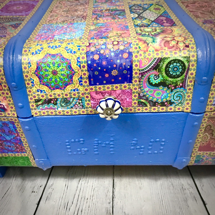 This old travel trunk has been given a bollywood-style makeover and now makes a bright and colourful addition to any home. The original initials and possibly year (40) have been left visible. The trunk has been coated with exterior varnish so could be used outside (although should not be left out in bad weather) – it could be used to hold towels for a swimming pool for instance.