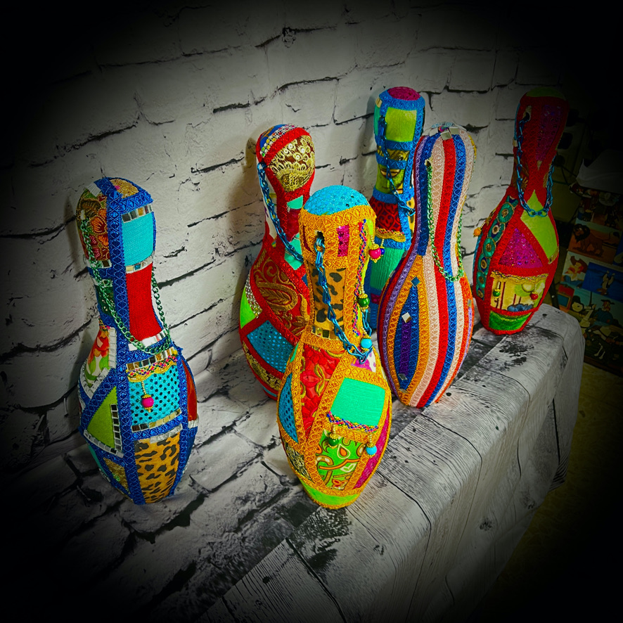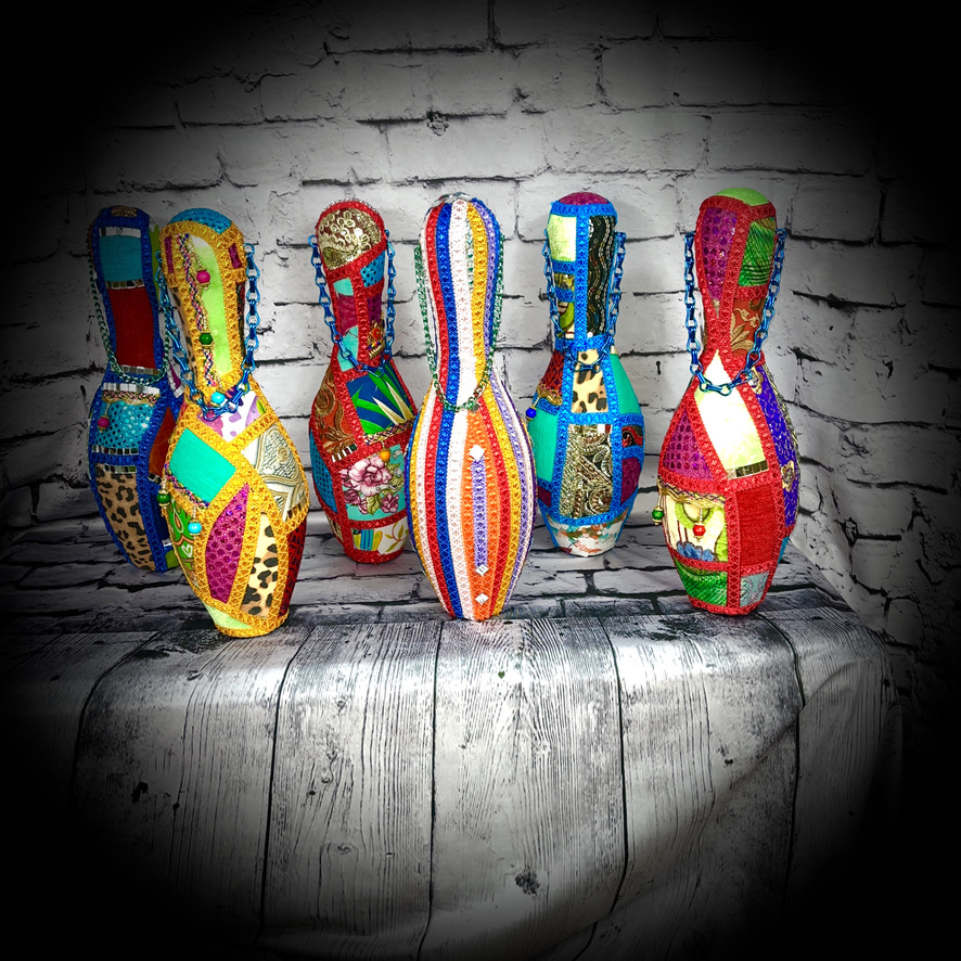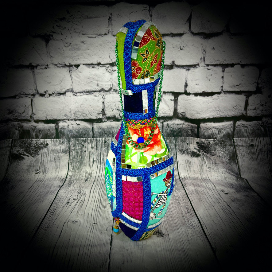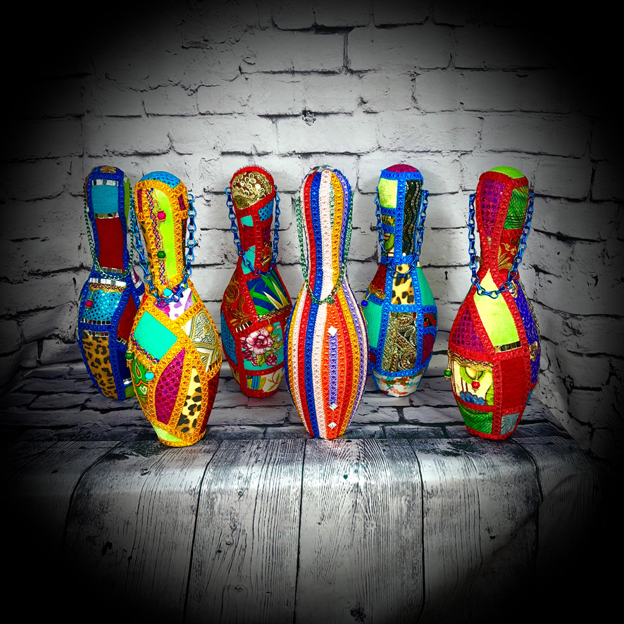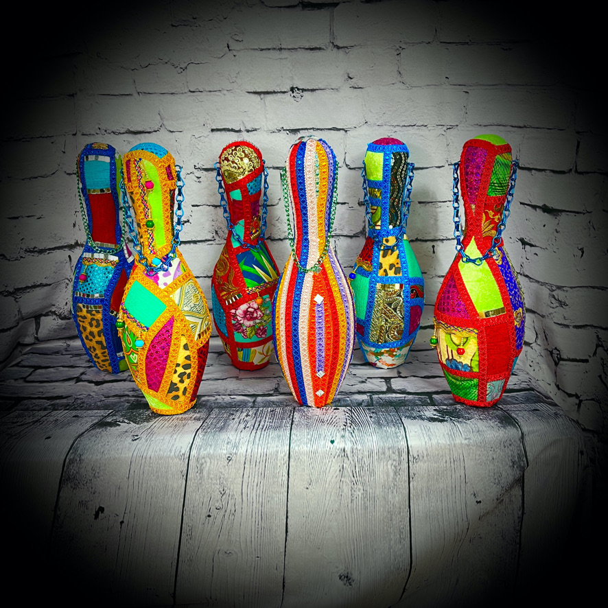 These bowling pins have been decorated to make colourful, eye-catching doorstops! They stand 38cms tall and have a carrying chain.