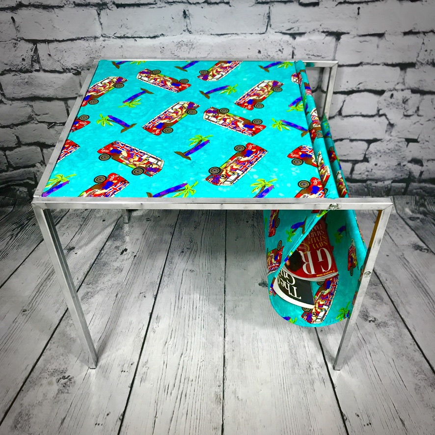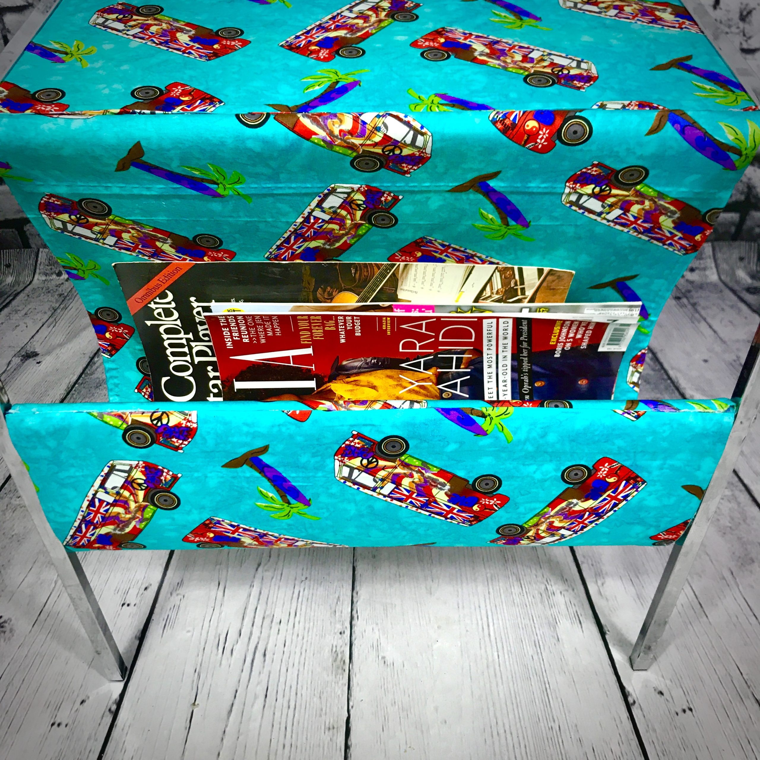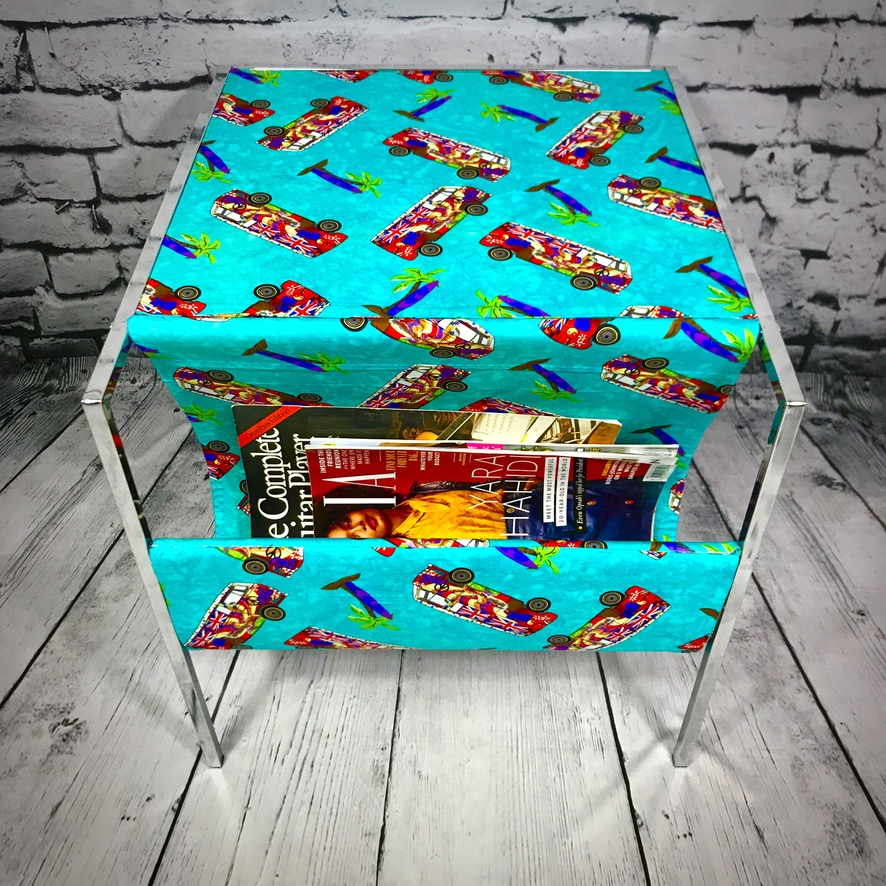 This side table and magazine rack with a chrome frame has been decorated with a ‘VW Minivan’ fabric to make a lively and practical piece of furniture!