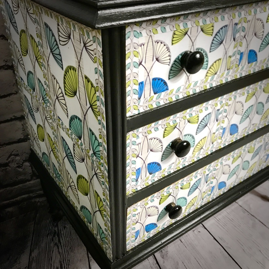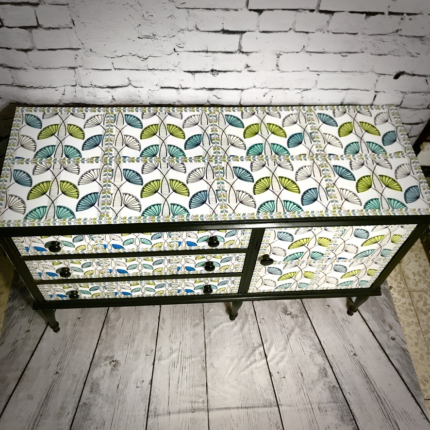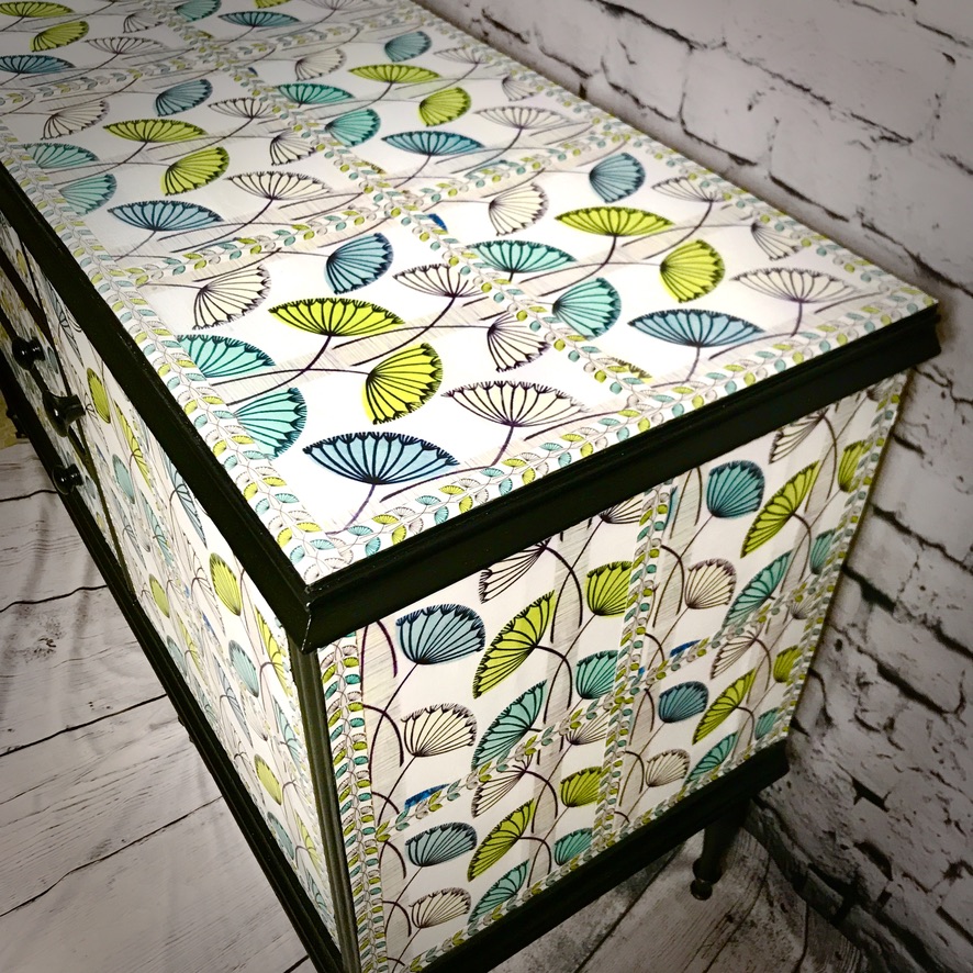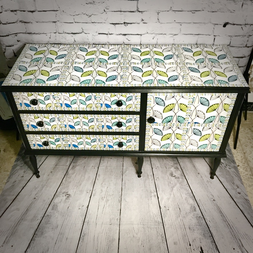 A very handsome and practical sideboard has been transformed from its original ‘dark brown’ into a very stylish, retro piece of furniture. It has been madeover with a ‘fifties’ style wallpaper print and black paintwork and now makes a completely unique piece of furniture.