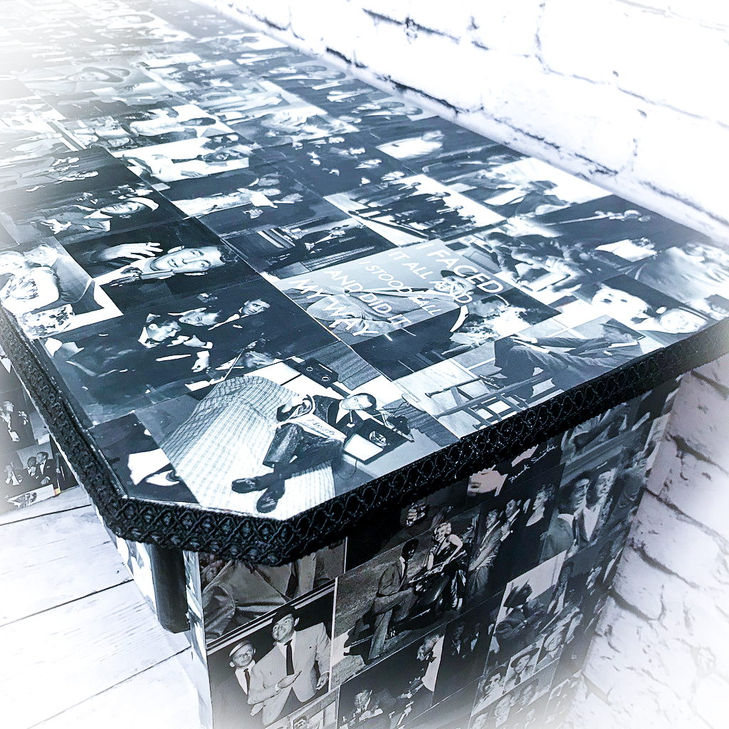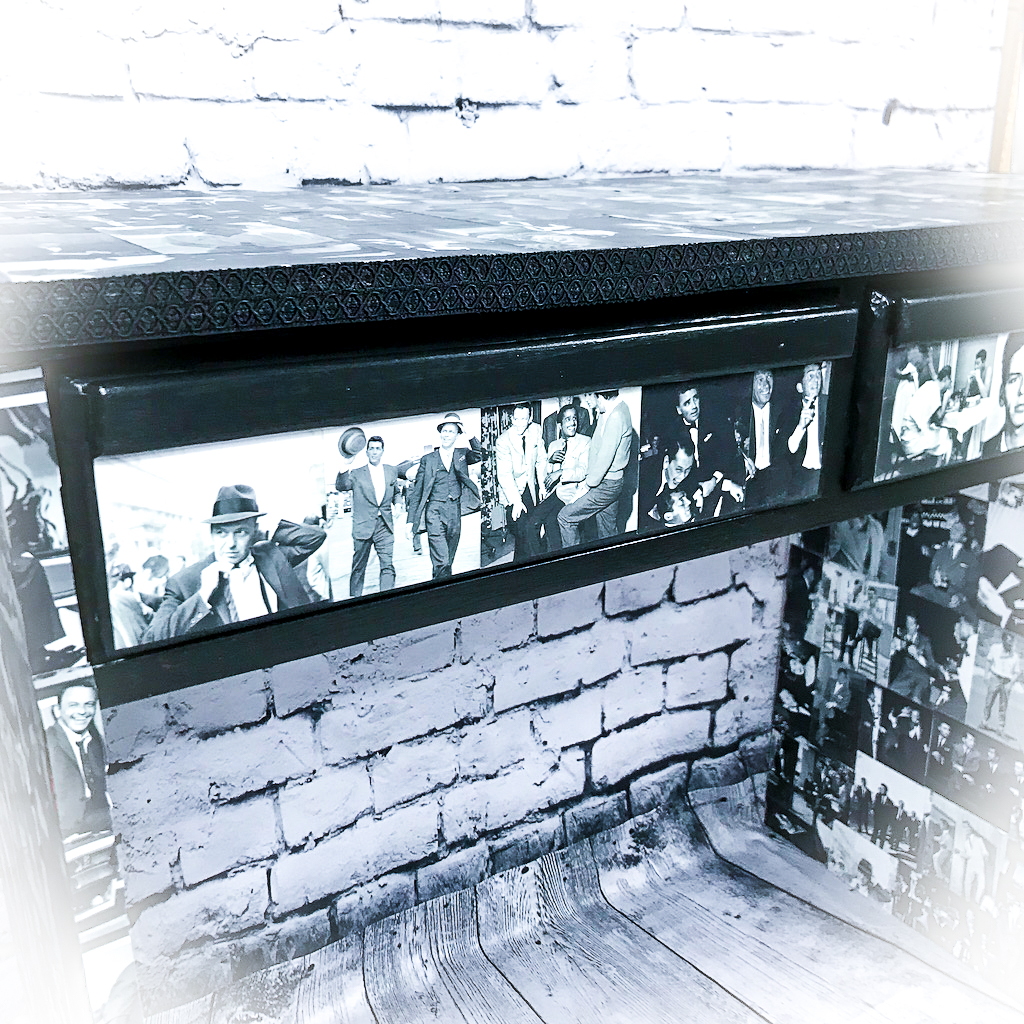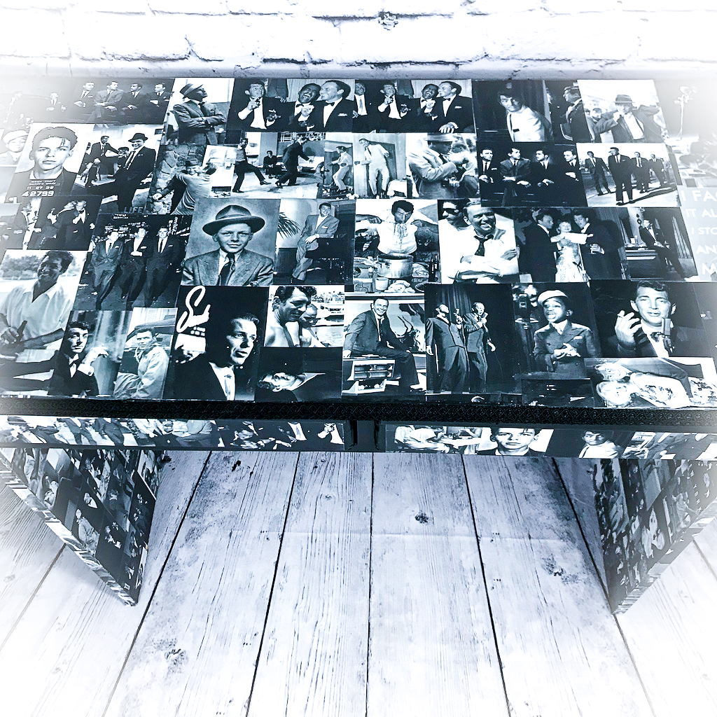 Decoupaged with black and white images of the iconic members of the “Rat Pack” (Sinatra, Martin, Davis Jnr) this now makes a real statement piece!