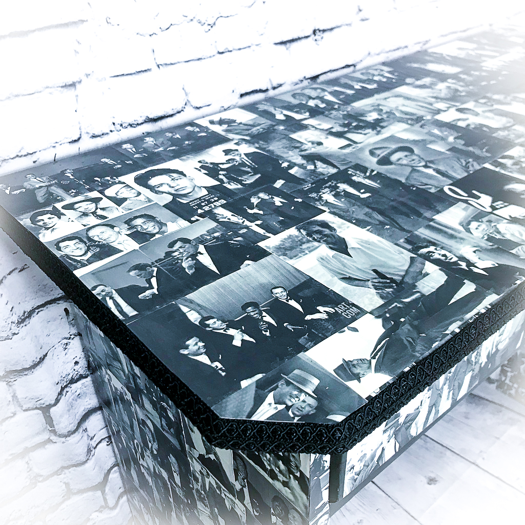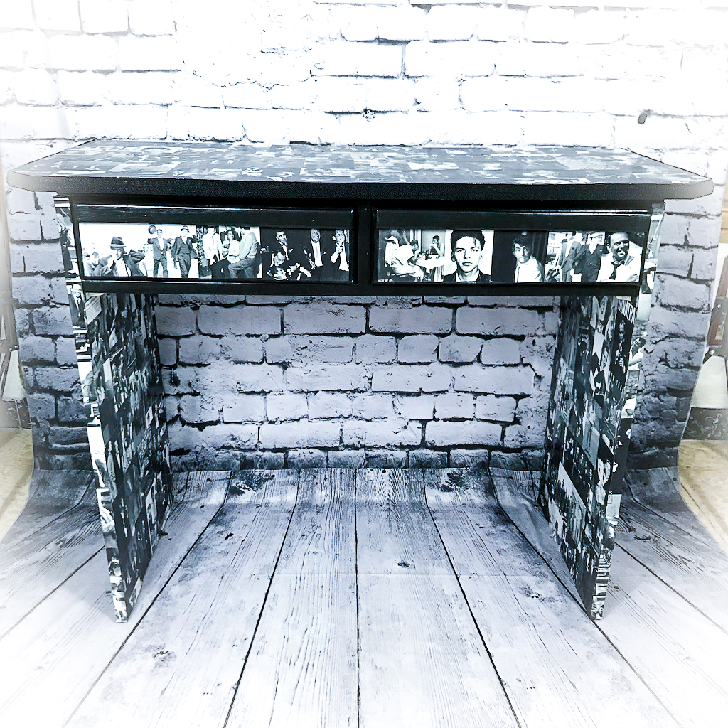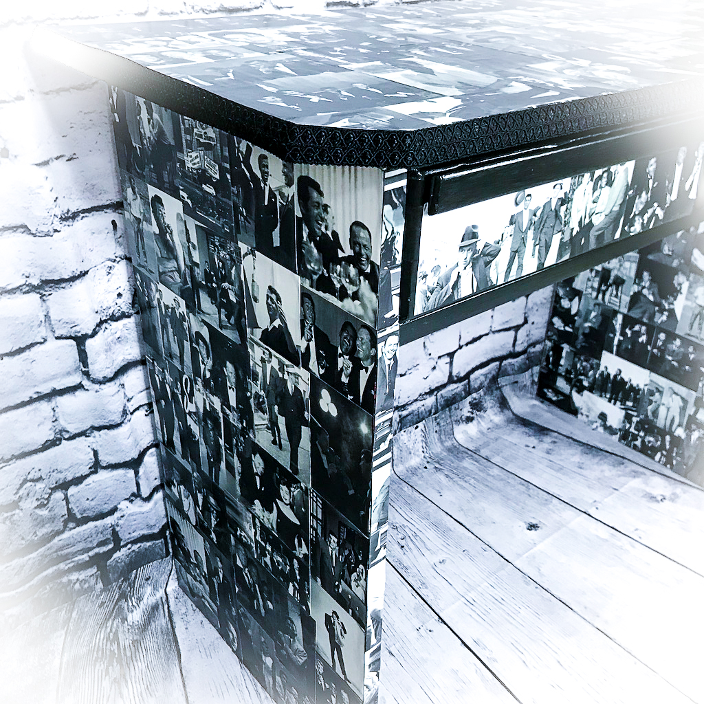 Decoupaged with black and white images of the iconic members of the “Rat Pack” (Sinatra, Martin, Davis Jnr) this now makes a real statement piece!