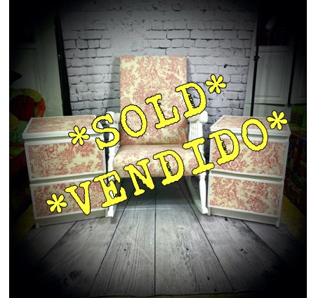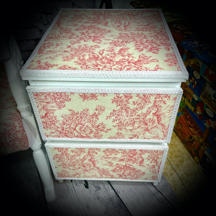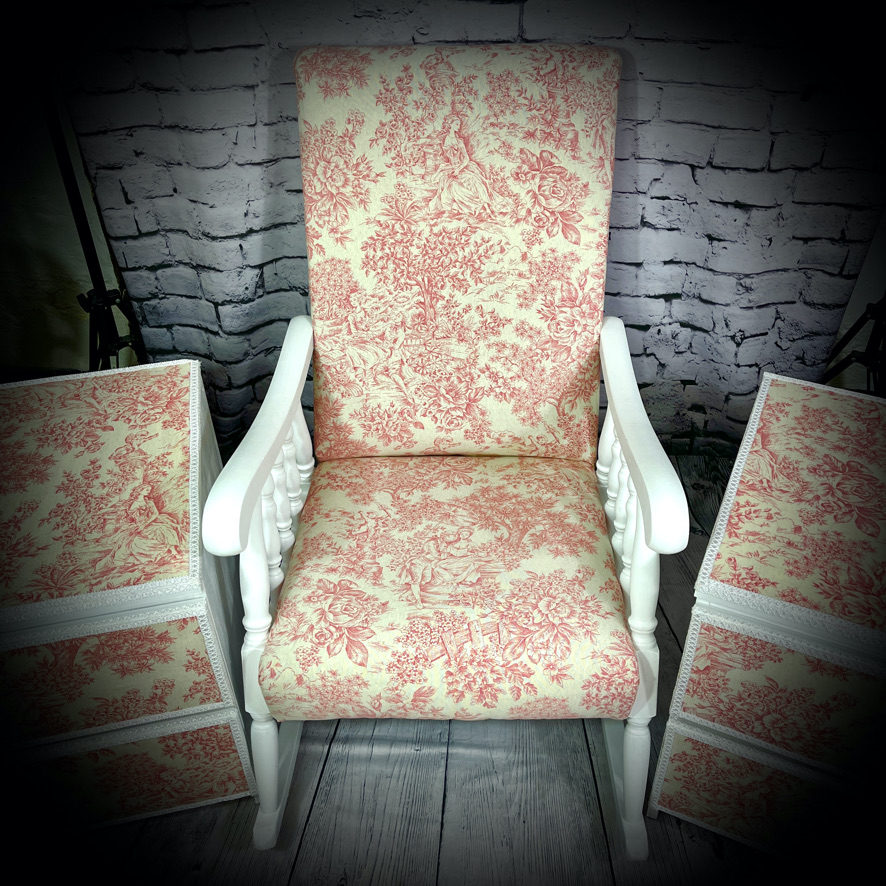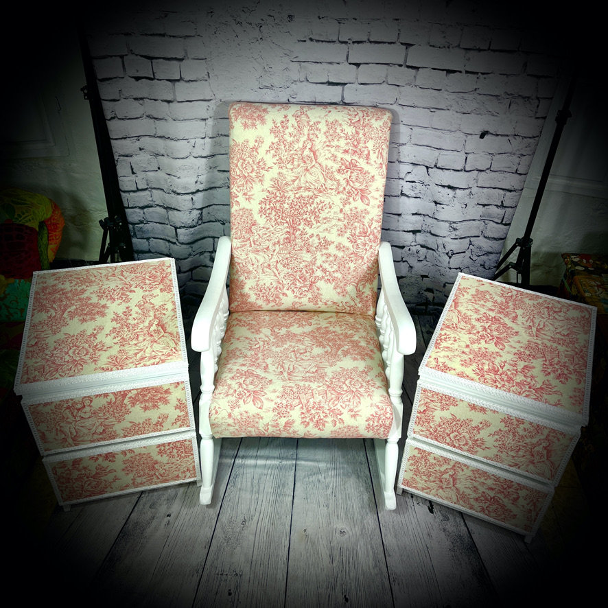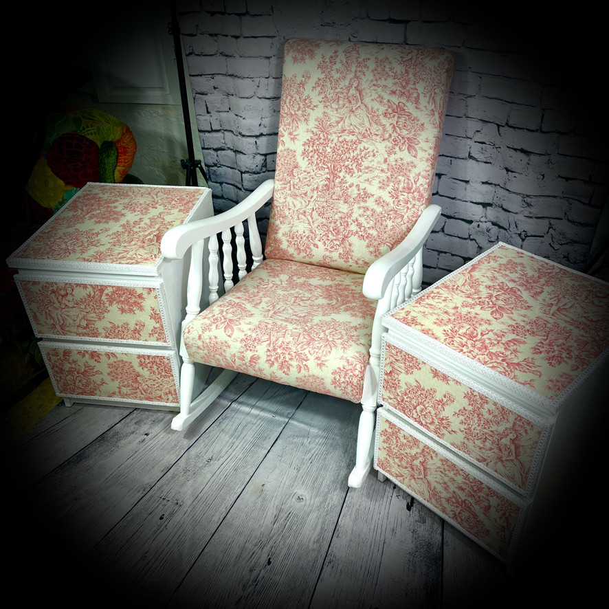 Upholstered and decoupaged in a classic pink and white ‘French’ print, this bedroom set of 2 bedside cabinets and a rocking chair will make a statement in any room or bedroom.