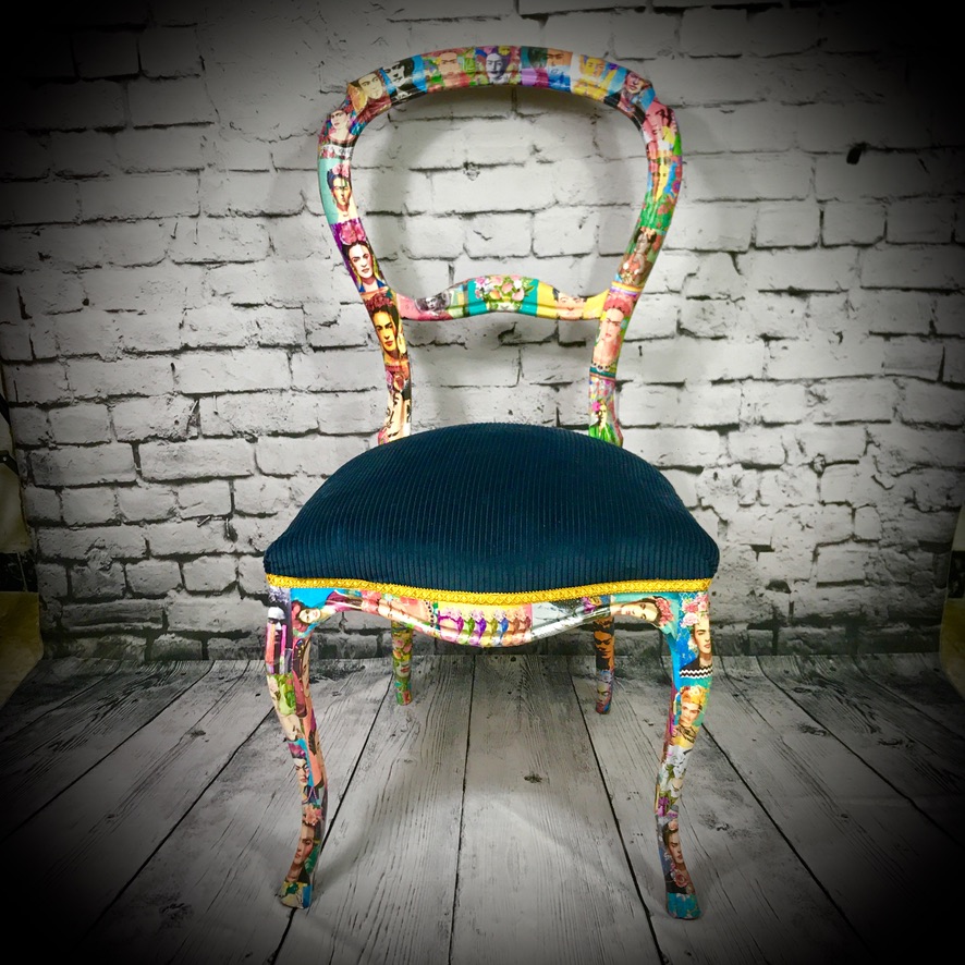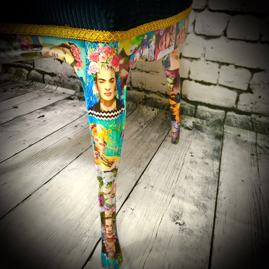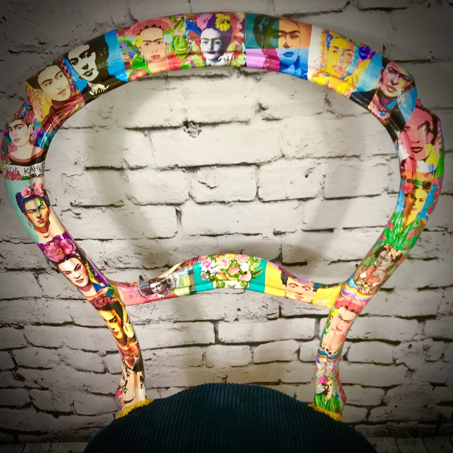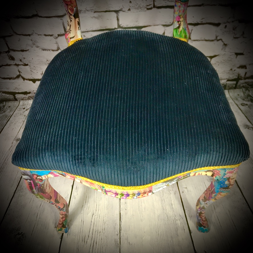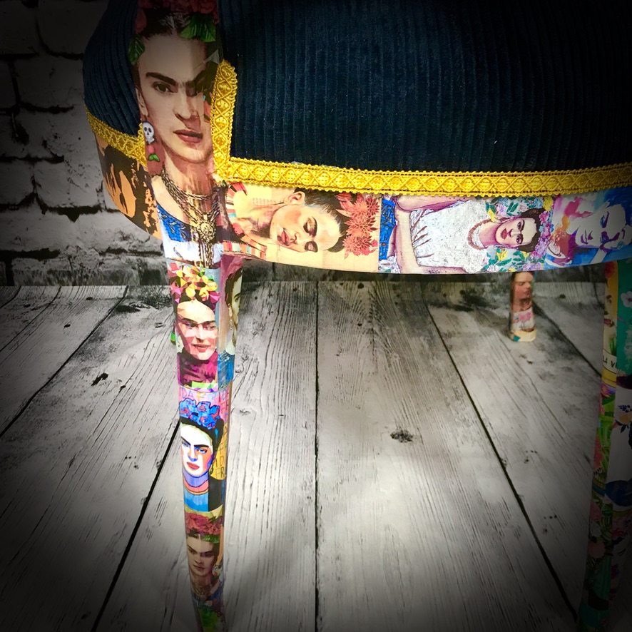 This very shapely chair has been re-upholstered in dark blue corduroy, decoupaged with images of Frida Kahlo and finished with gold trimming and now makes a stunning piece of furniture!