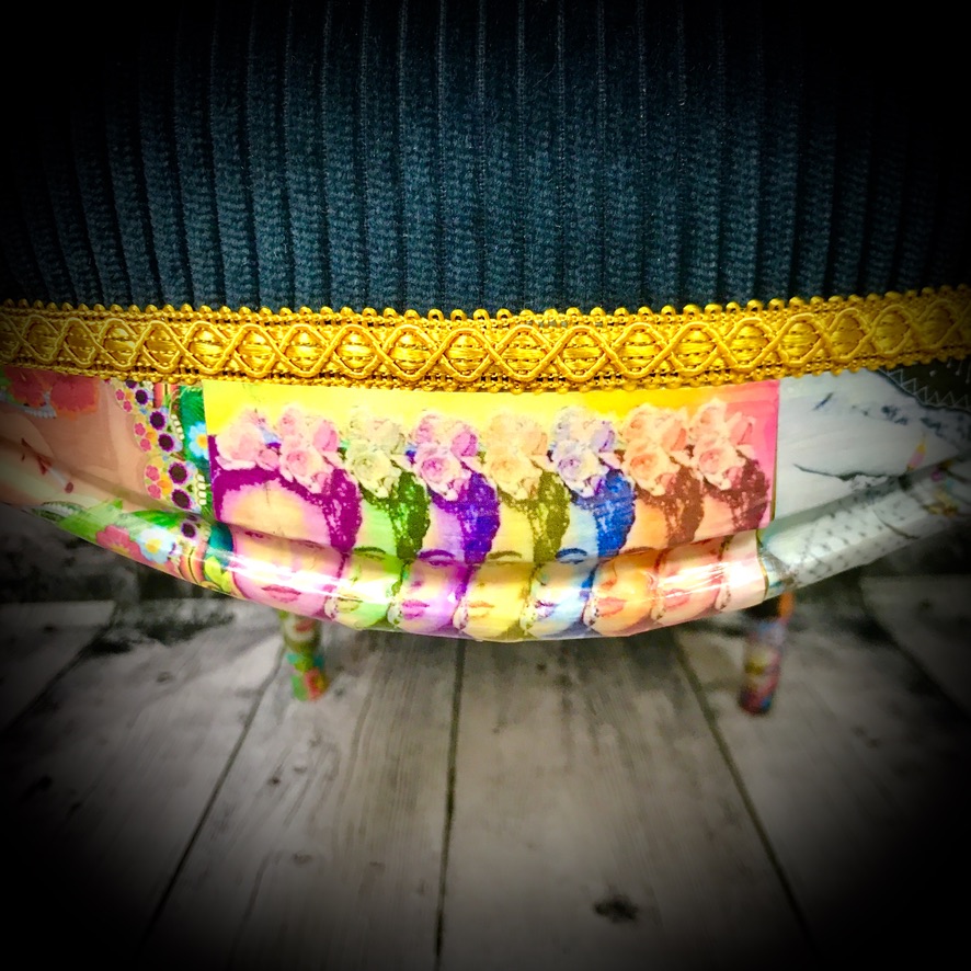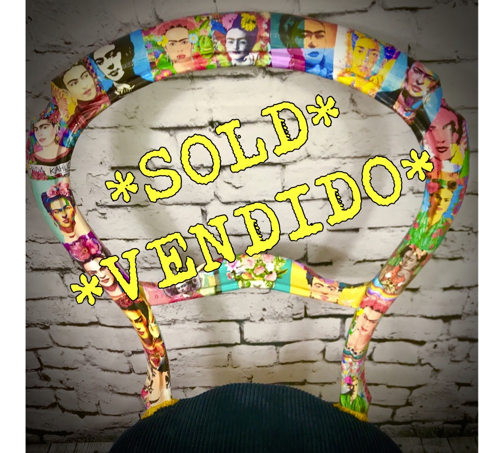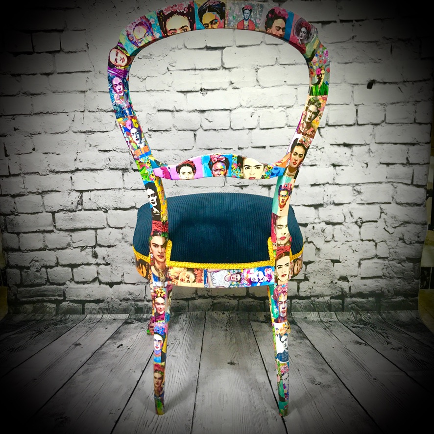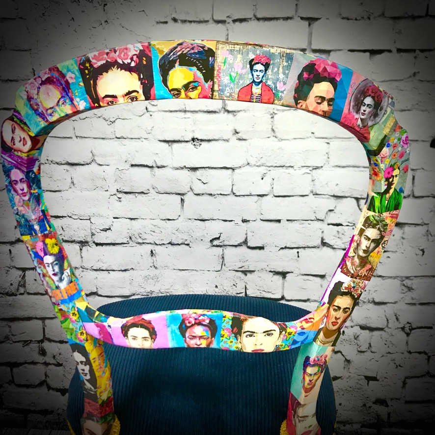 This very shapely chair has been re-upholstered in dark blue corduroy, decoupaged with images of Frida Kahlo and finished with gold trimming and now makes a stunning piece of furniture!