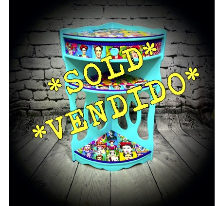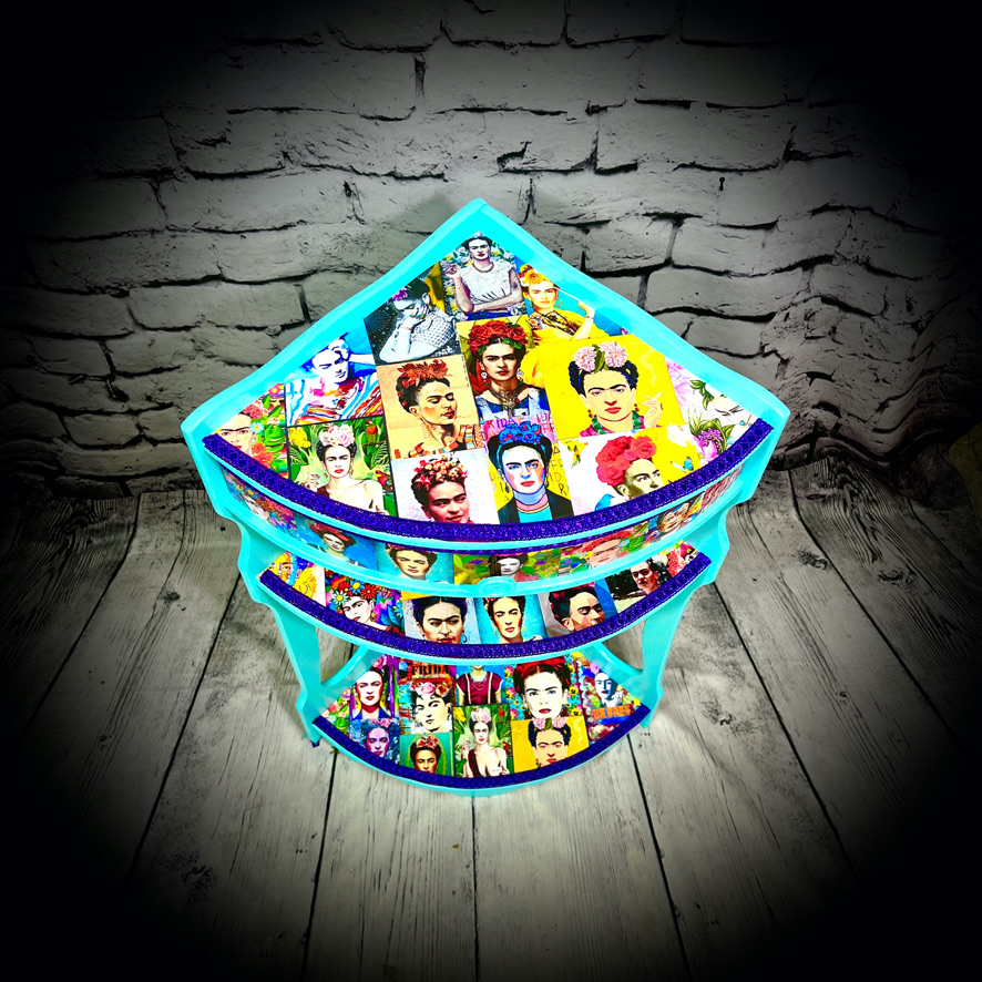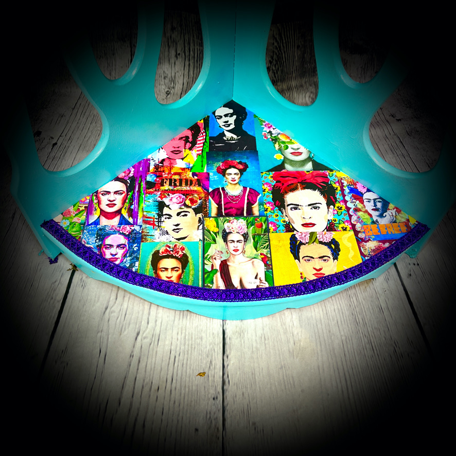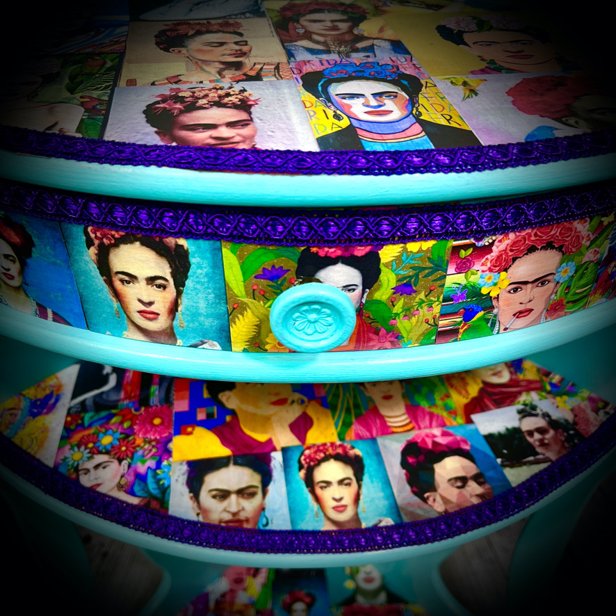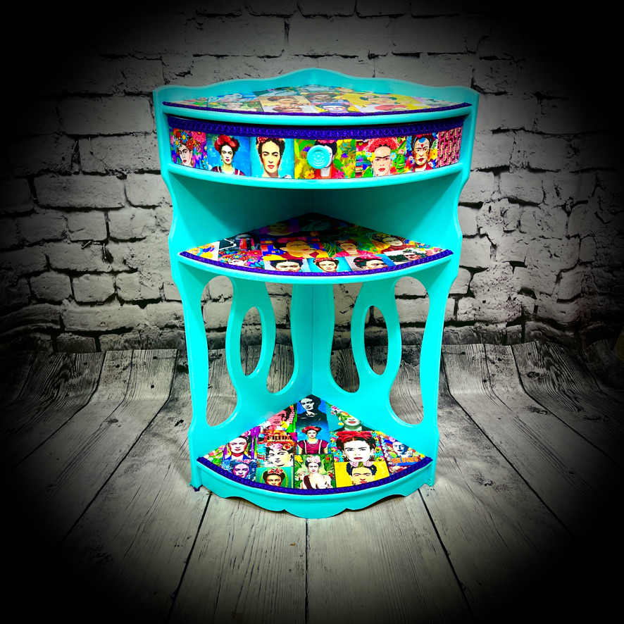 An unusual corner table, transformed from plain brown to being a tribute to Frida Kahlo.