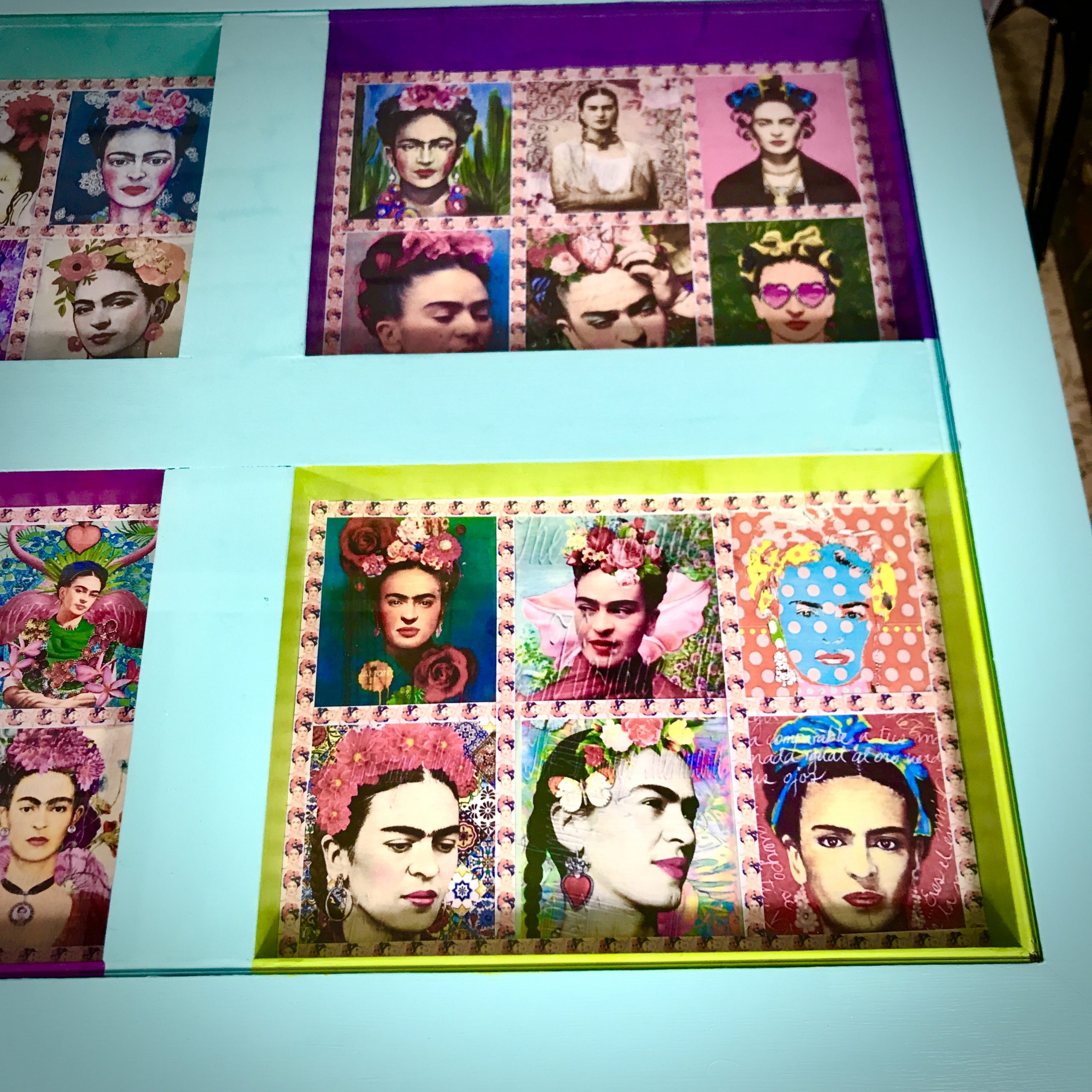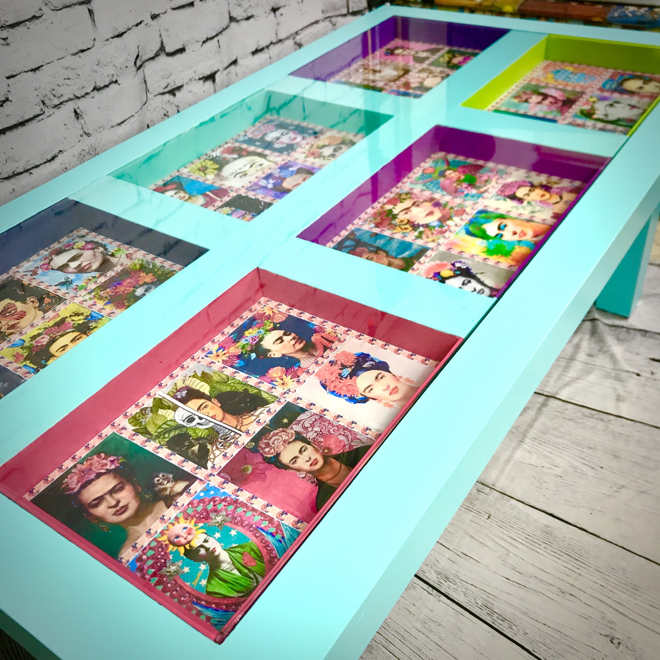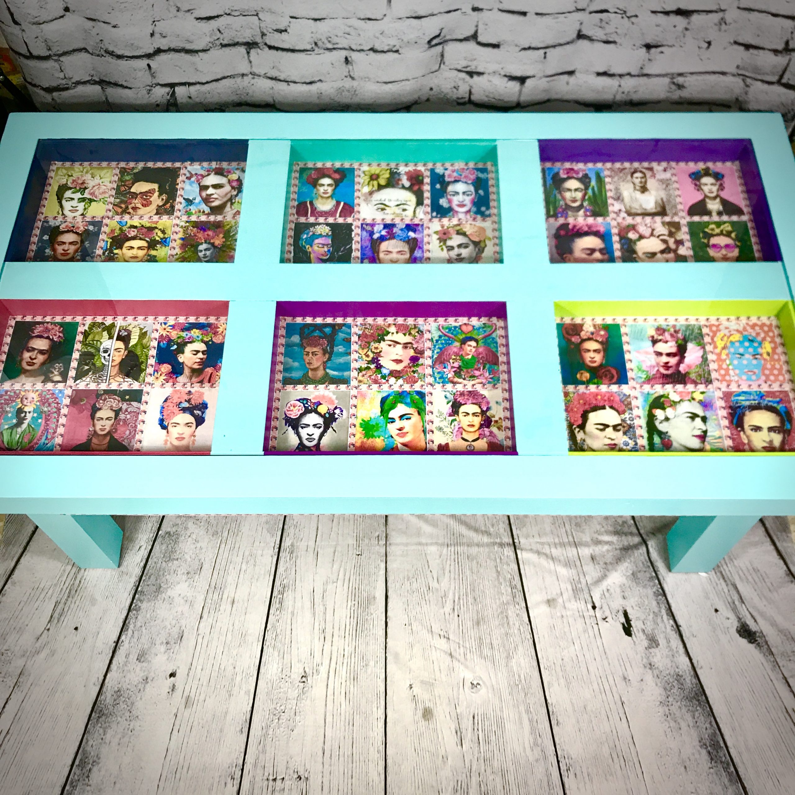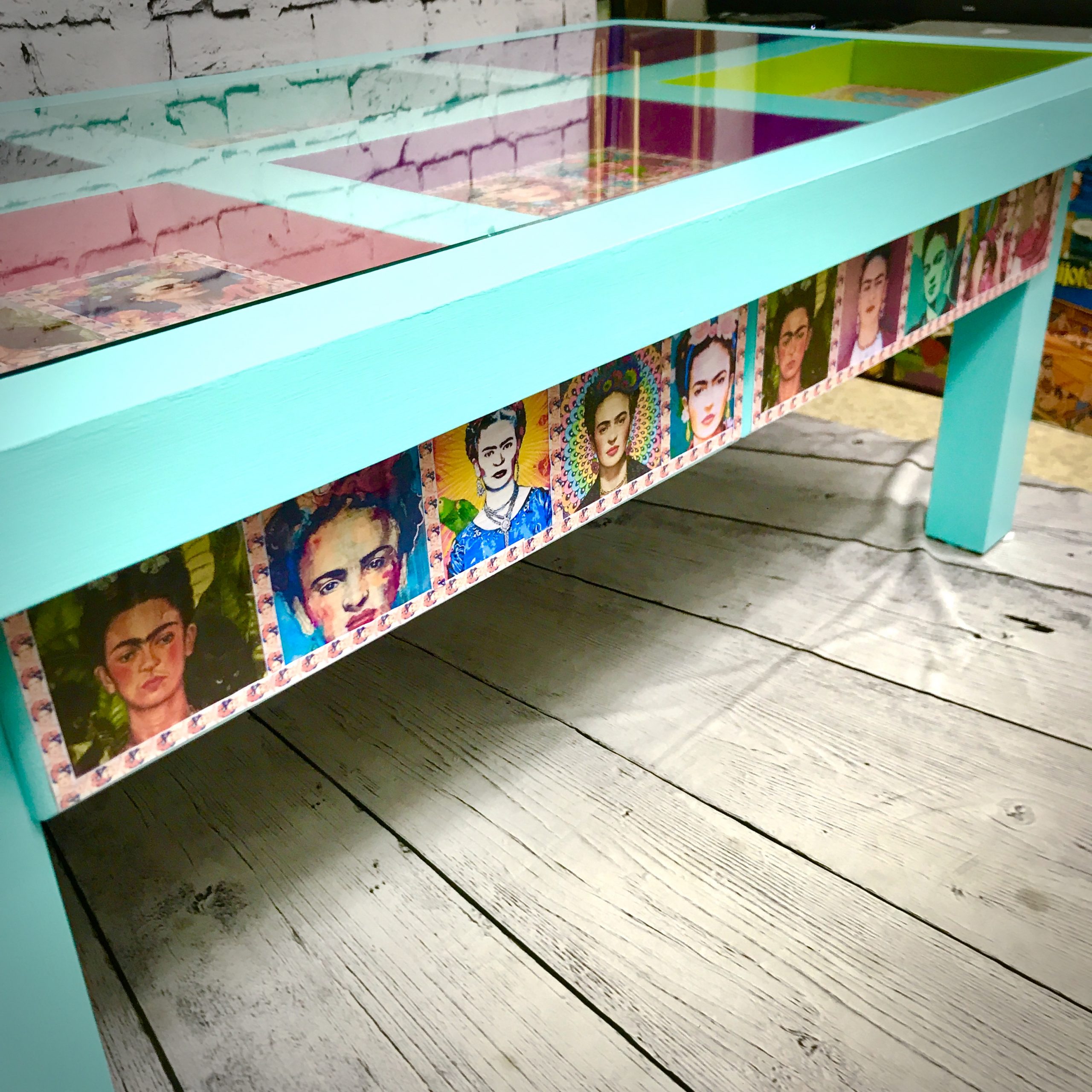 This extremely solid and large coffee table has been painted and decoupaged with Frida Kahlo images. Measuring 130 x 70 x 50 it is a truly standout piece of furniture, now given a unique twist. The table also has four drawers.