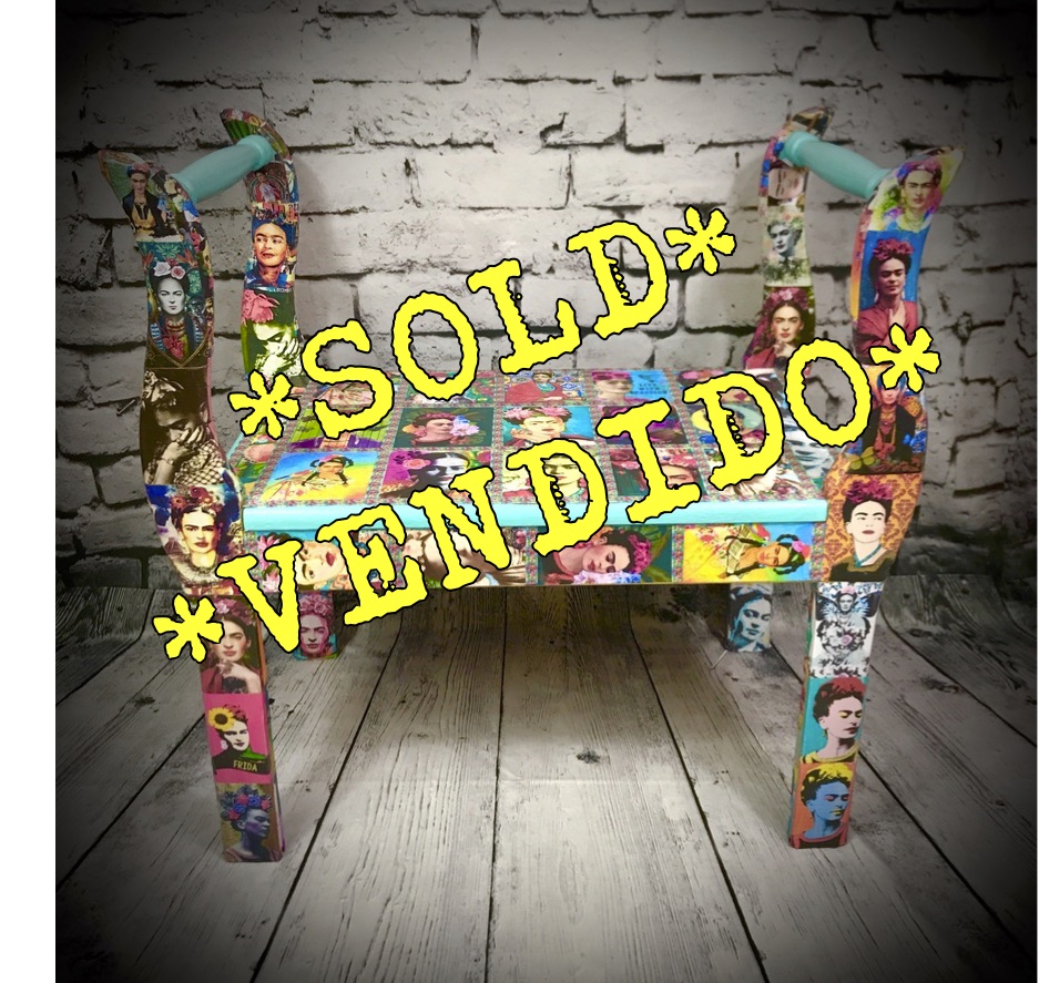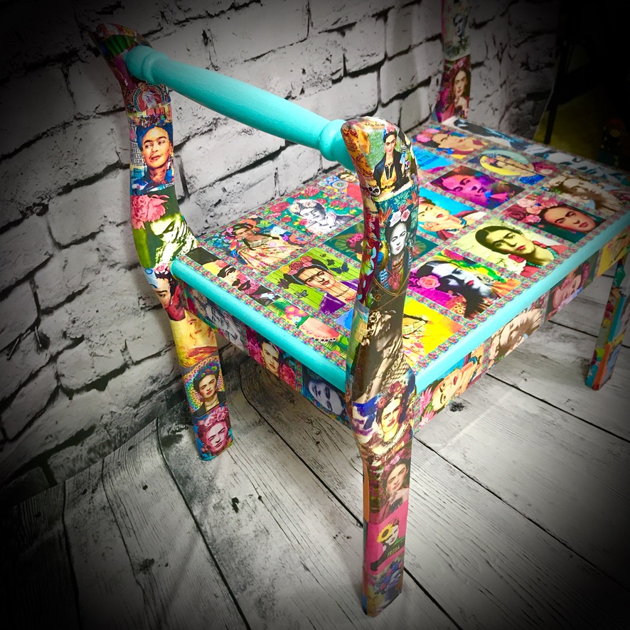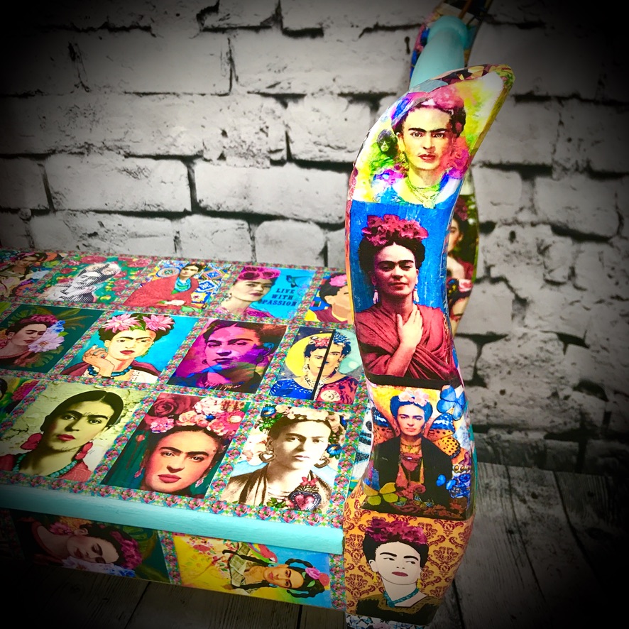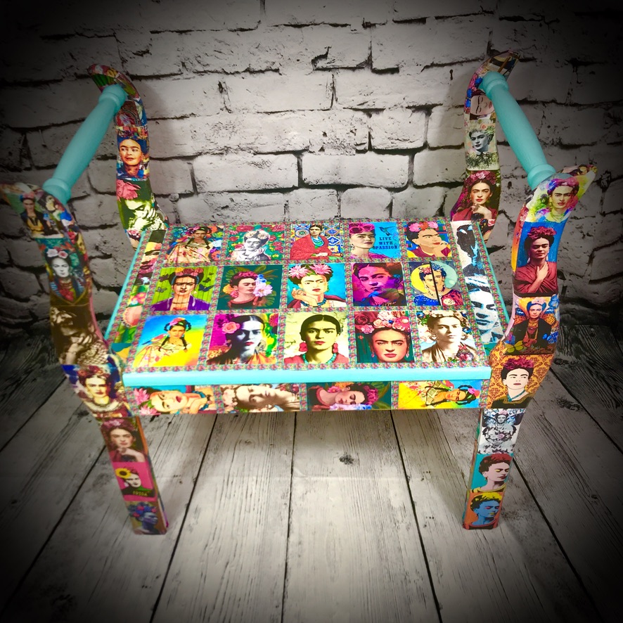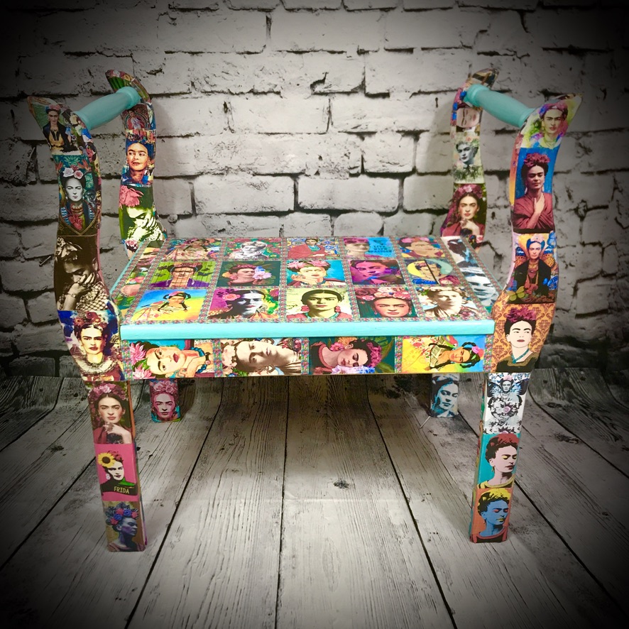 This wooden stool with side arms has been made over with decoupaged Frida Kahlo images and some bright paintwork to make a very handsome piece of furniture.