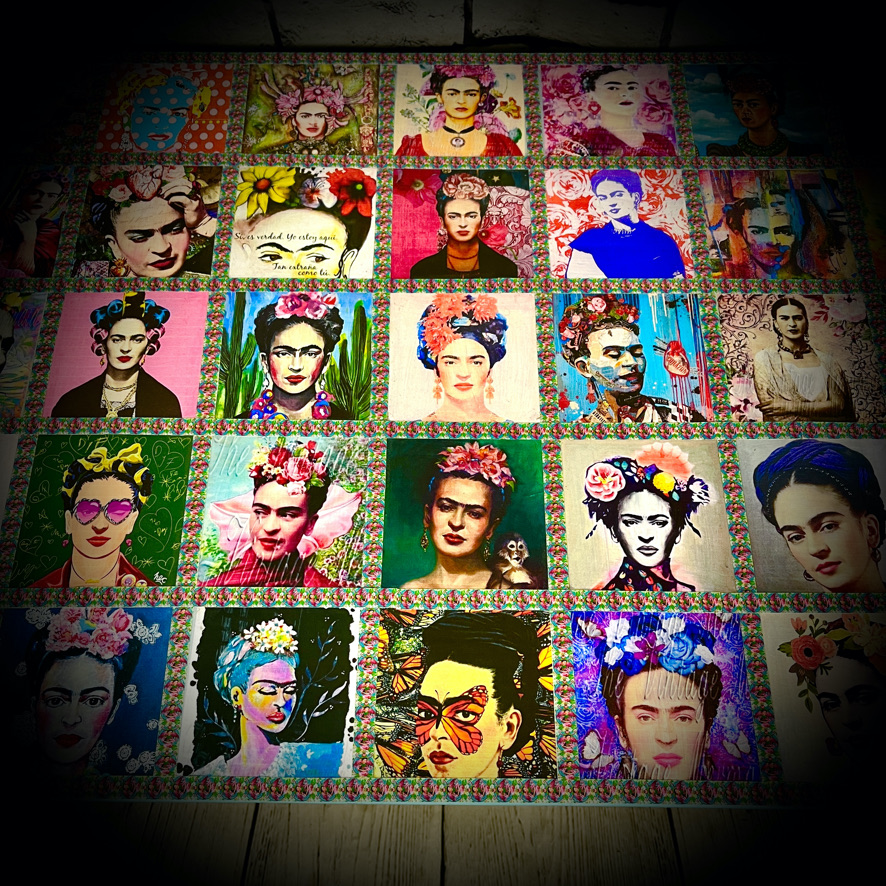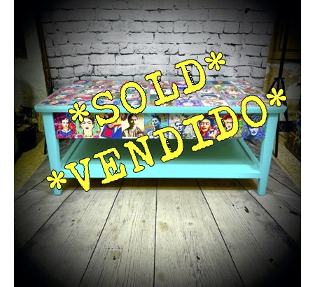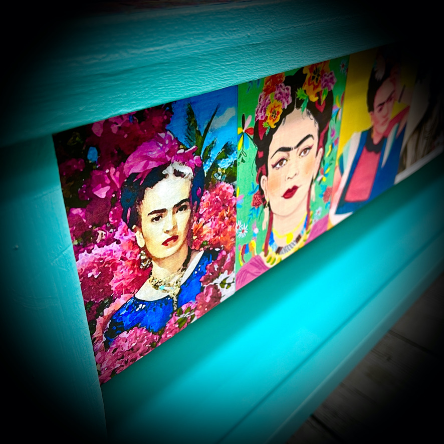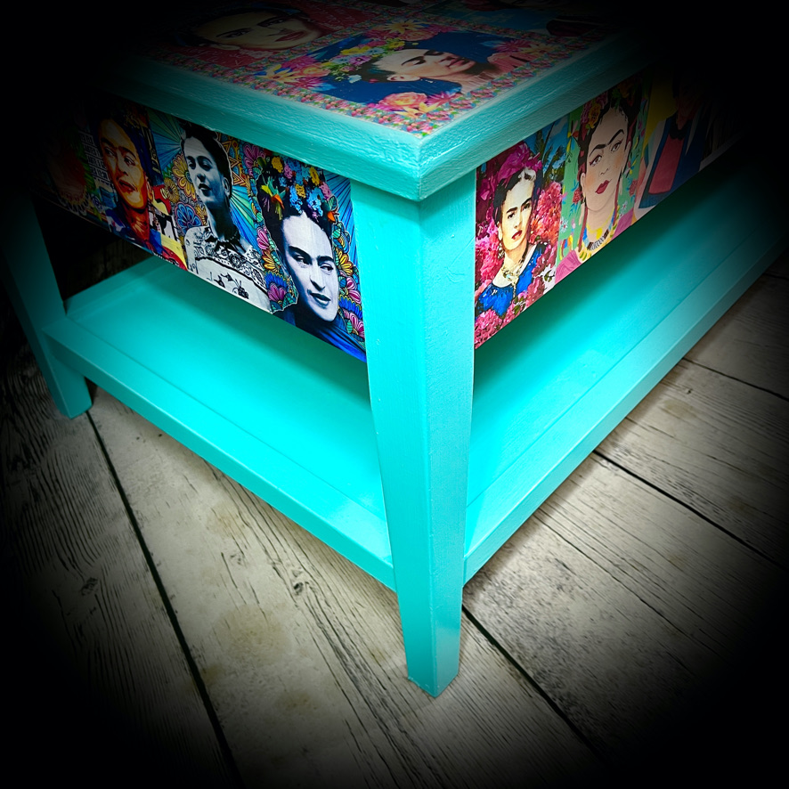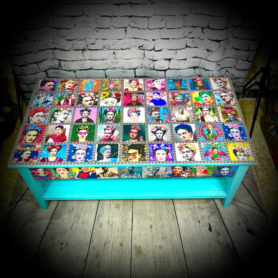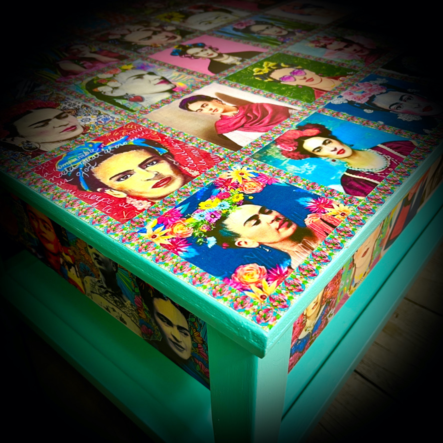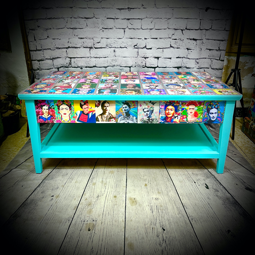 This large coffee table has been painted and decoupaged with images of the iconic Frida Kahlo.