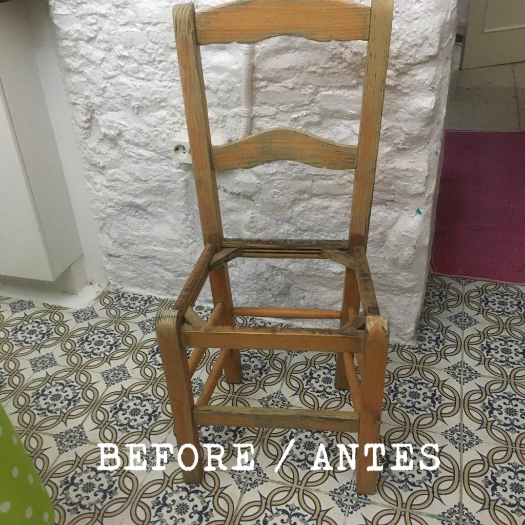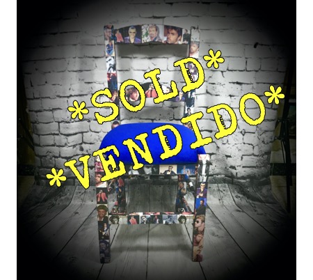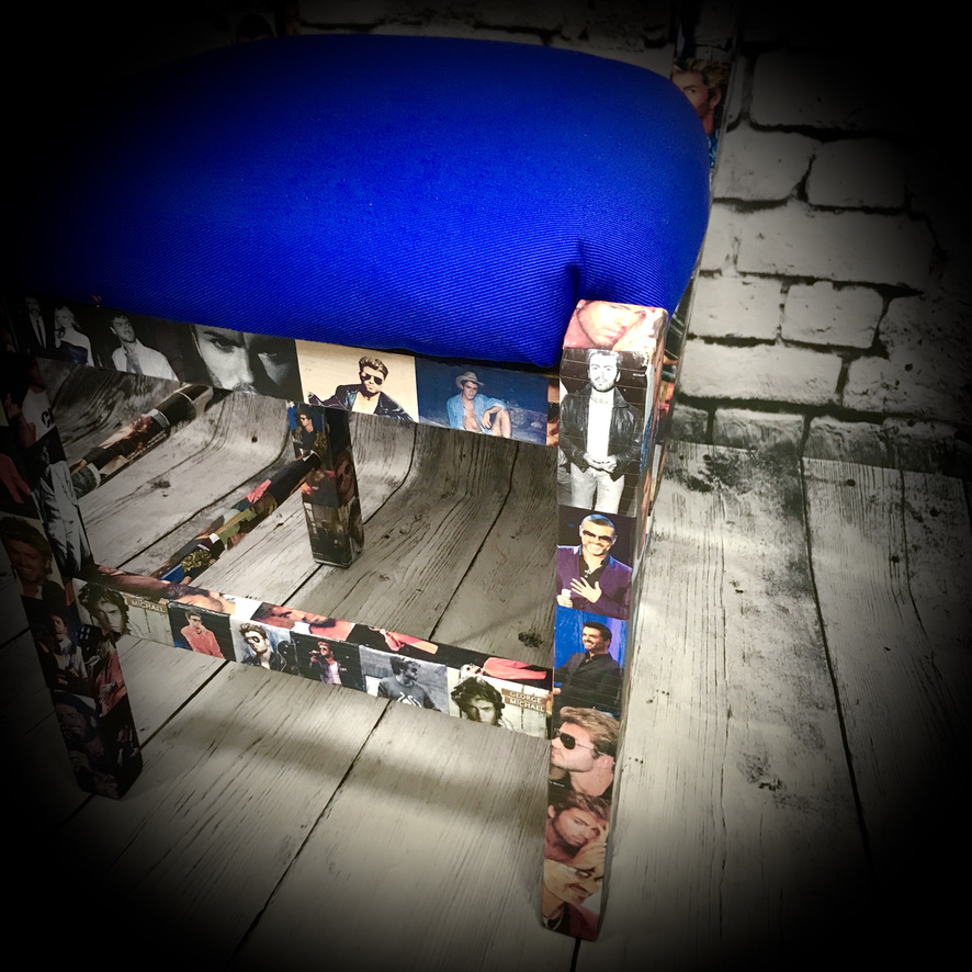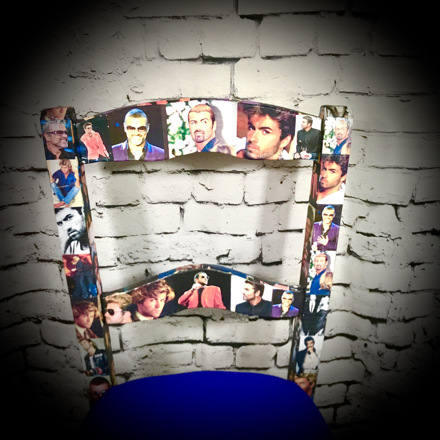 This solid wooden chair has been made over as a unique tribute to George Michael and given a cushioned seat covered in bright blue.