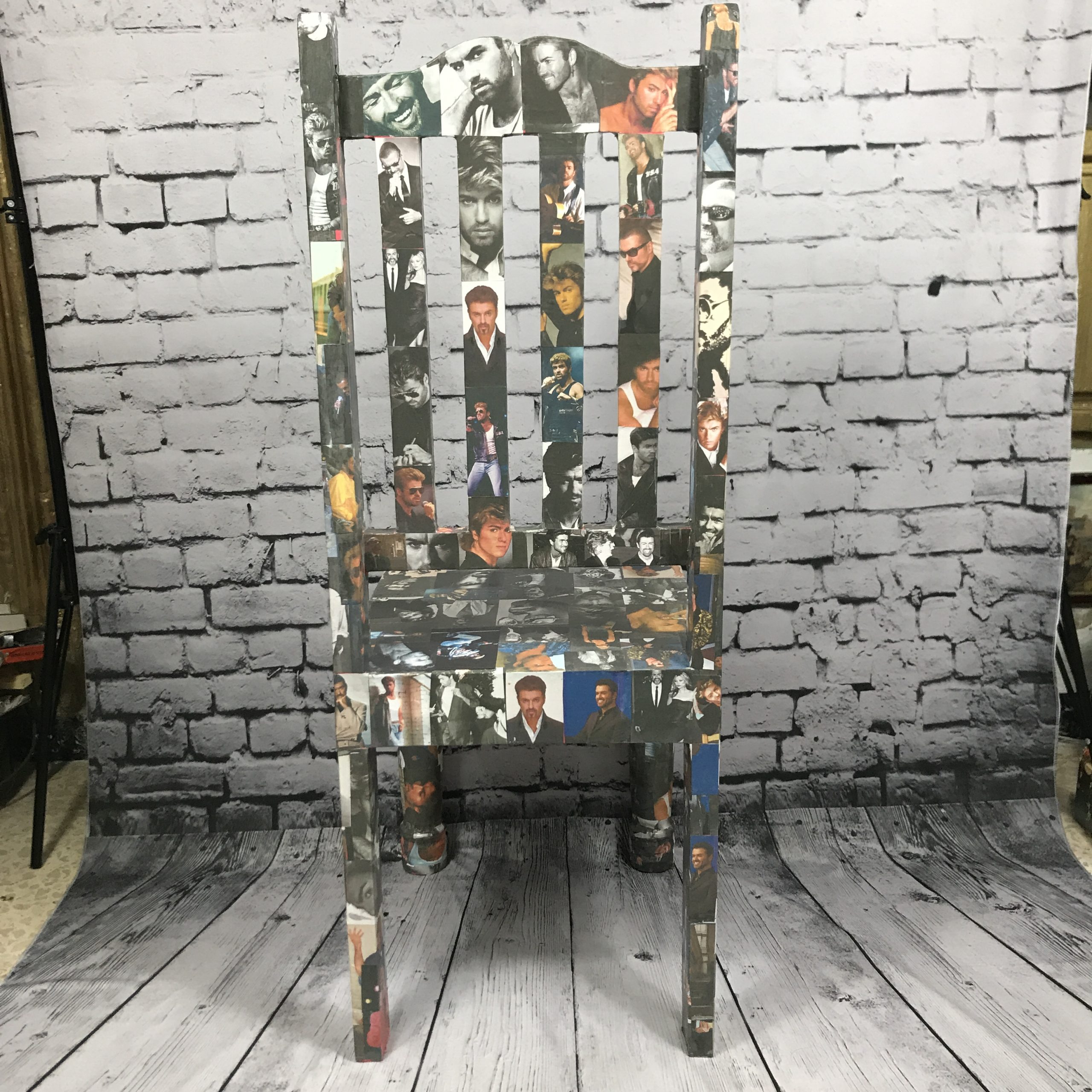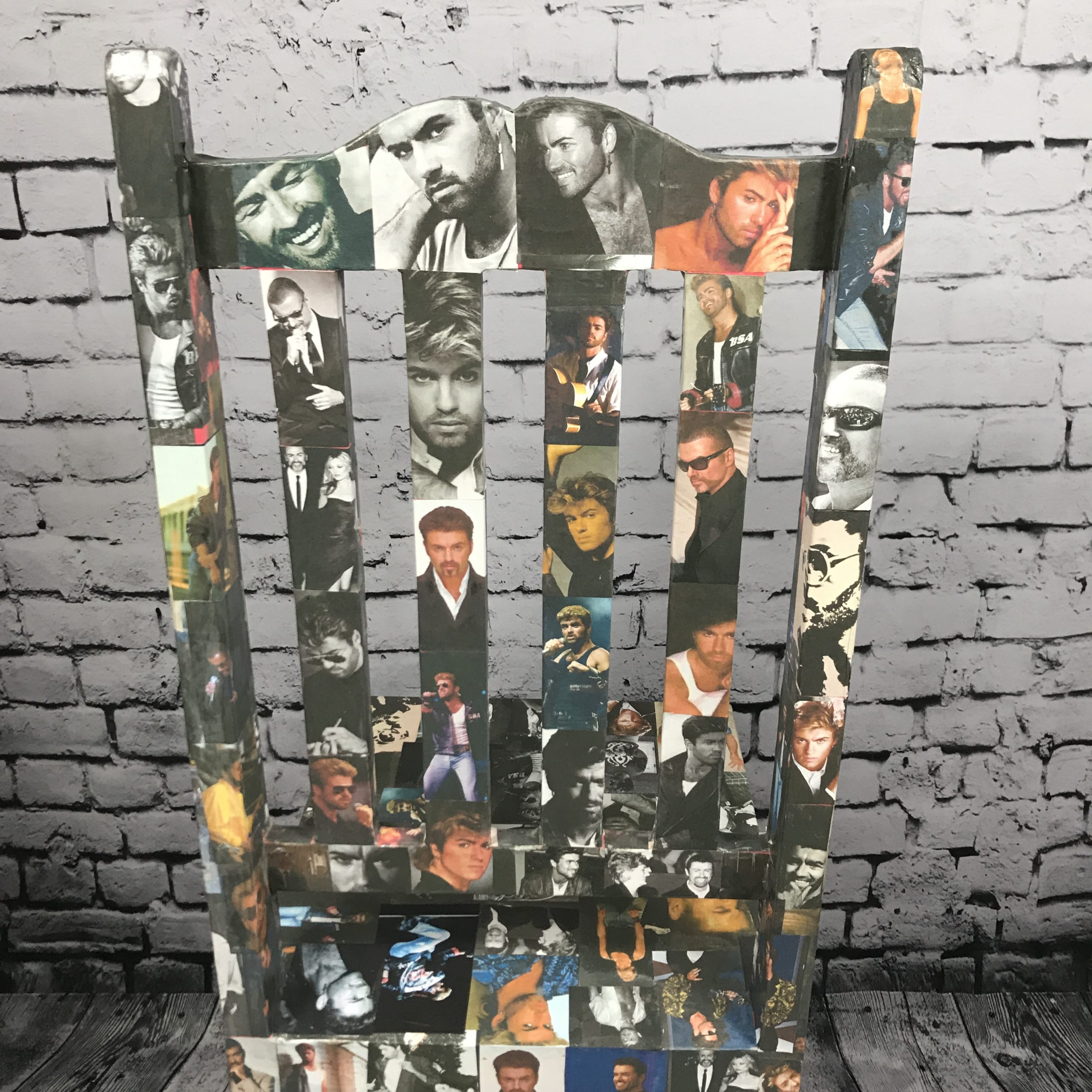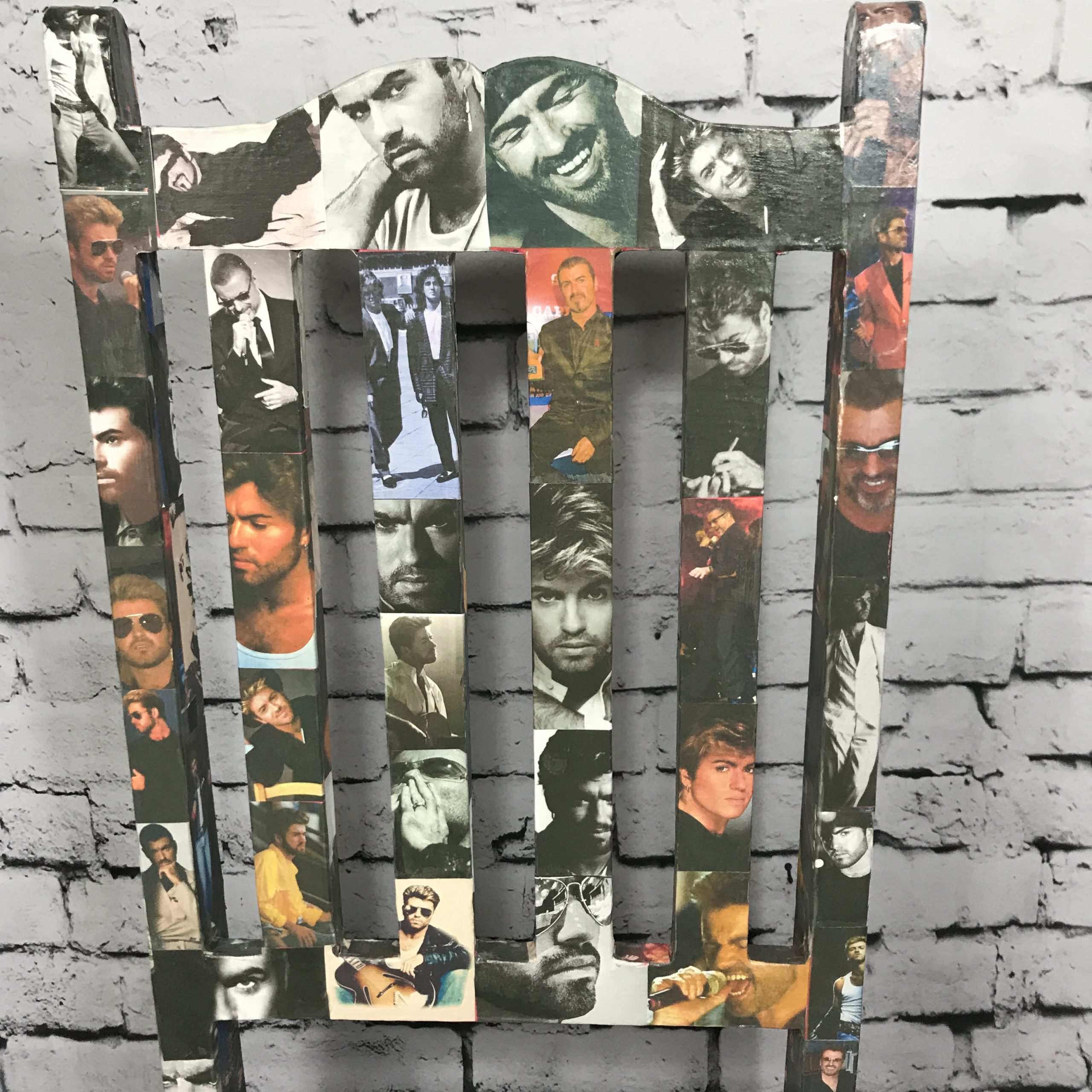 Solid wooden chair, decoupaged with pictures of George Michael – a unique piece and one for the fans!