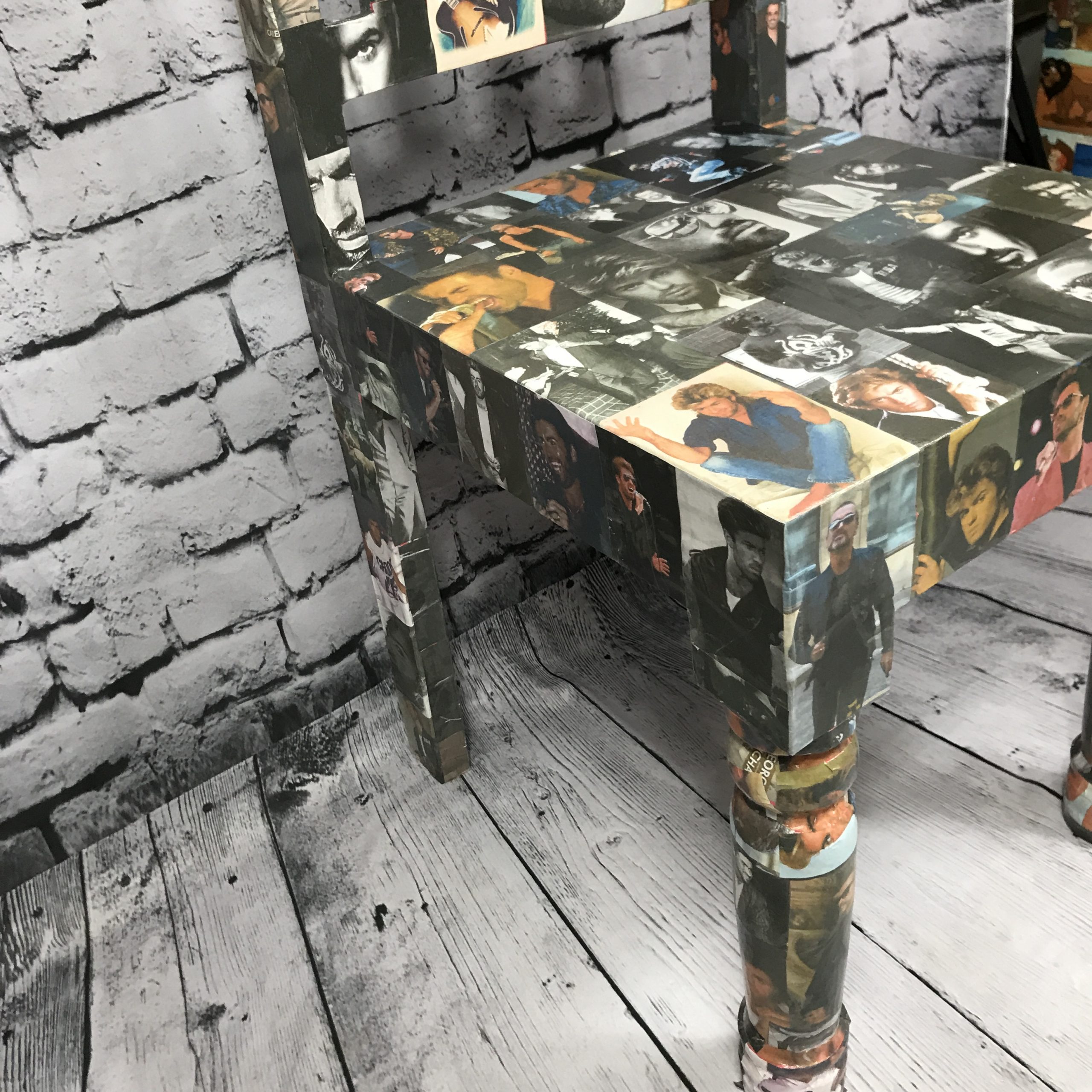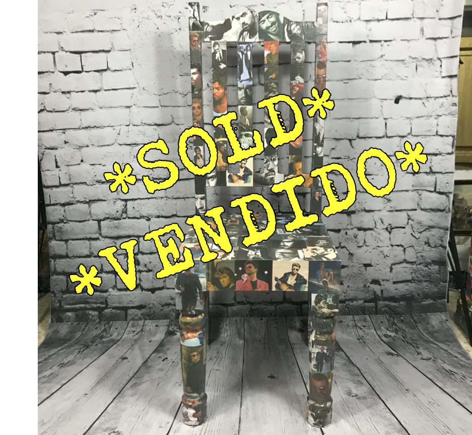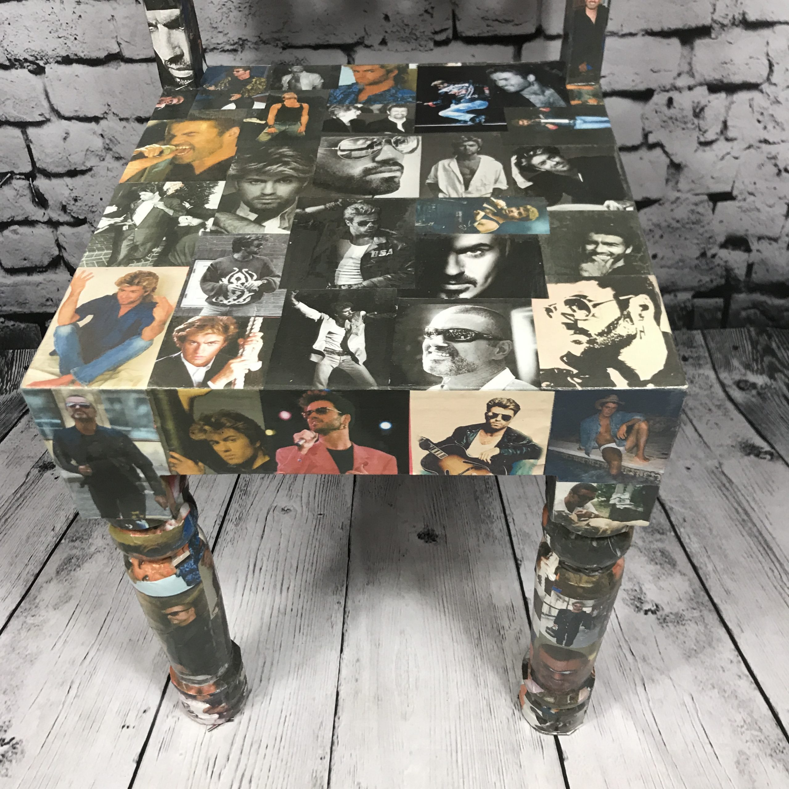 Solid wooden chair, decoupaged with pictures of George Michael – a unique piece and one for the fans!