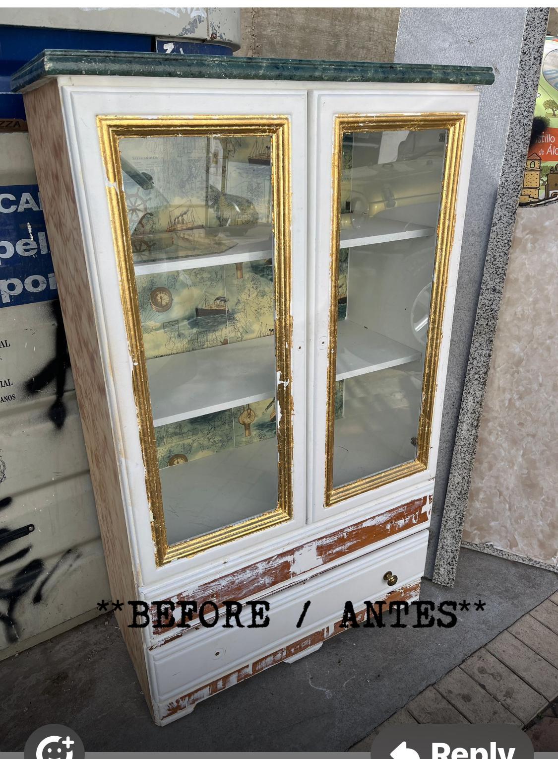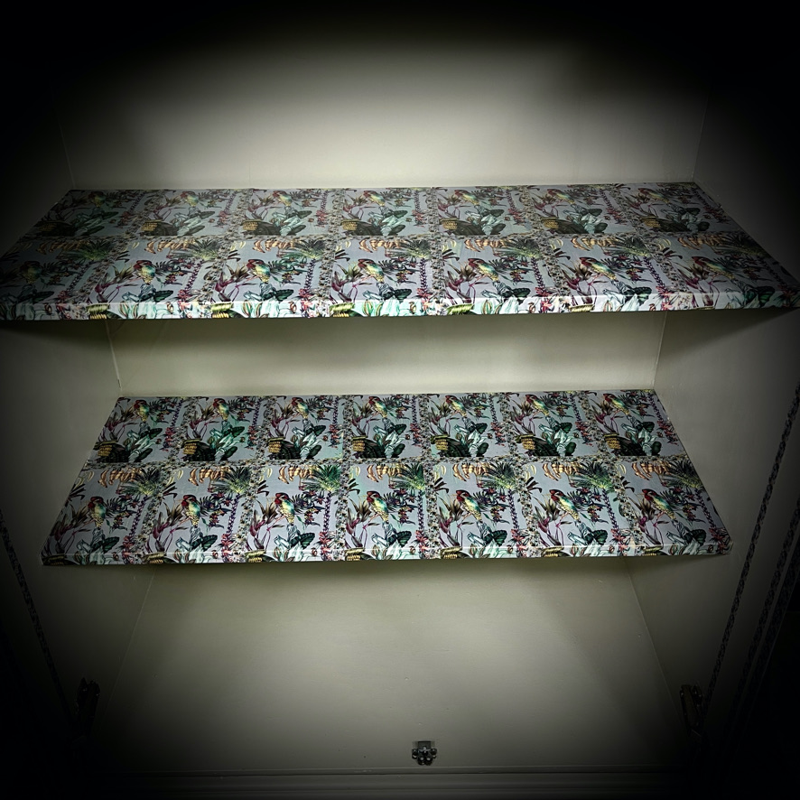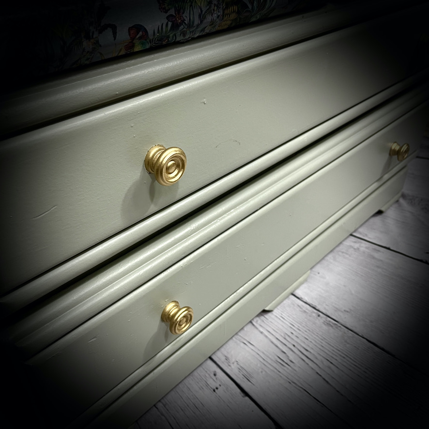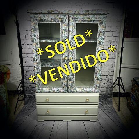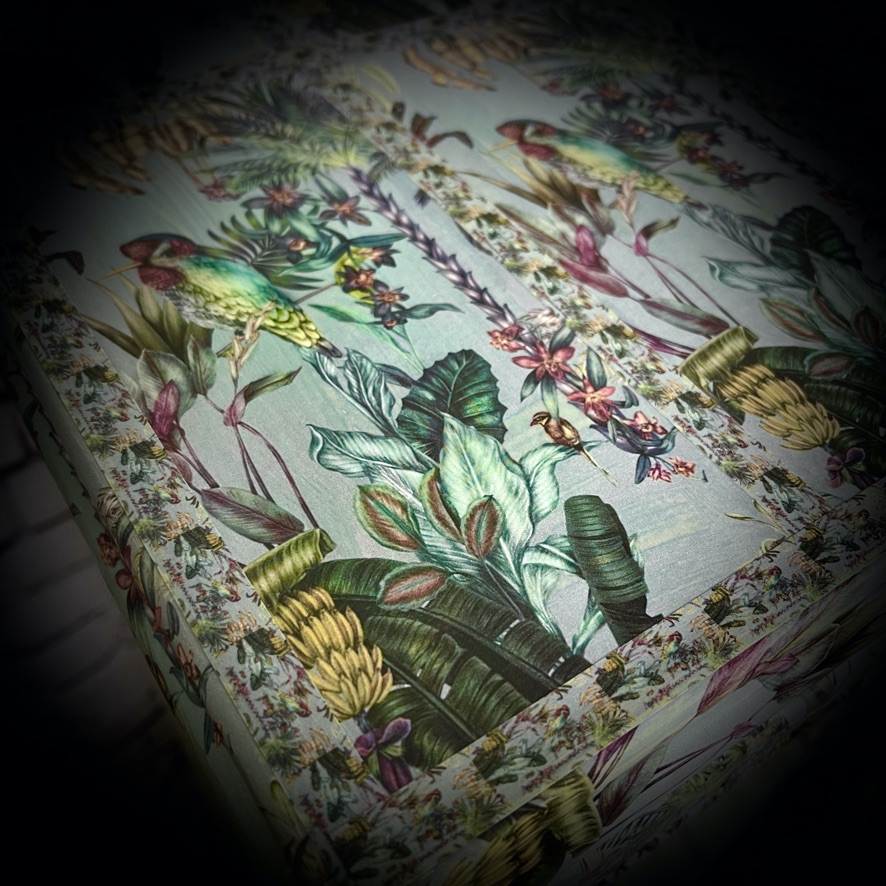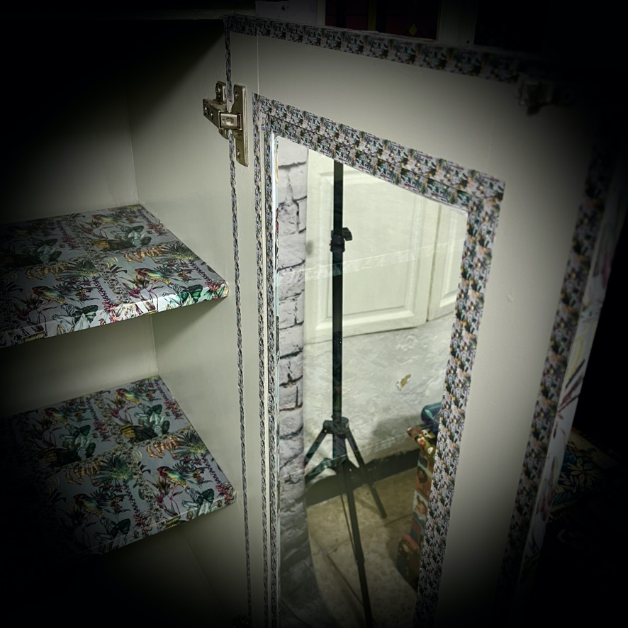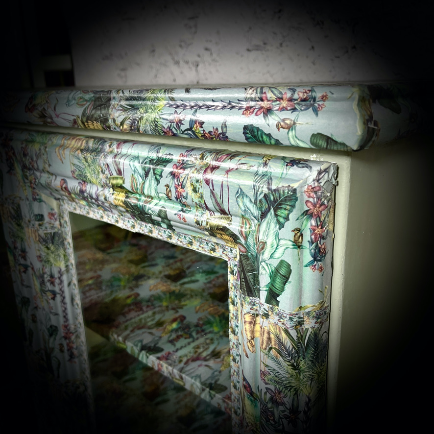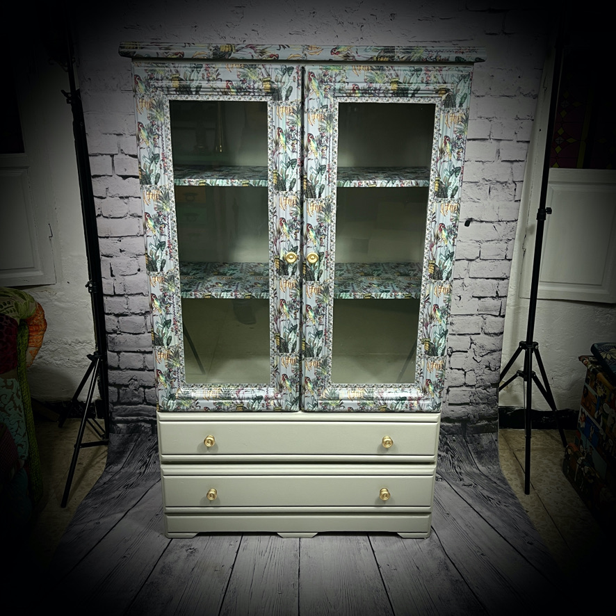 Saved from a trip to the dump, this large display cabinet has been given a makeover in a grey and decoupaged in a tropical jungle print.