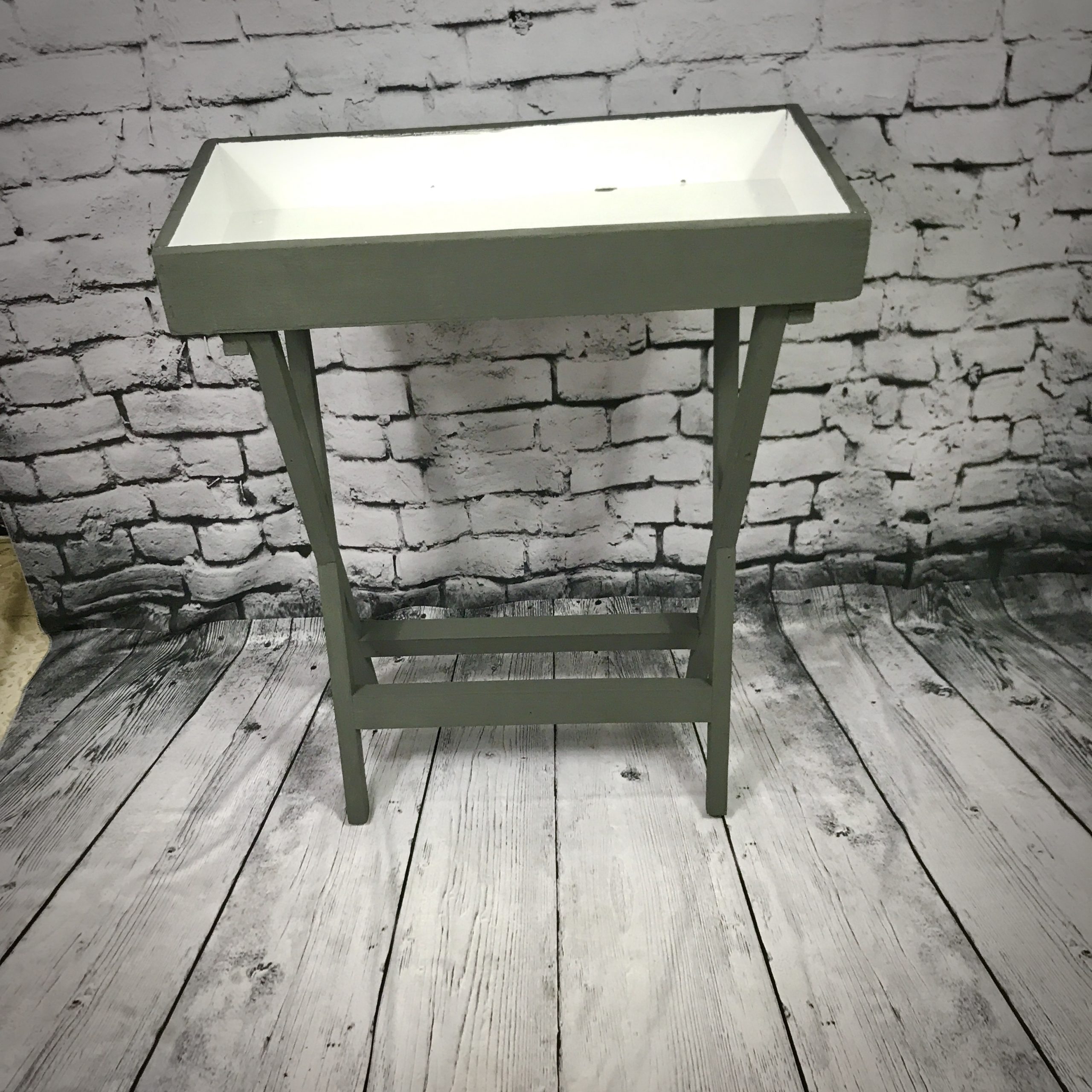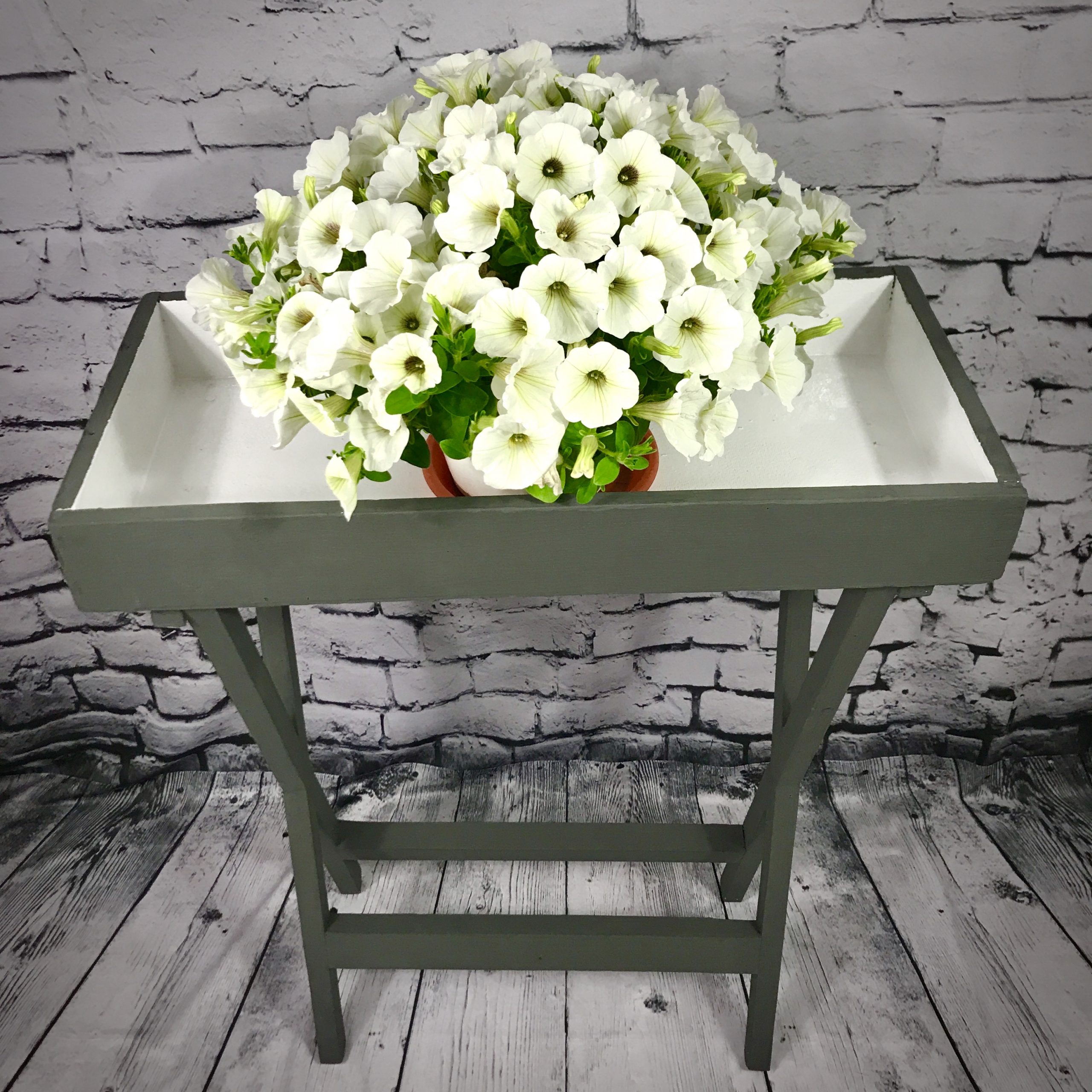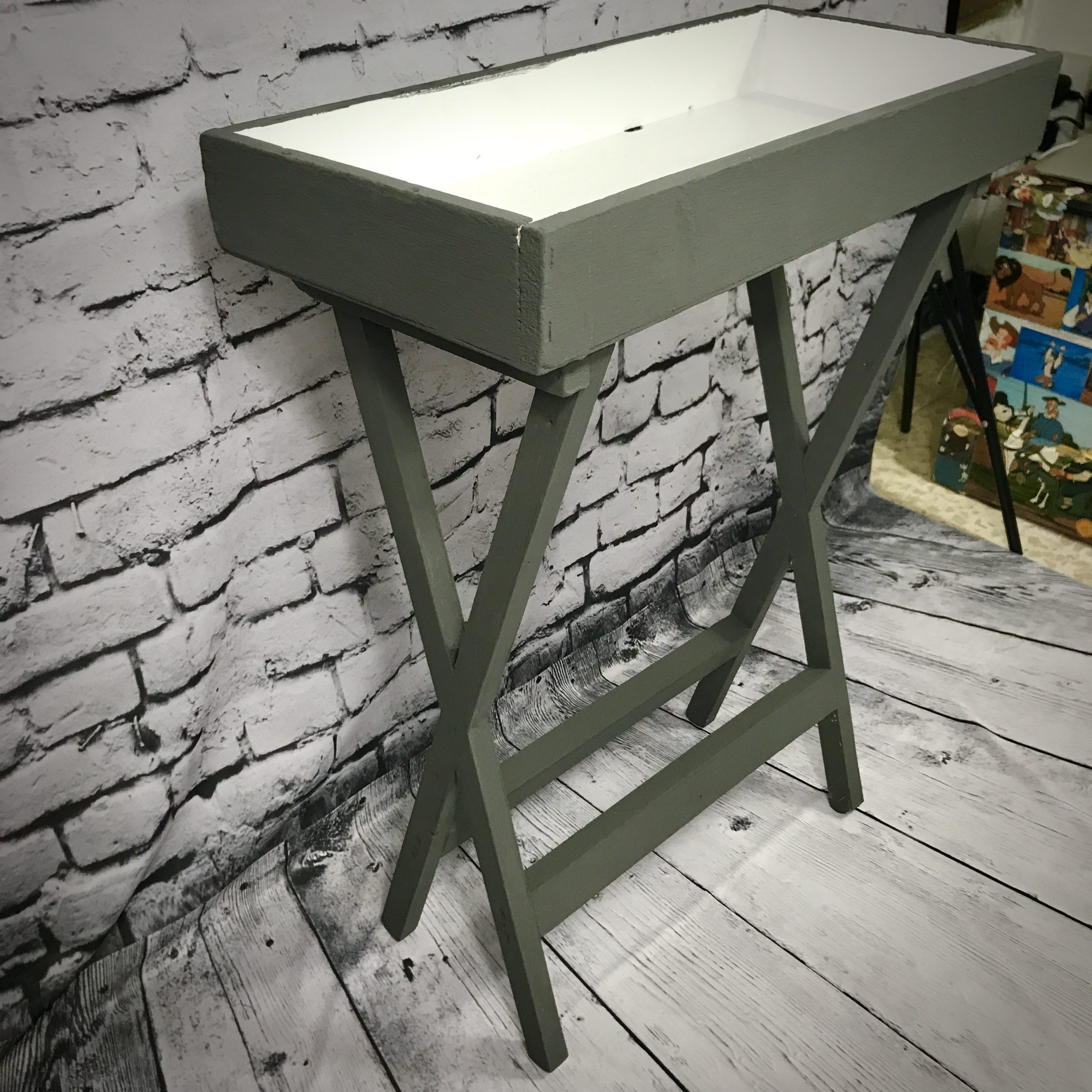 Here we have a recycled dressmaker’s button box transformed into a wooden ‘box’ table, painted in stylish grey and white. This table could be used as a plant stand or just to hold your drink next to your favourite chair! Please note: the plant, the glass and the wine are not included!!