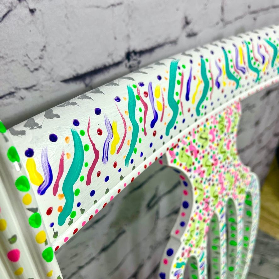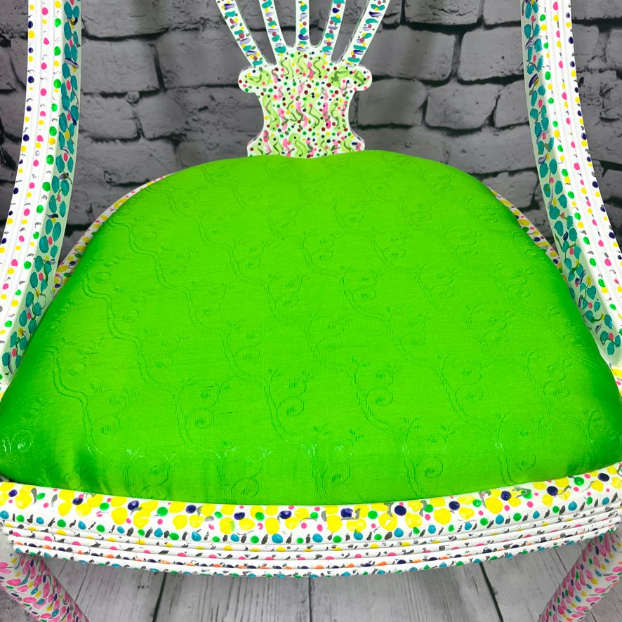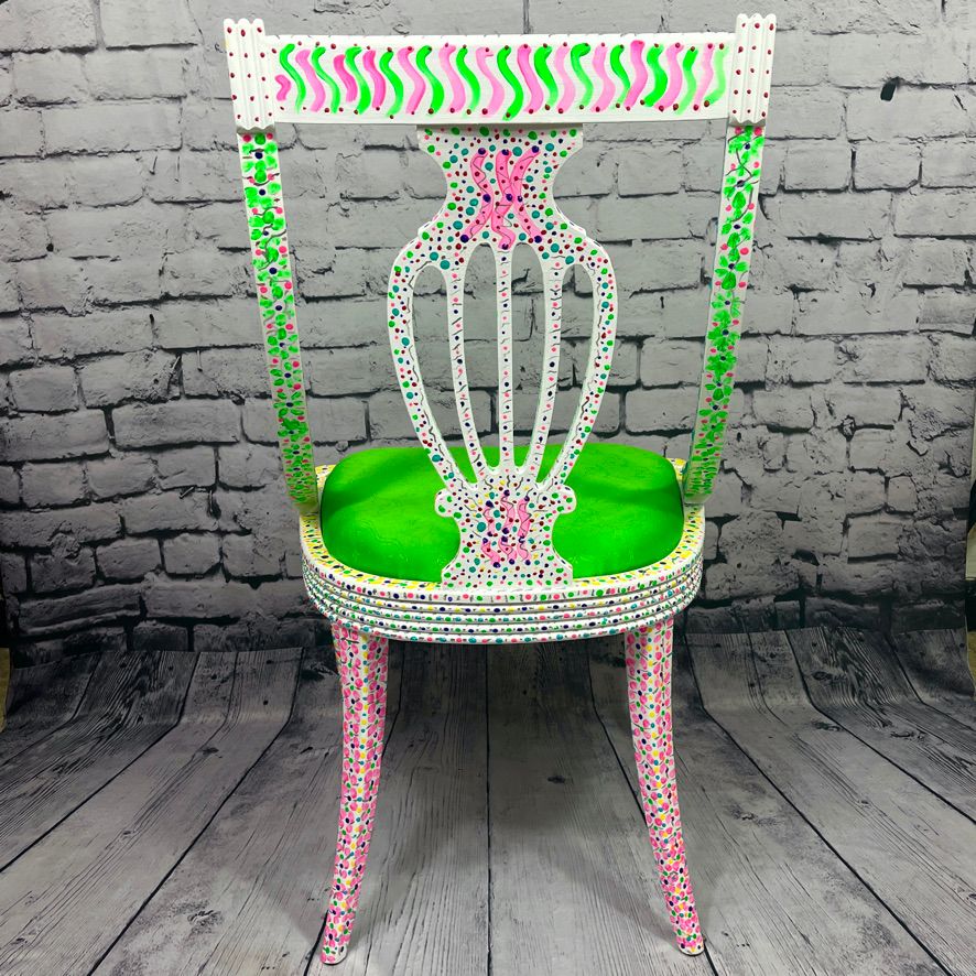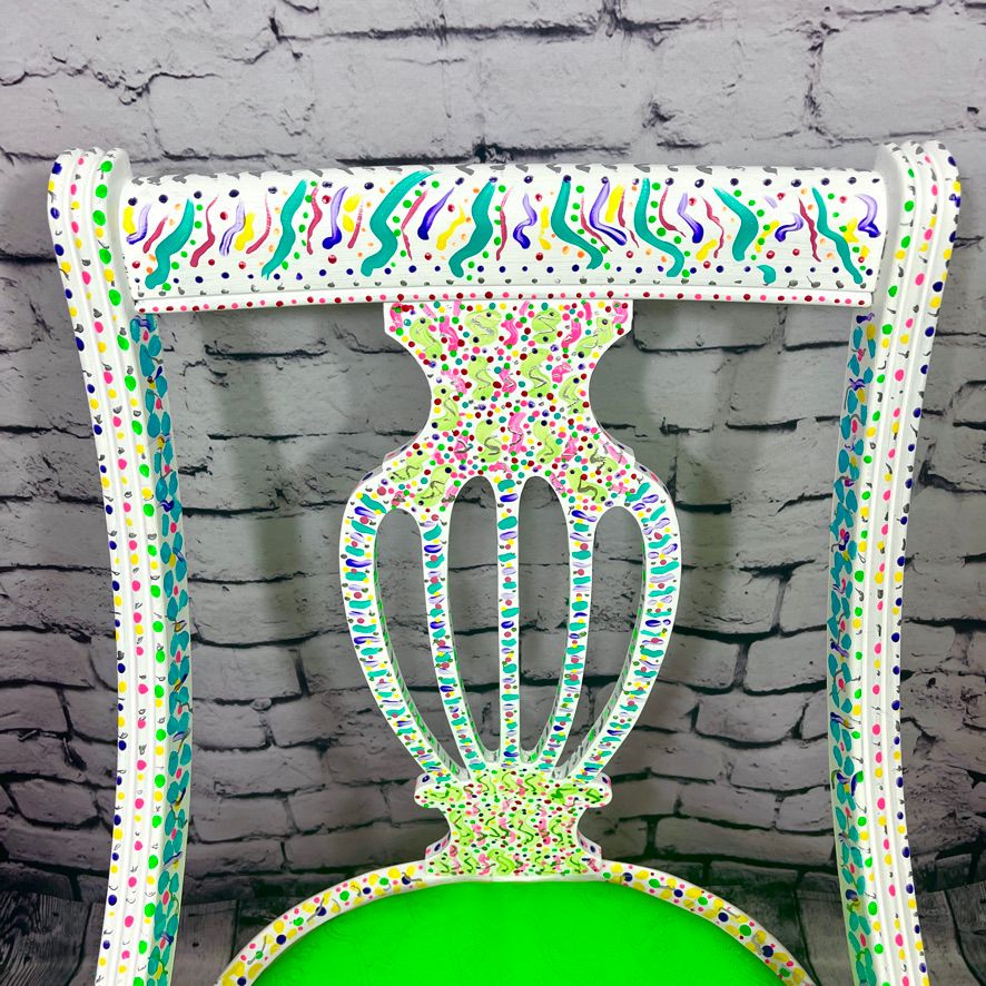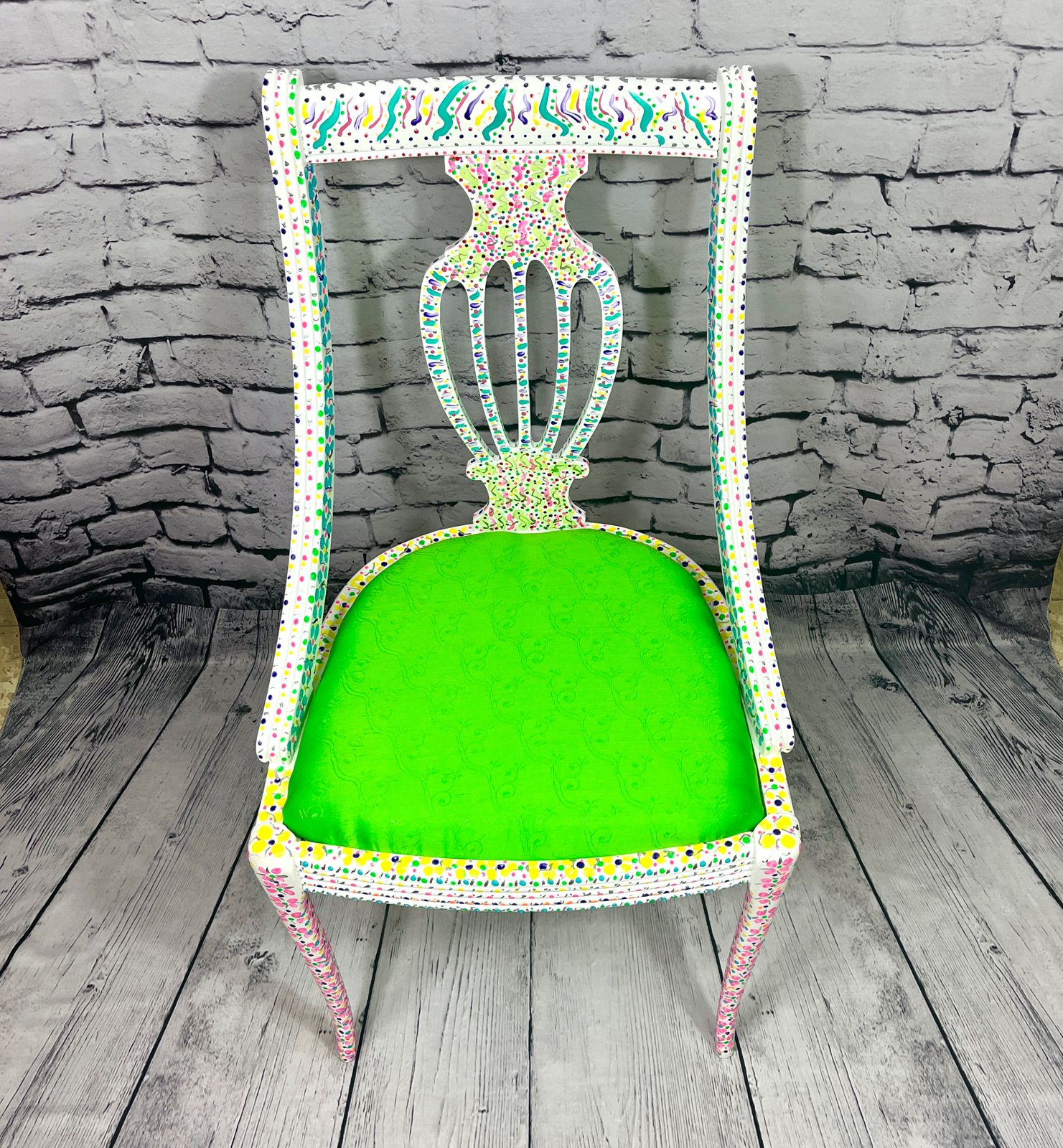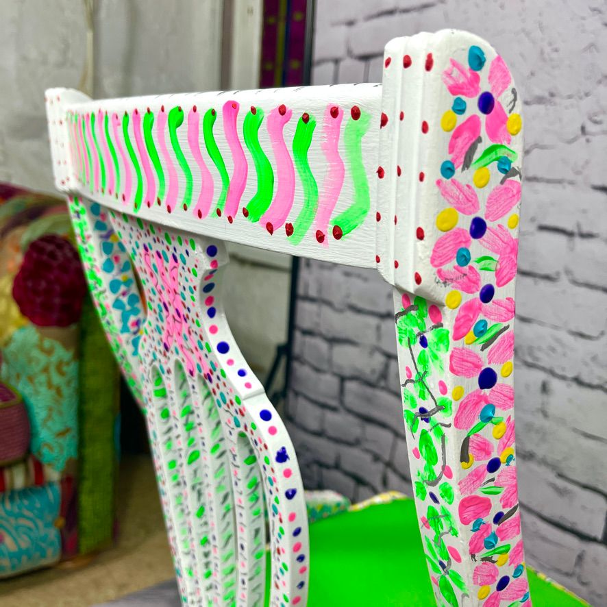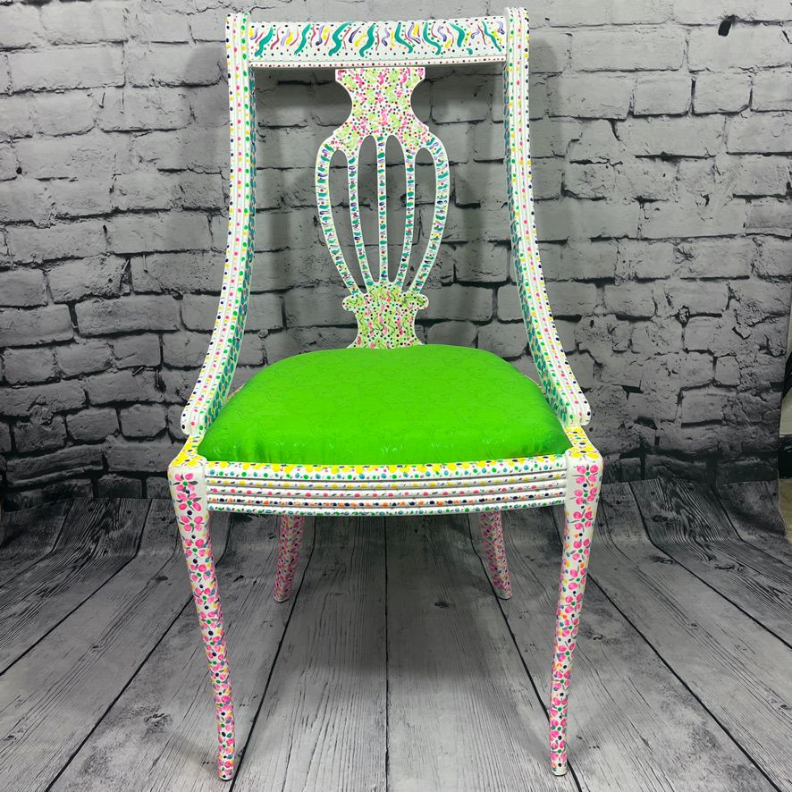This solid, wooden chair has been given a totally unique, hand painted finish and restored seat to make a practical and standout piece of furniture.