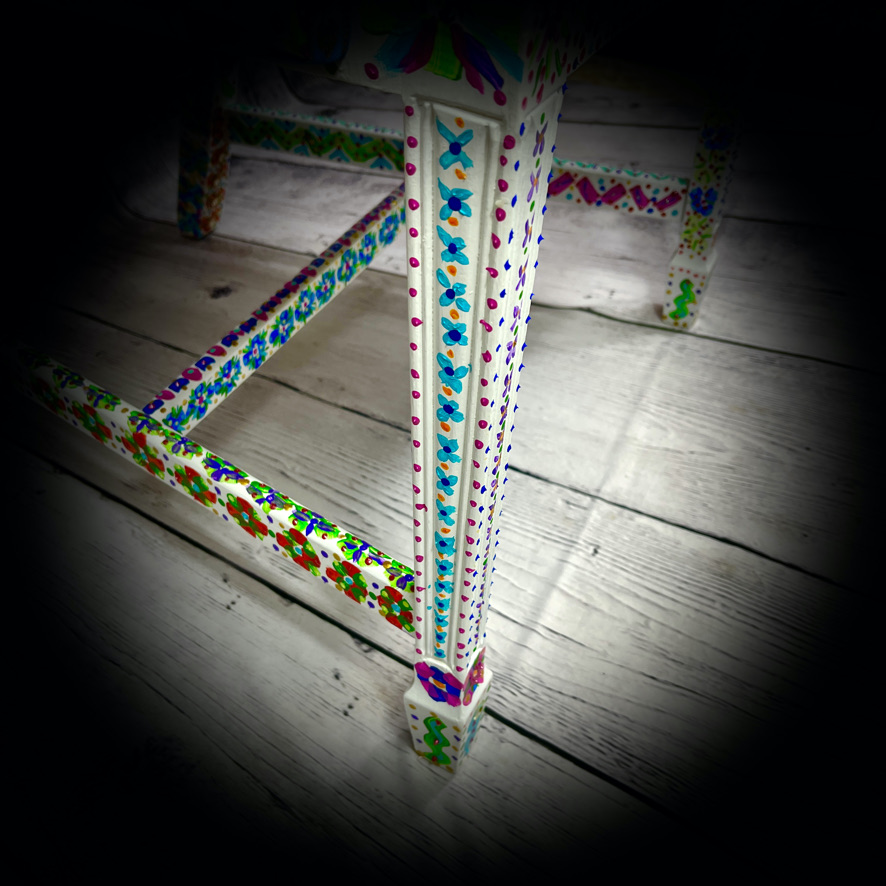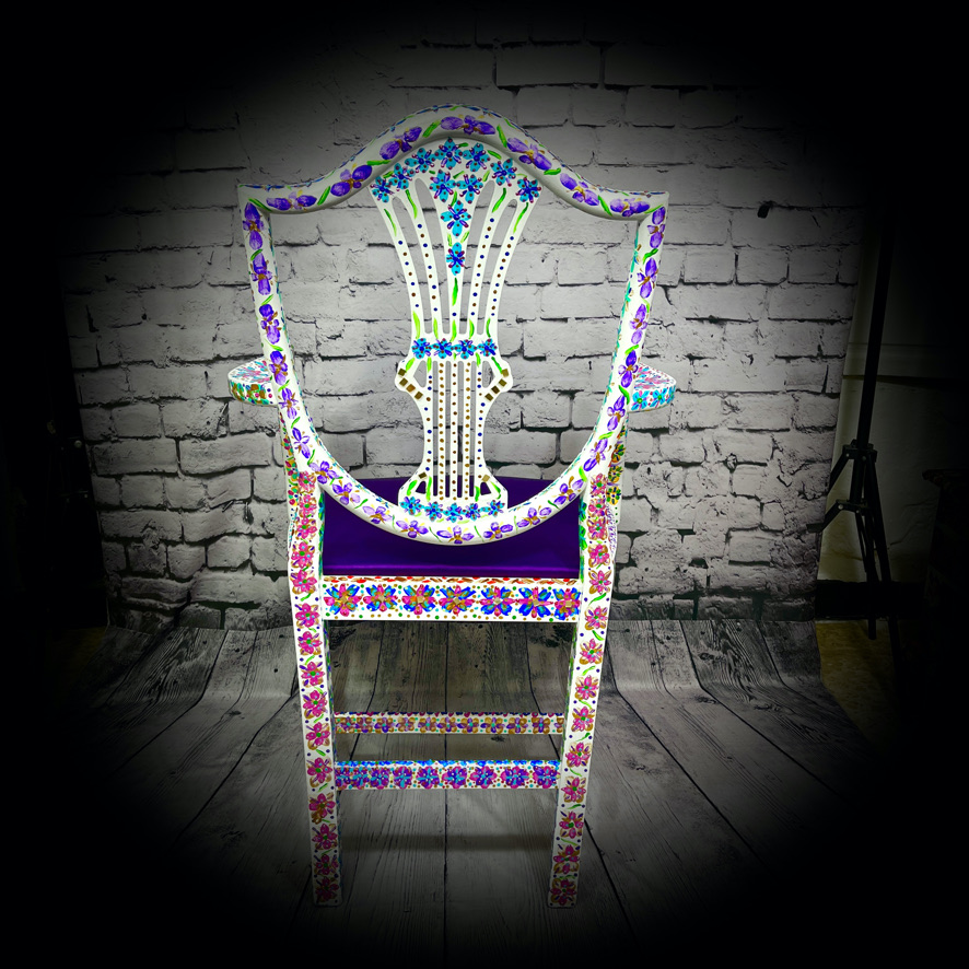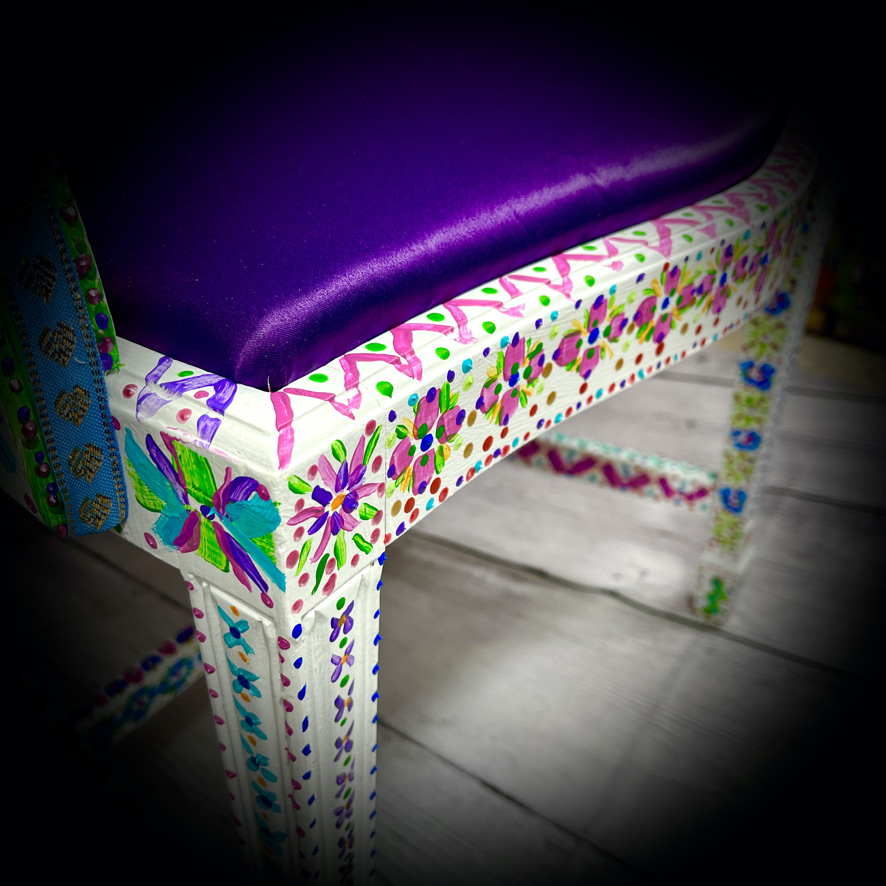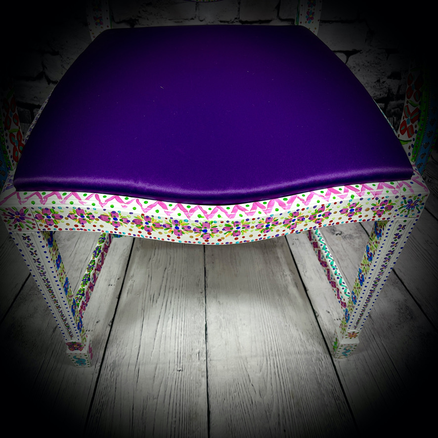 This carver-style, wooden chair with upholstered seat has been given a magnificent, hand-painted, “folk art” makeover to produce a stunning, colourful and totally unique piece of furniture – truly a one-off!