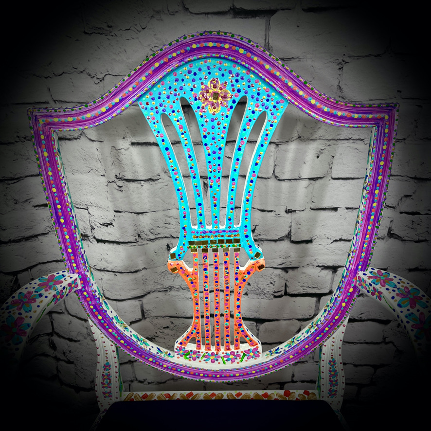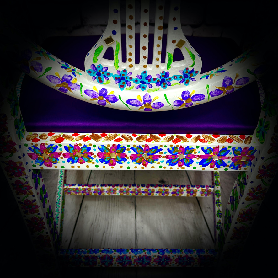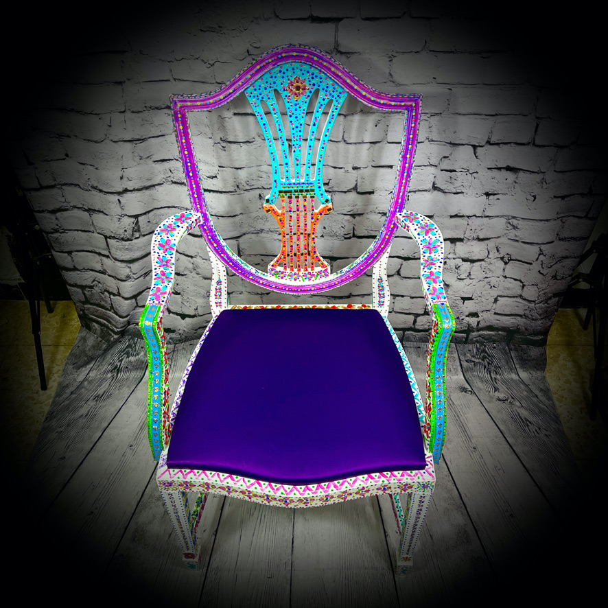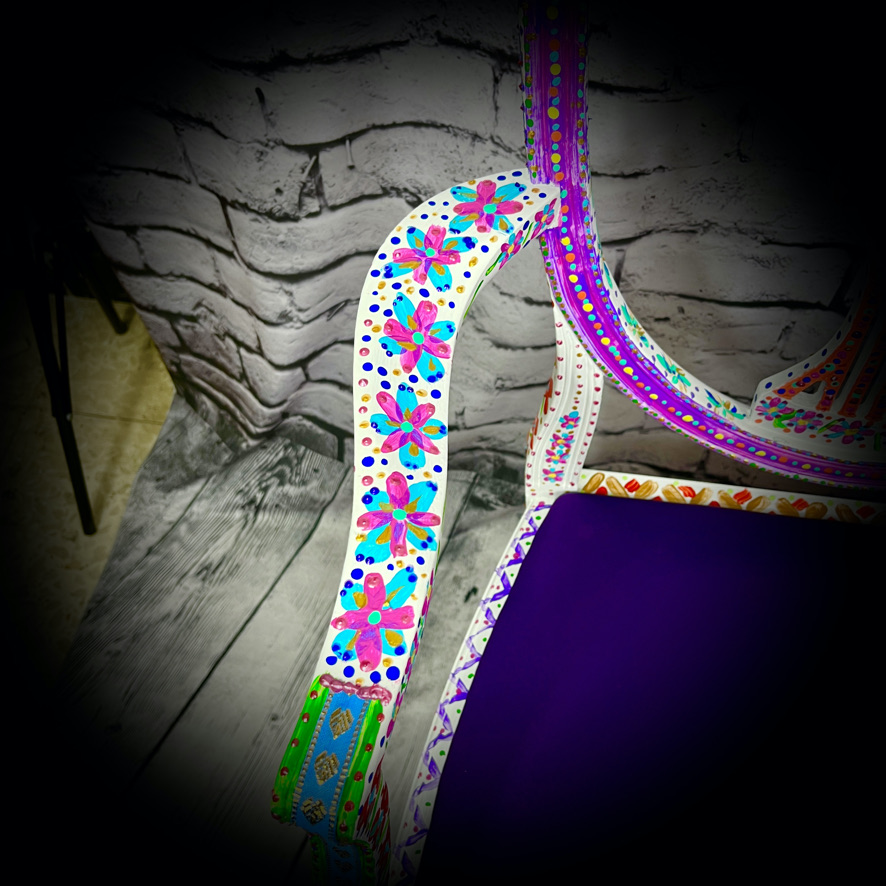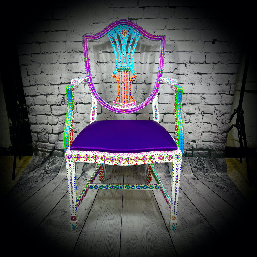This carver-style, wooden chair with upholstered seat has been given a magnificent, hand-painted, “folk art” makeover to produce a stunning, colourful and totally unique piece of furniture – truly a one-off!