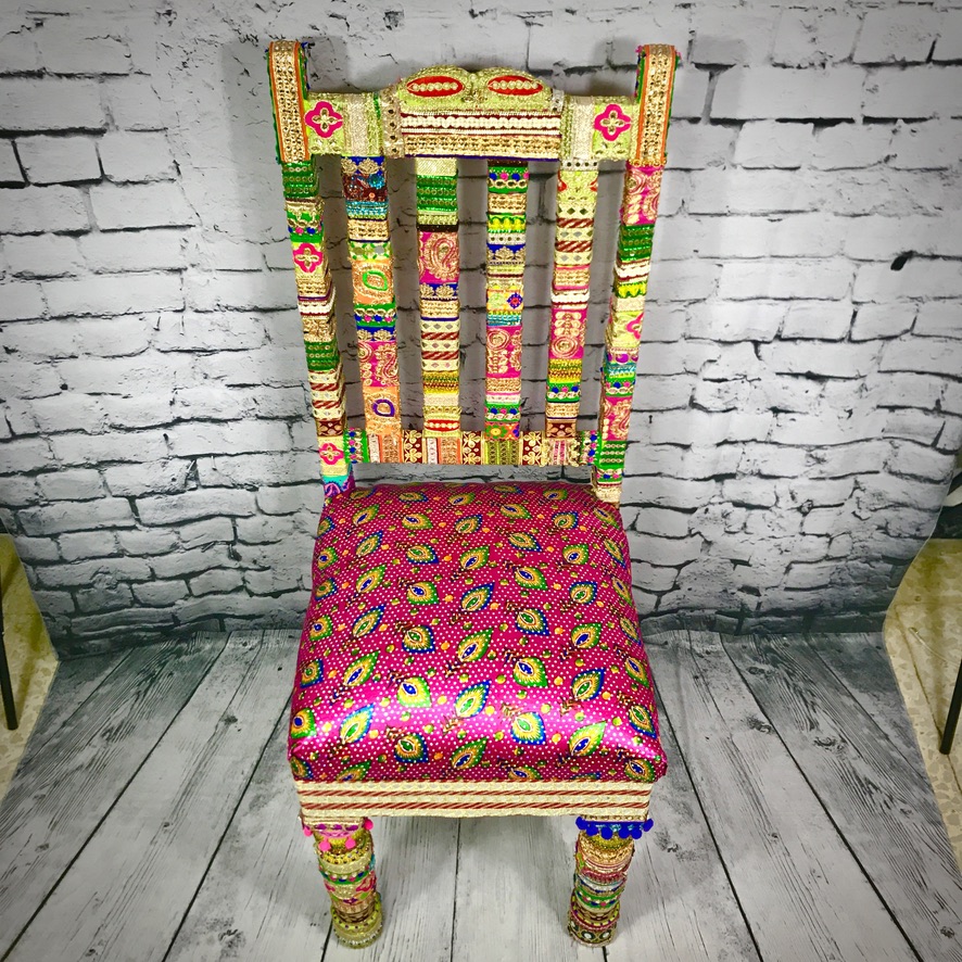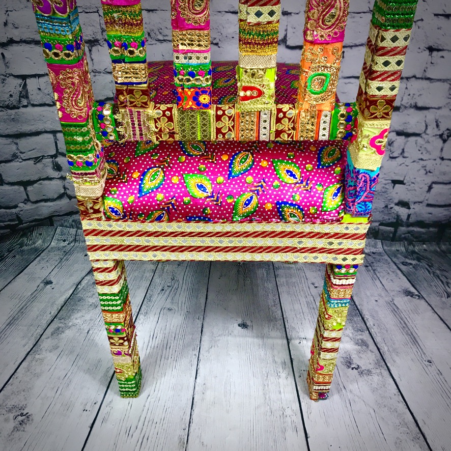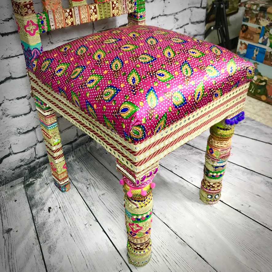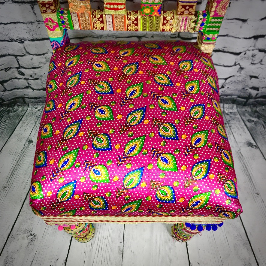 This solid, wooden chair has been decorated with Indian trimmings and an upholstered seat to make a comfortable, extremely colourful and totally unique piece of furniture.