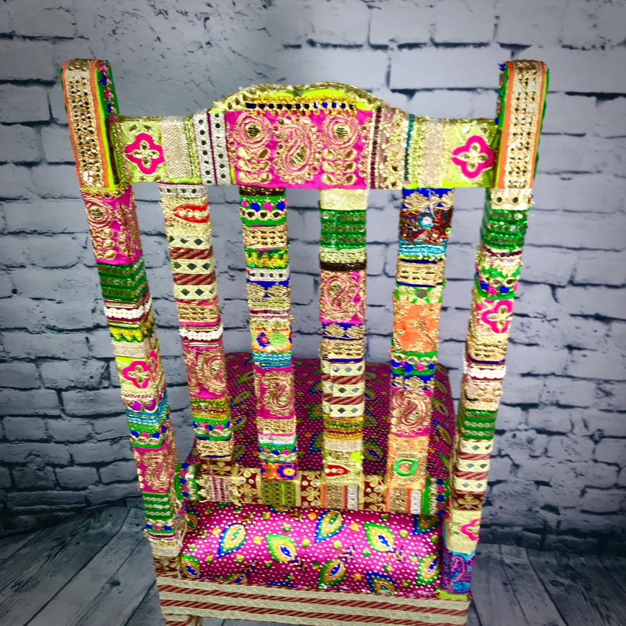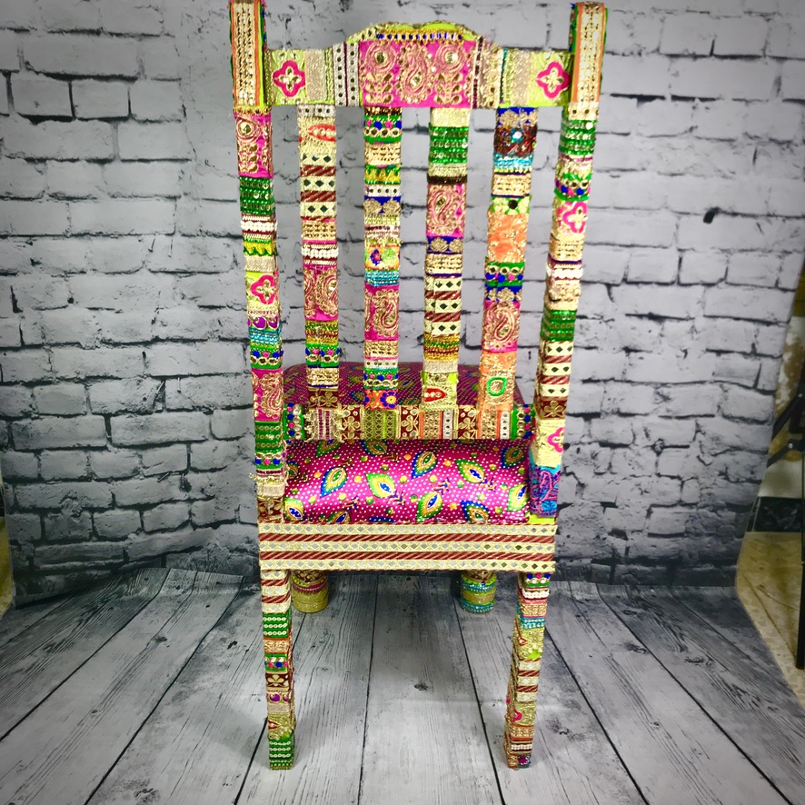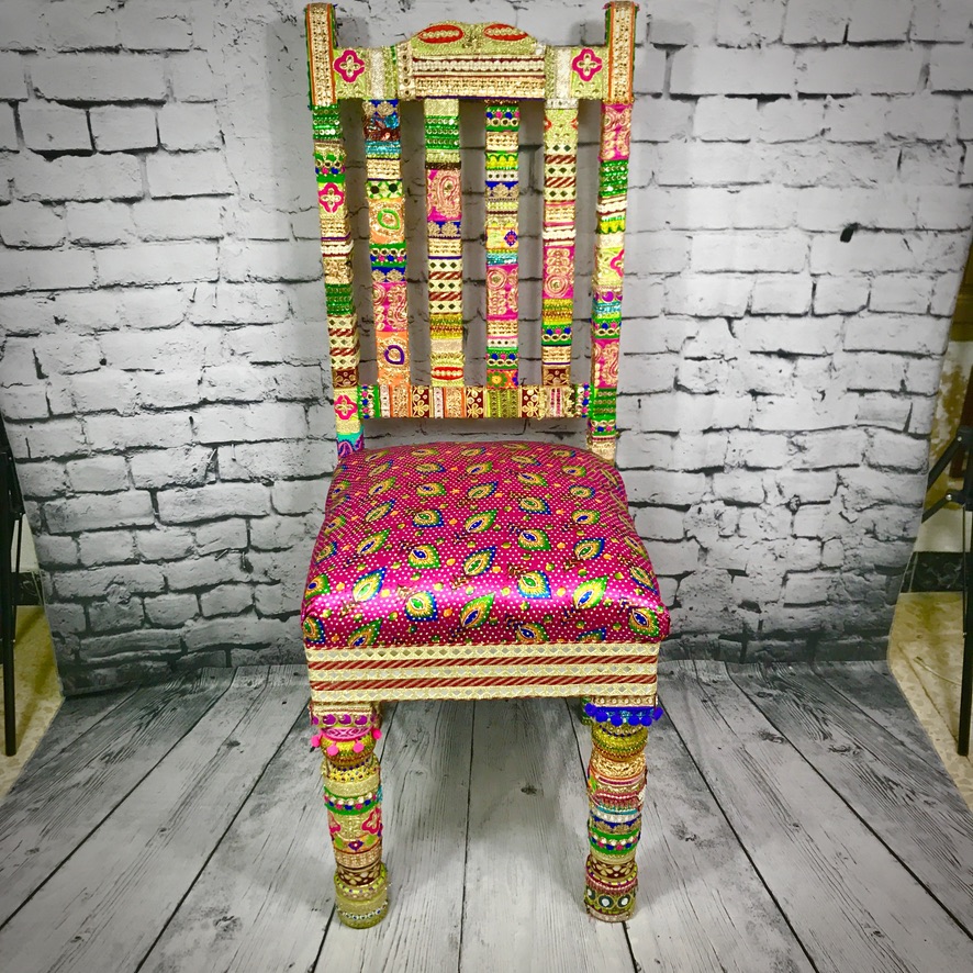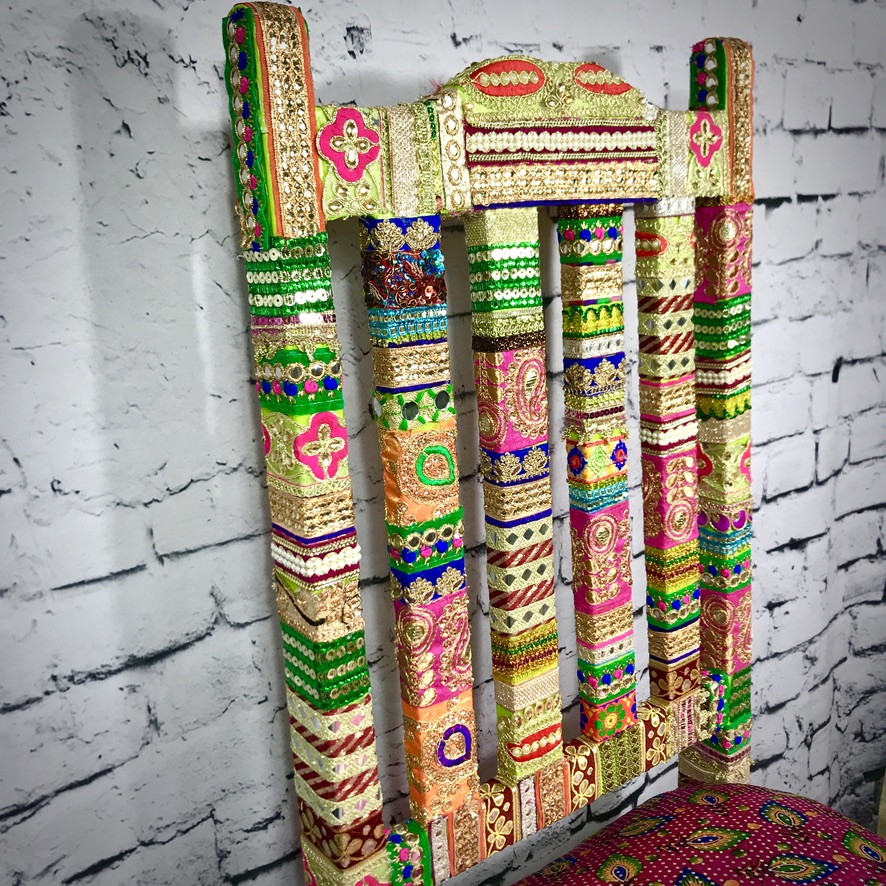 This solid, wooden chair has been decorated with Indian trimmings and an upholstered seat to make a comfortable, extremely colourful and totally unique piece of furniture.