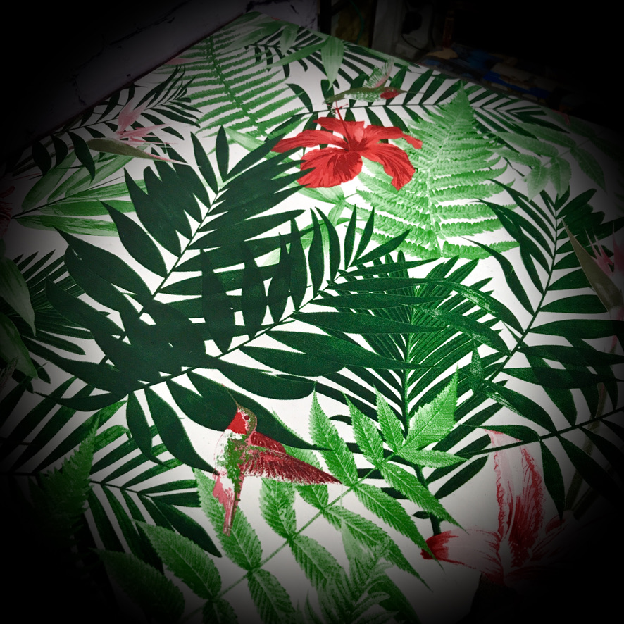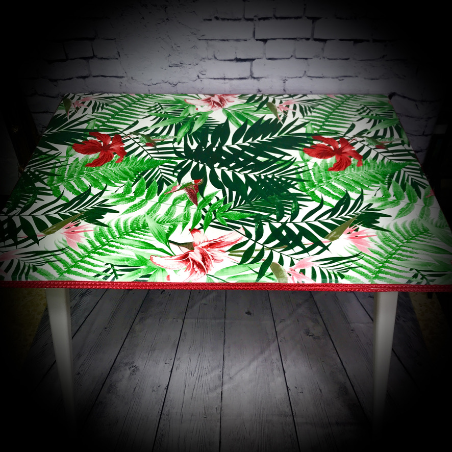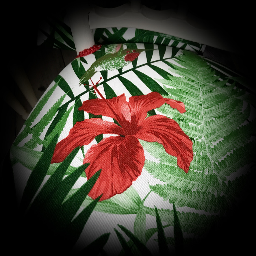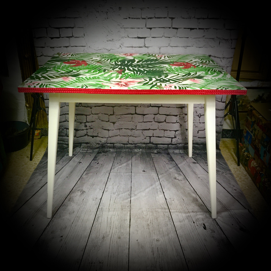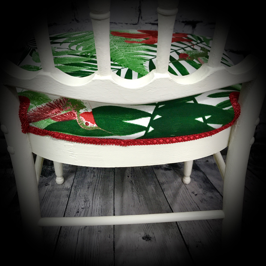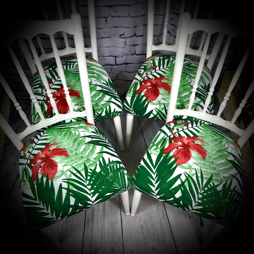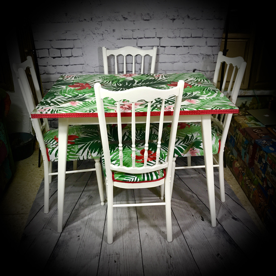 Each piece has been cleaned, painted and distressed and recovered in a lovely bright material. The table has been covered in the same material and given 4 coats of varnish, so it can be wiped clean and will withstand hot drinks.