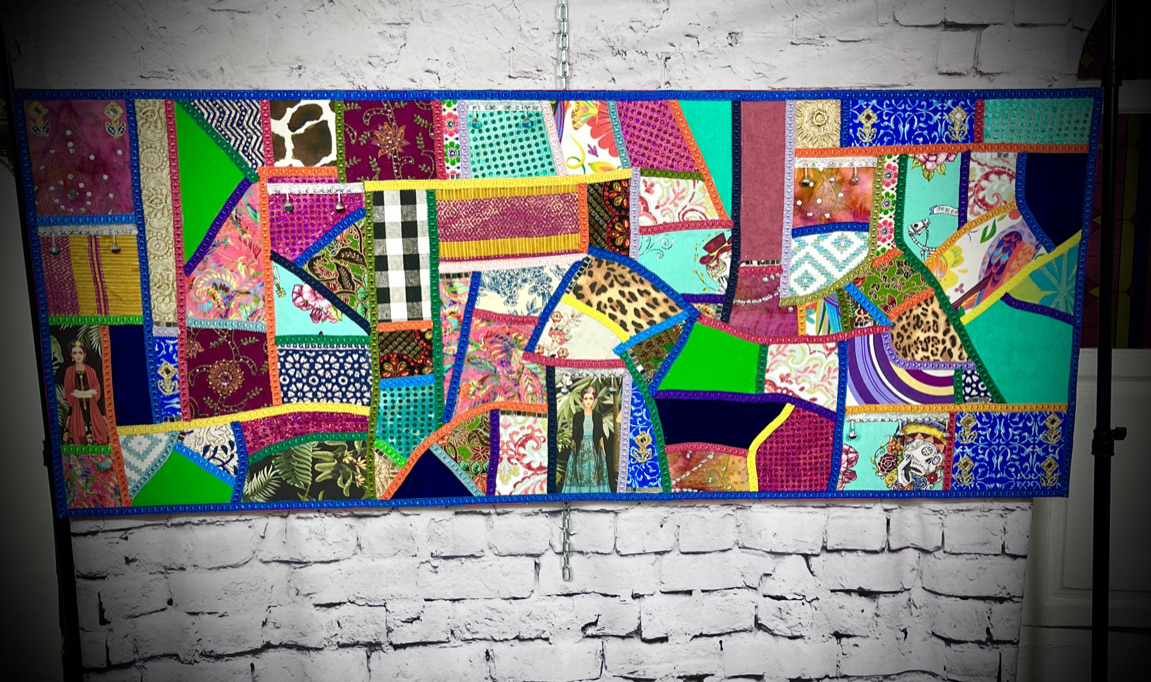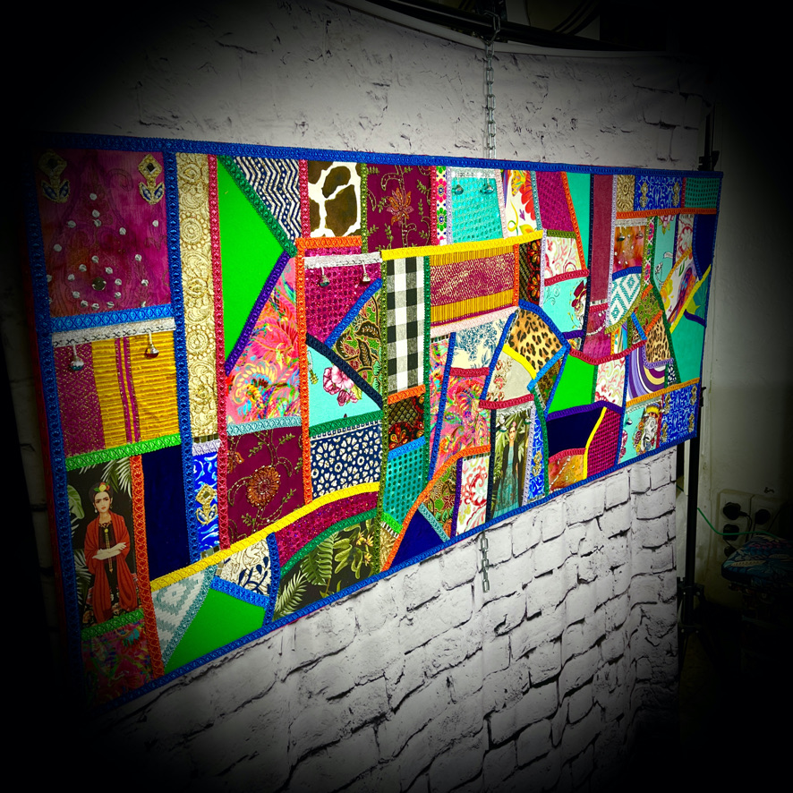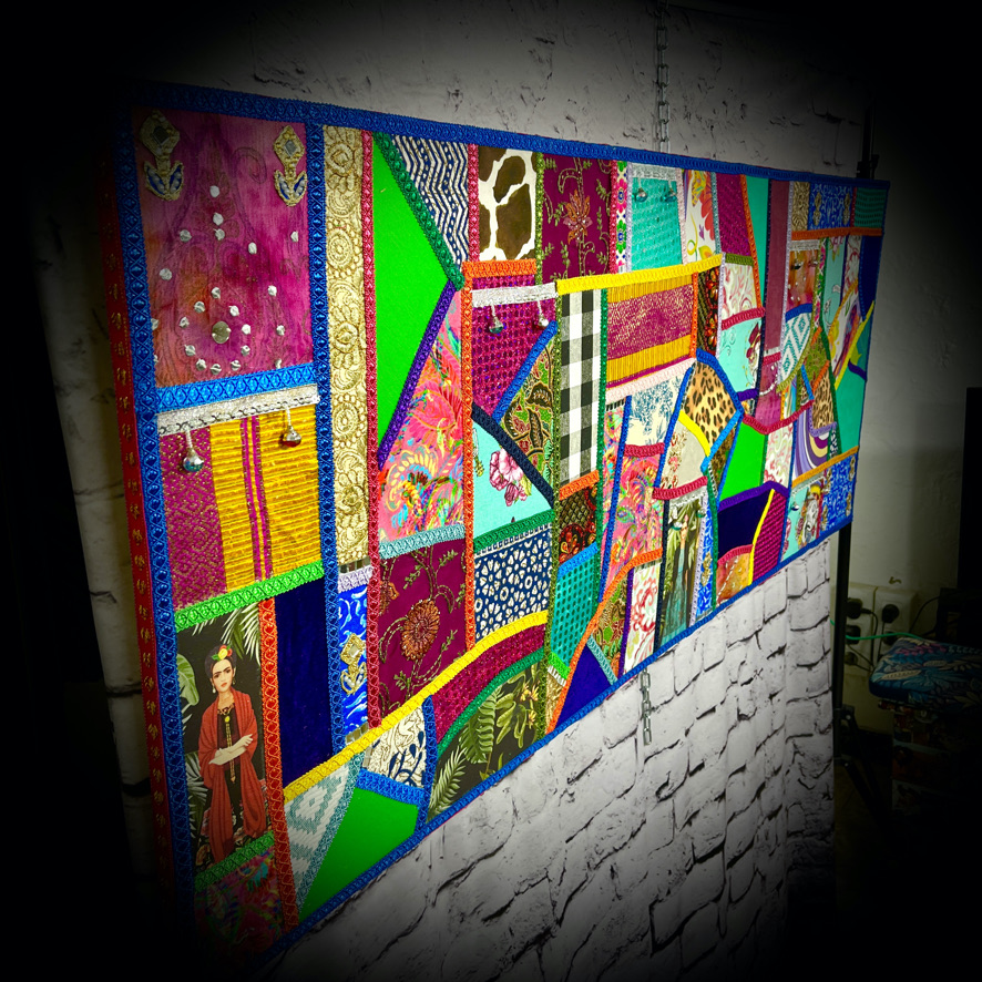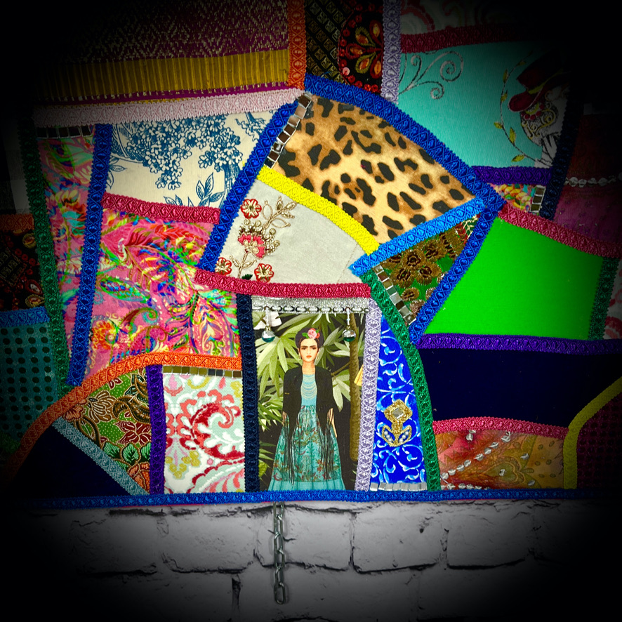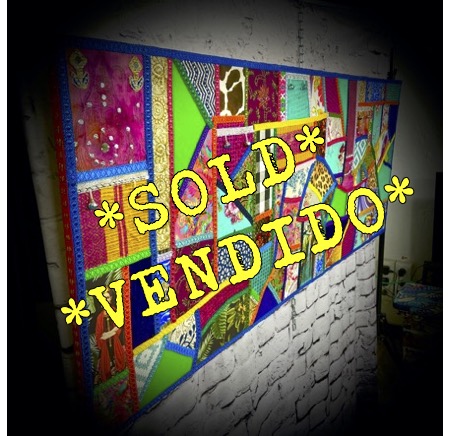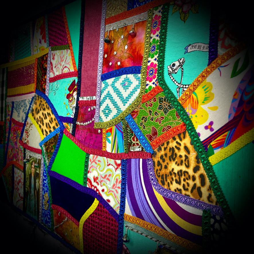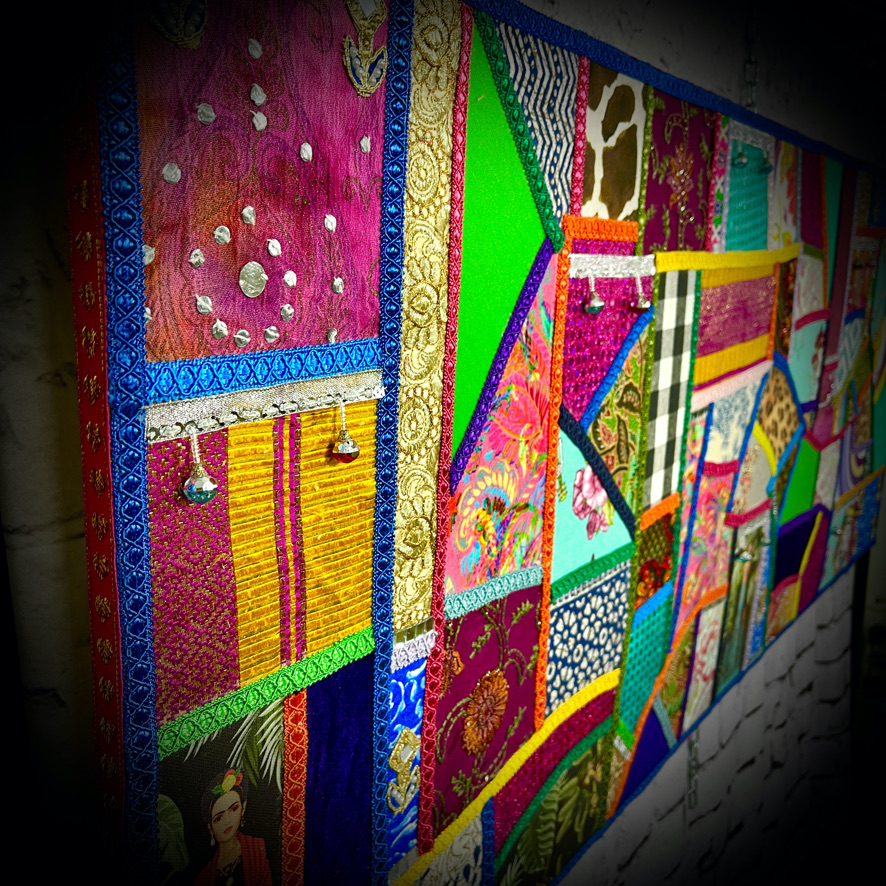 This large canvas has been covered with fabric pieces to create a totally unique, ‘BoHo’-styled piece of wall art.