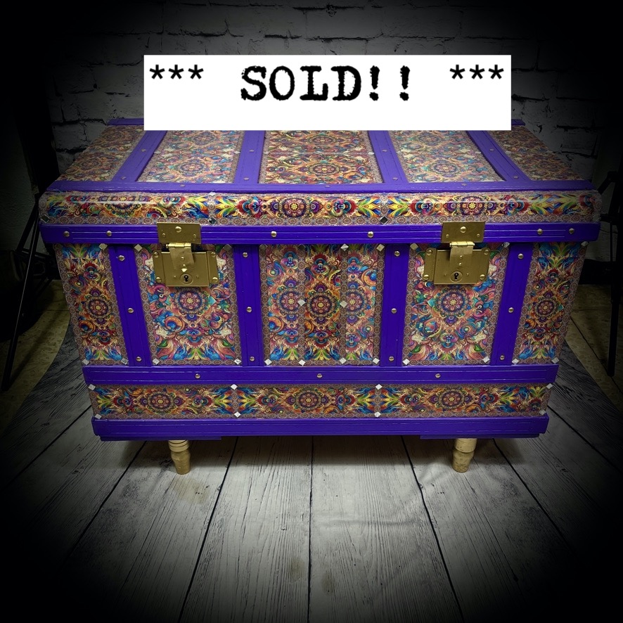 This solid travelling trunk has been decoupaged in a colourful mandala print – unique, standout and practical!