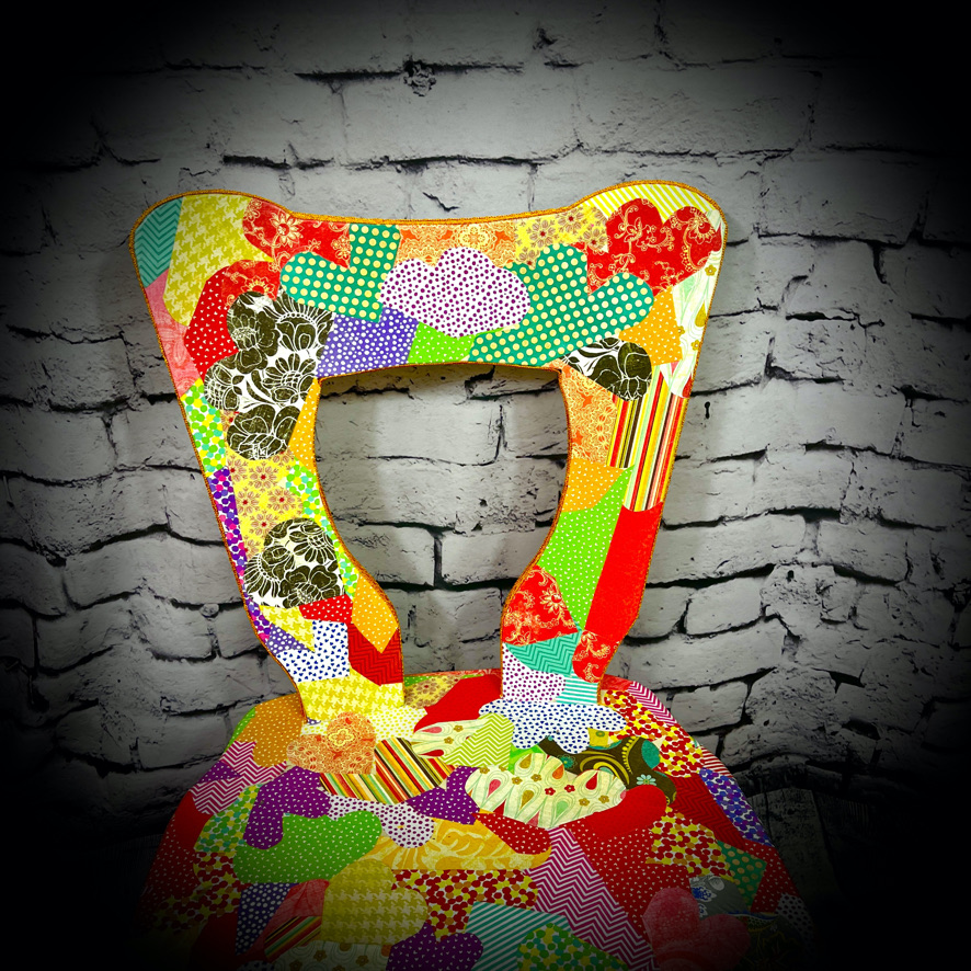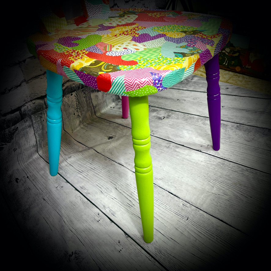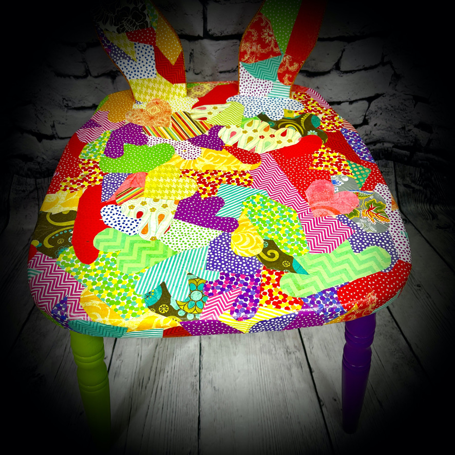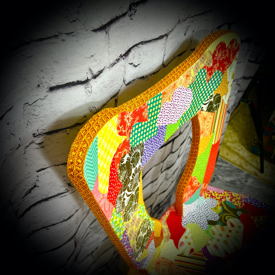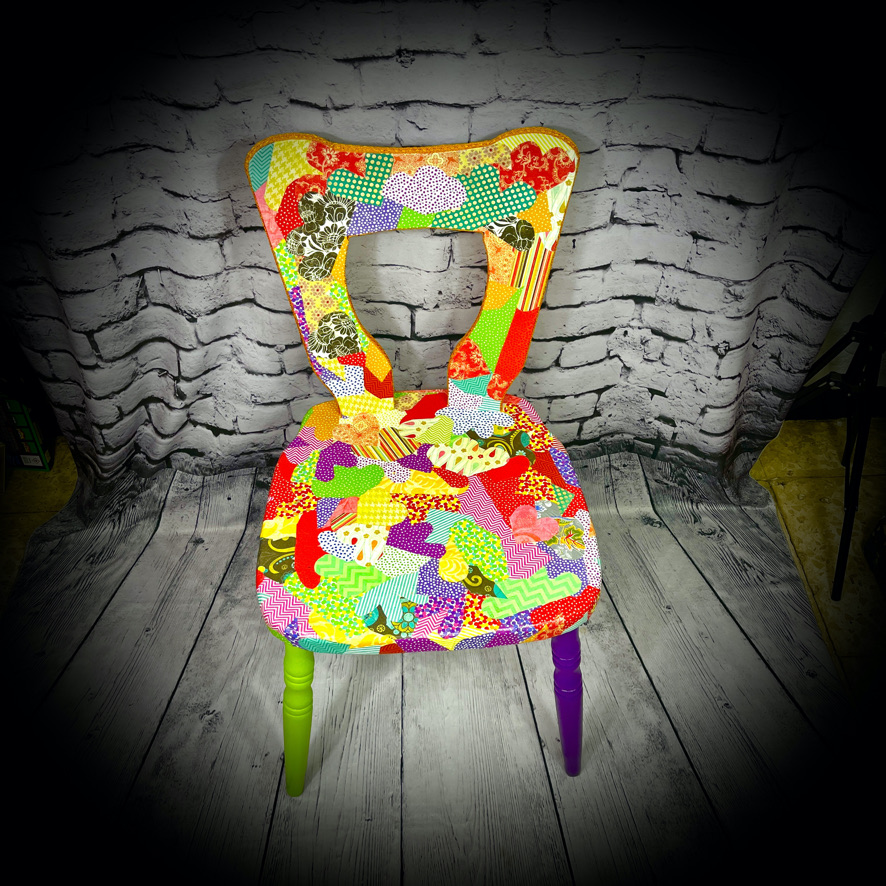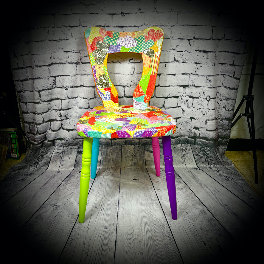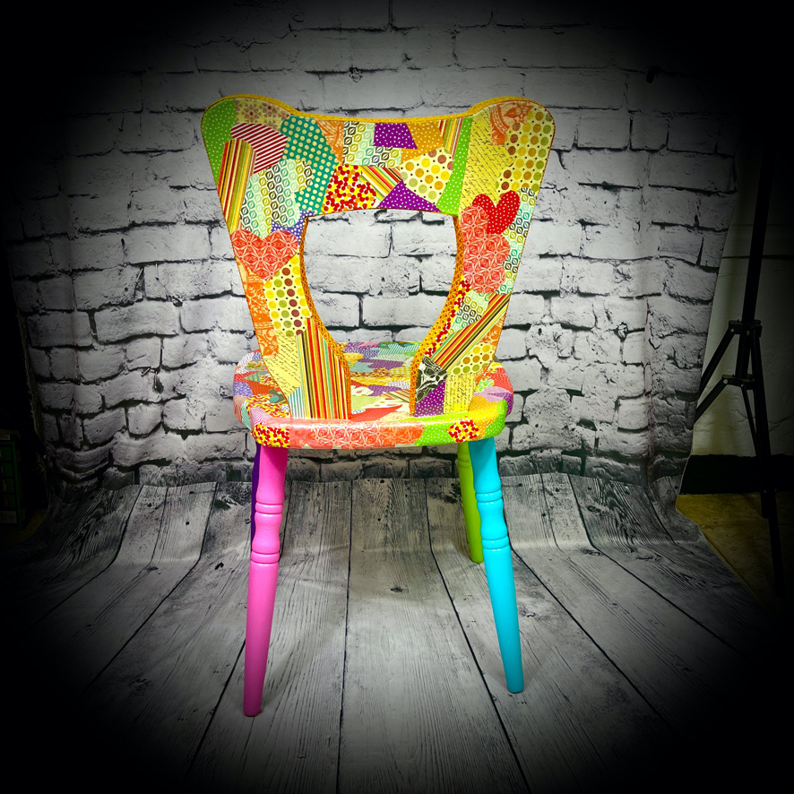This solid, wooden chair has been decoupaged and painted in multi-colours to make a unique, practical and standout piece of furniture.