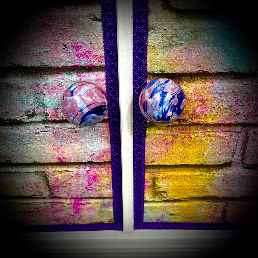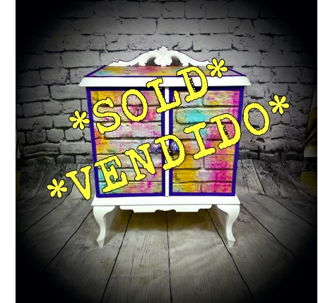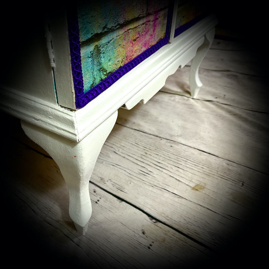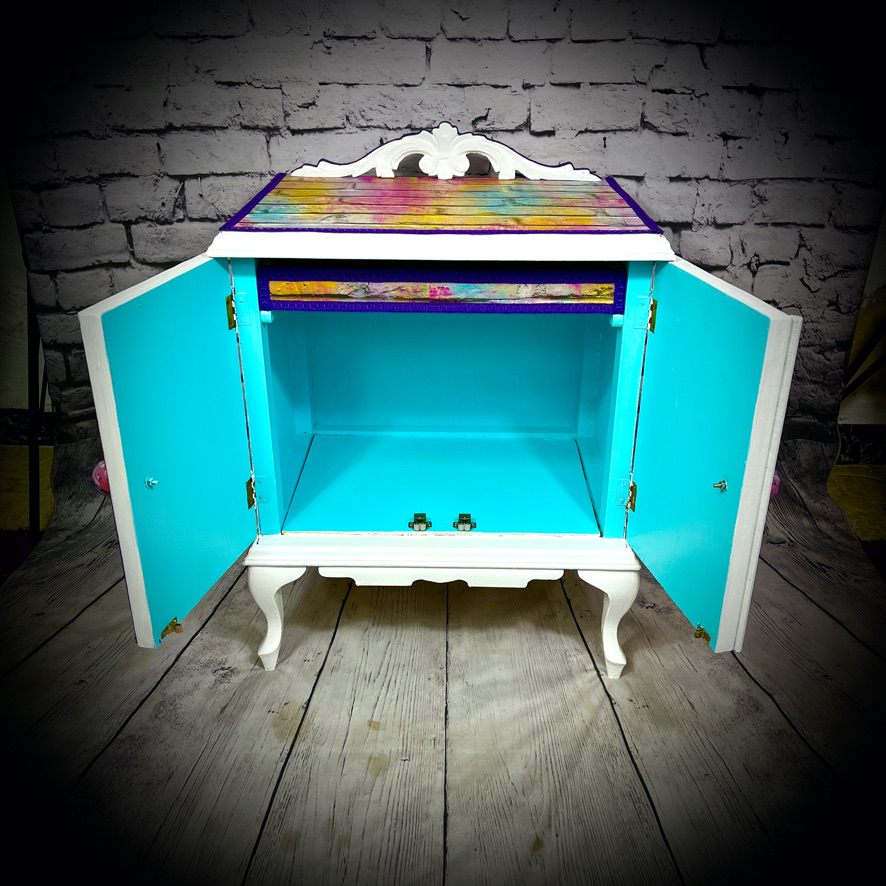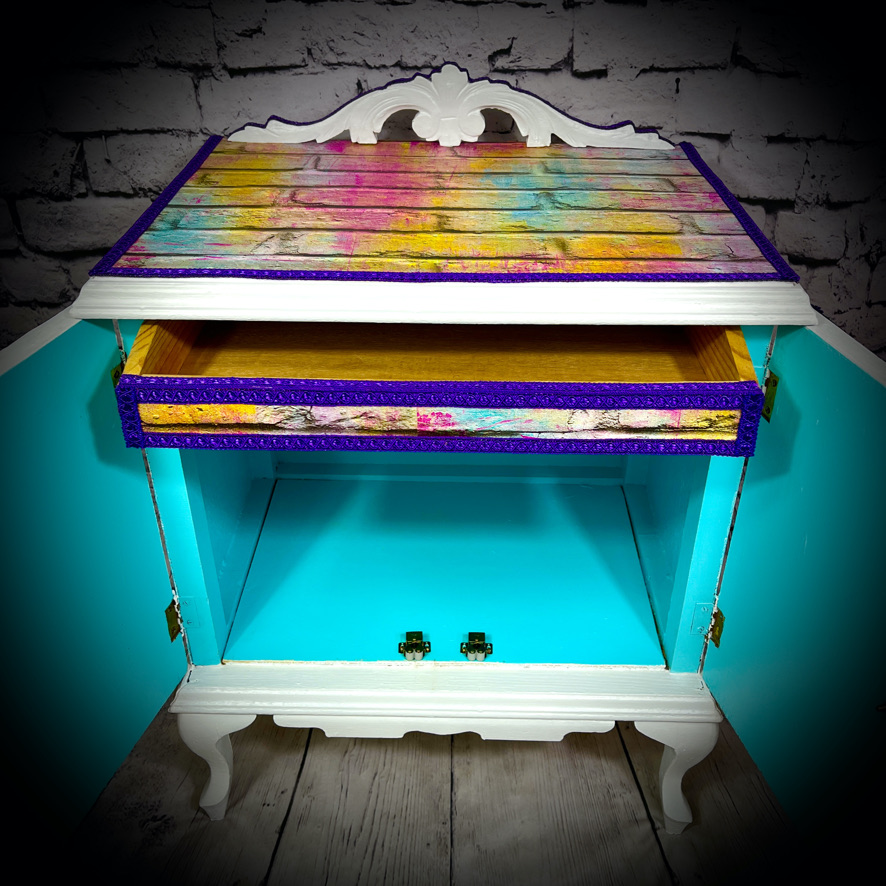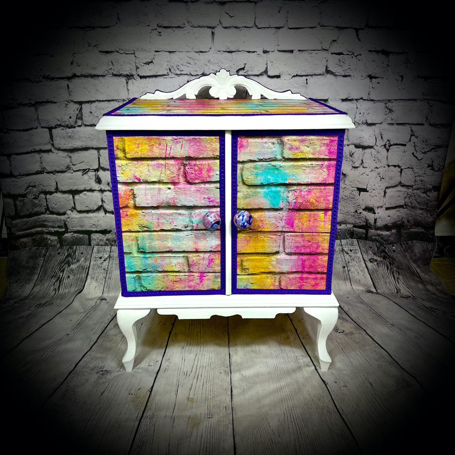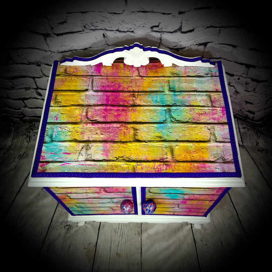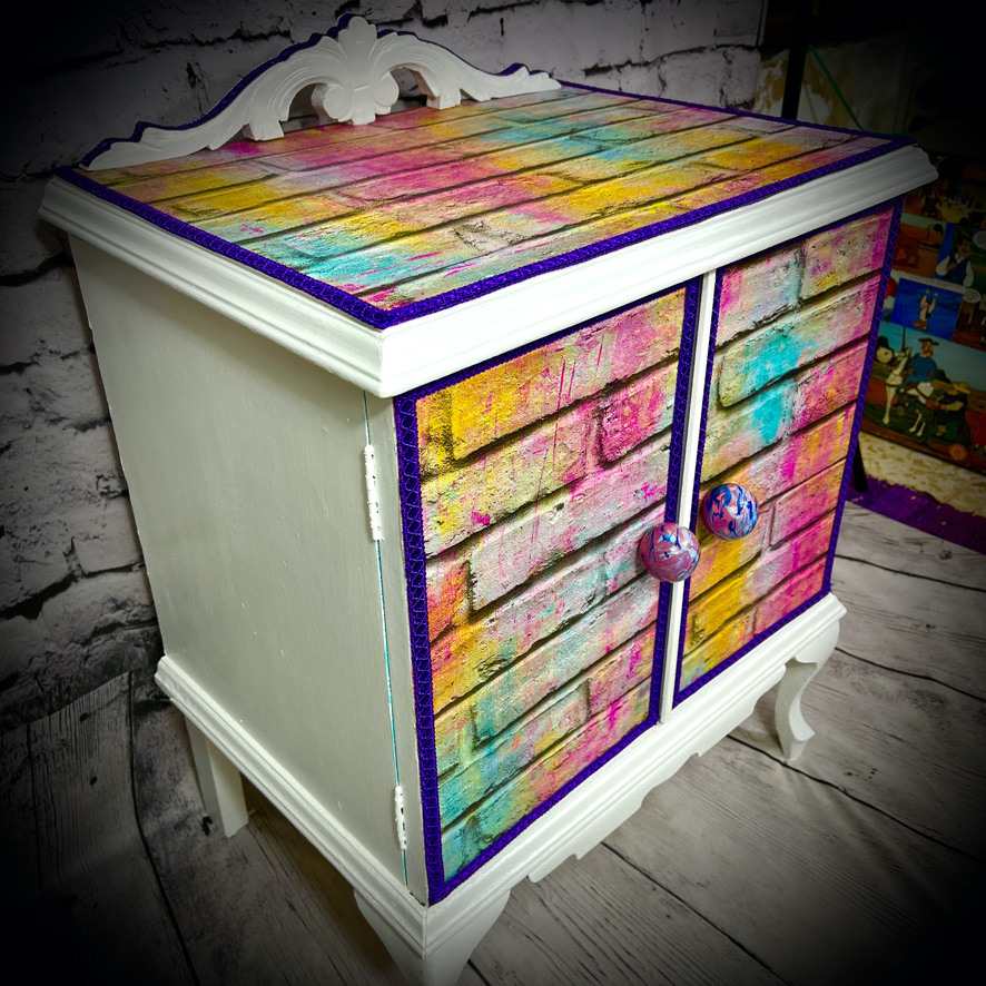 This cabinet with an internal drawer has been decoupaged with a vinyl wallpaper in a “neon bricks” design to make a bright, standout piece of furniture.