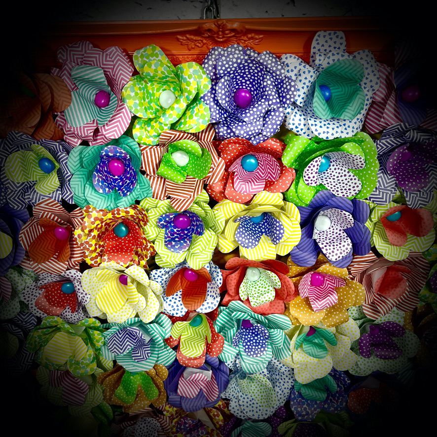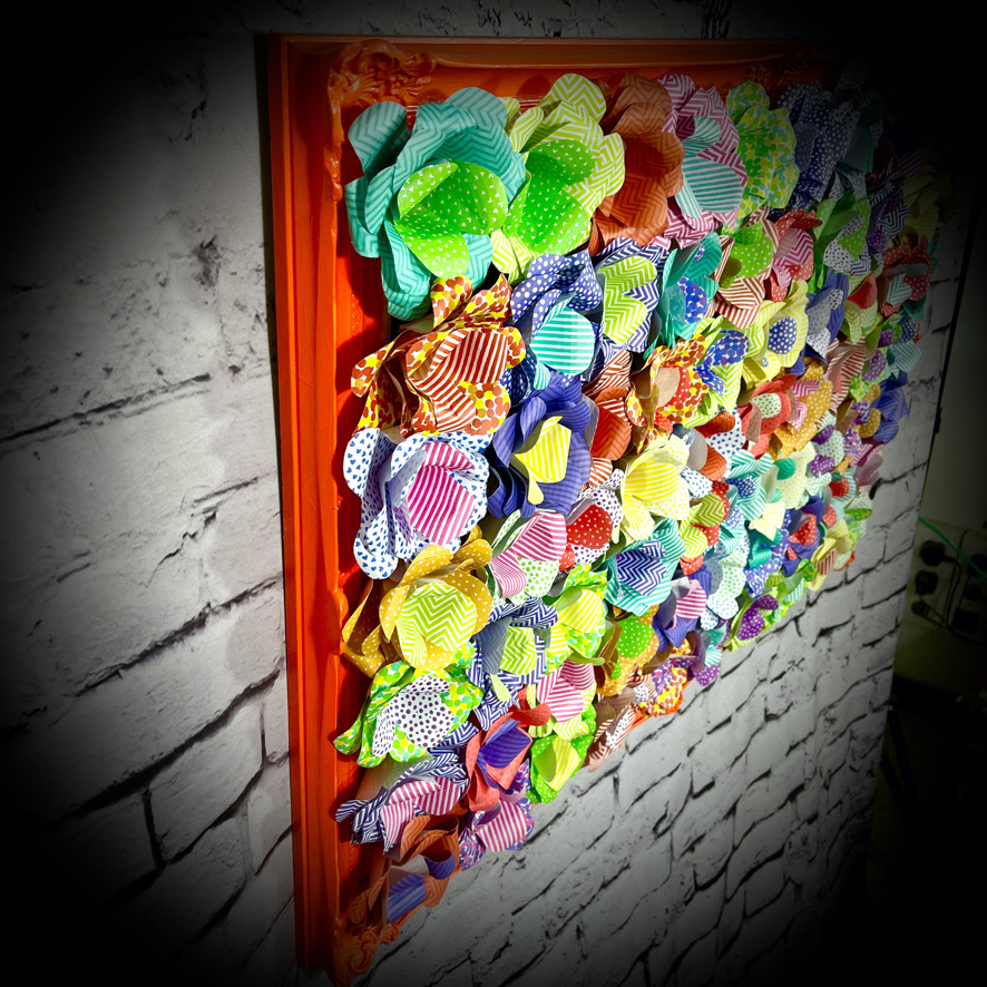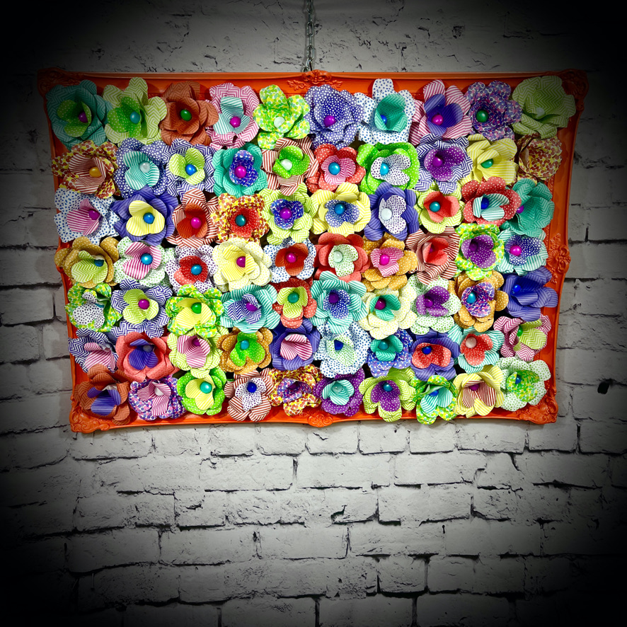 Set in an ornate, orange frame, these hand-crafted paper flowers create a unique and stunning piece of wall art