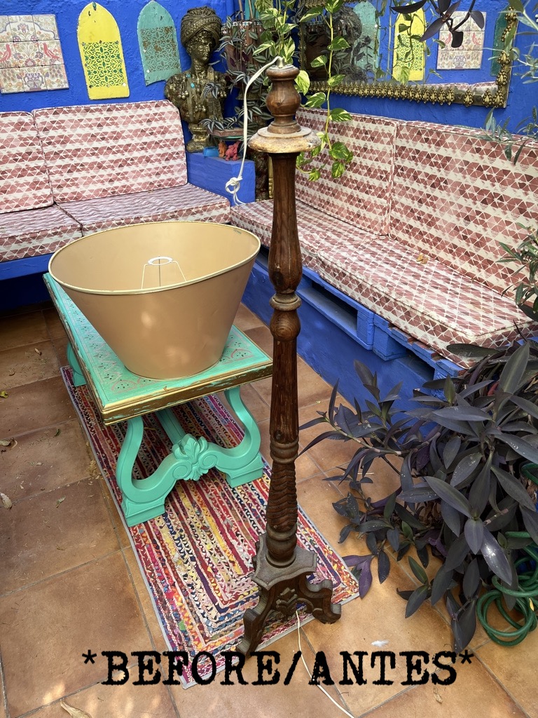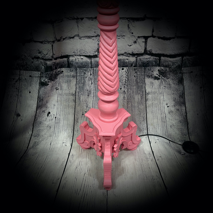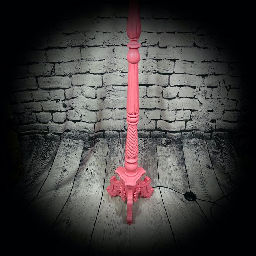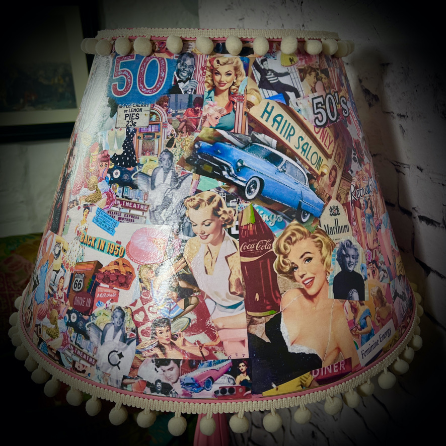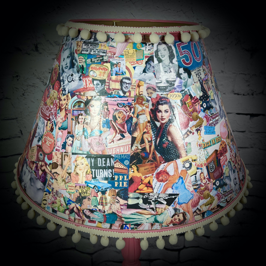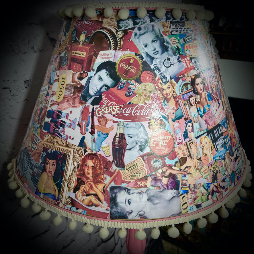 This standard lamp, with a very stylish carved stand, has been given a pink paint-over and a shade decorated with classic 1950s images. Unique, stunning and practical!