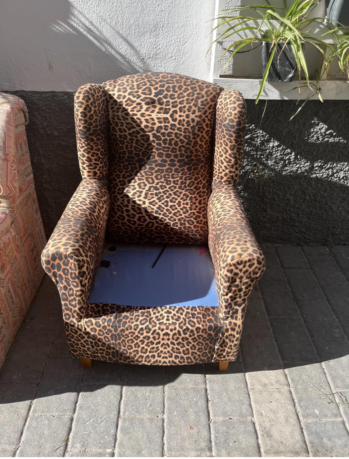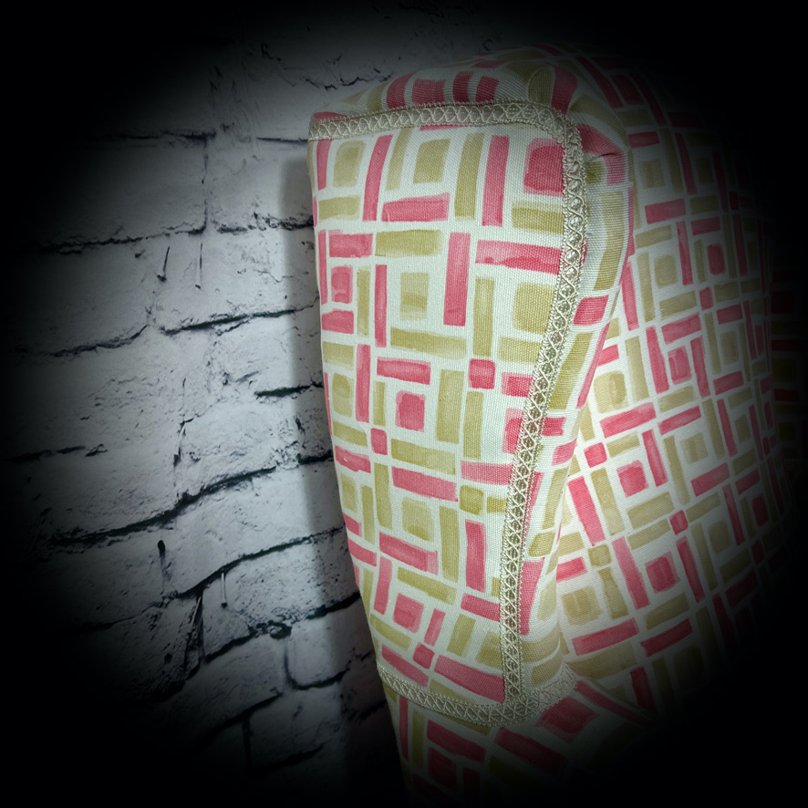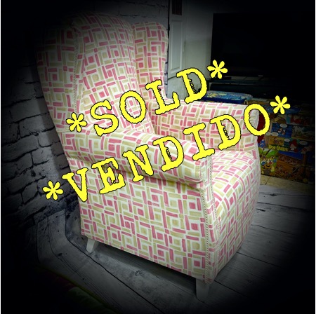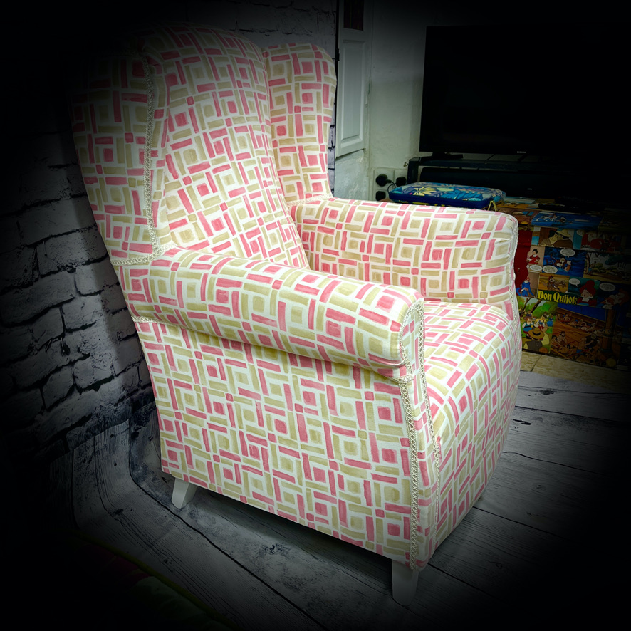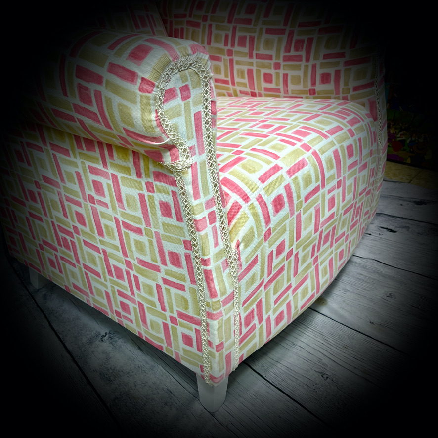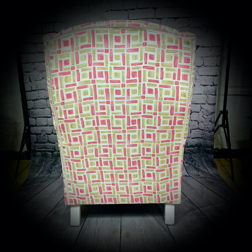 This winged armchair has been rescued from a trip to the landfill and given a new lease of life with a bright, fresh new upholstery and seat in a lively pink and pistachio fabric, making a really comfortable armchair.