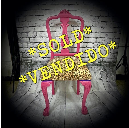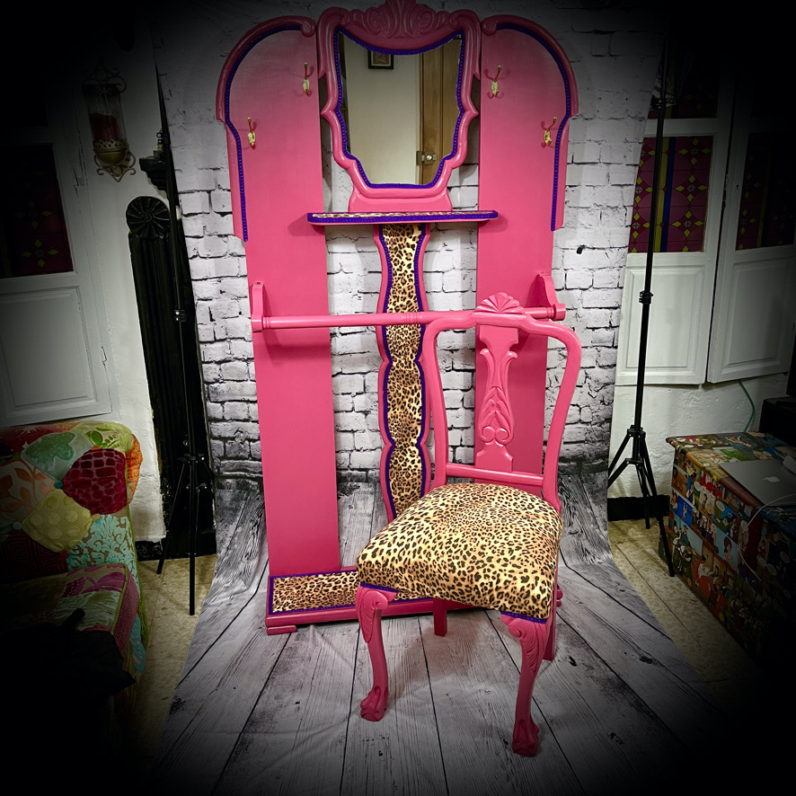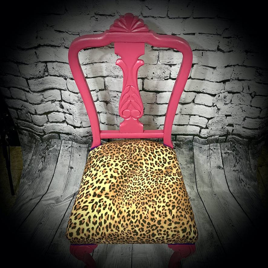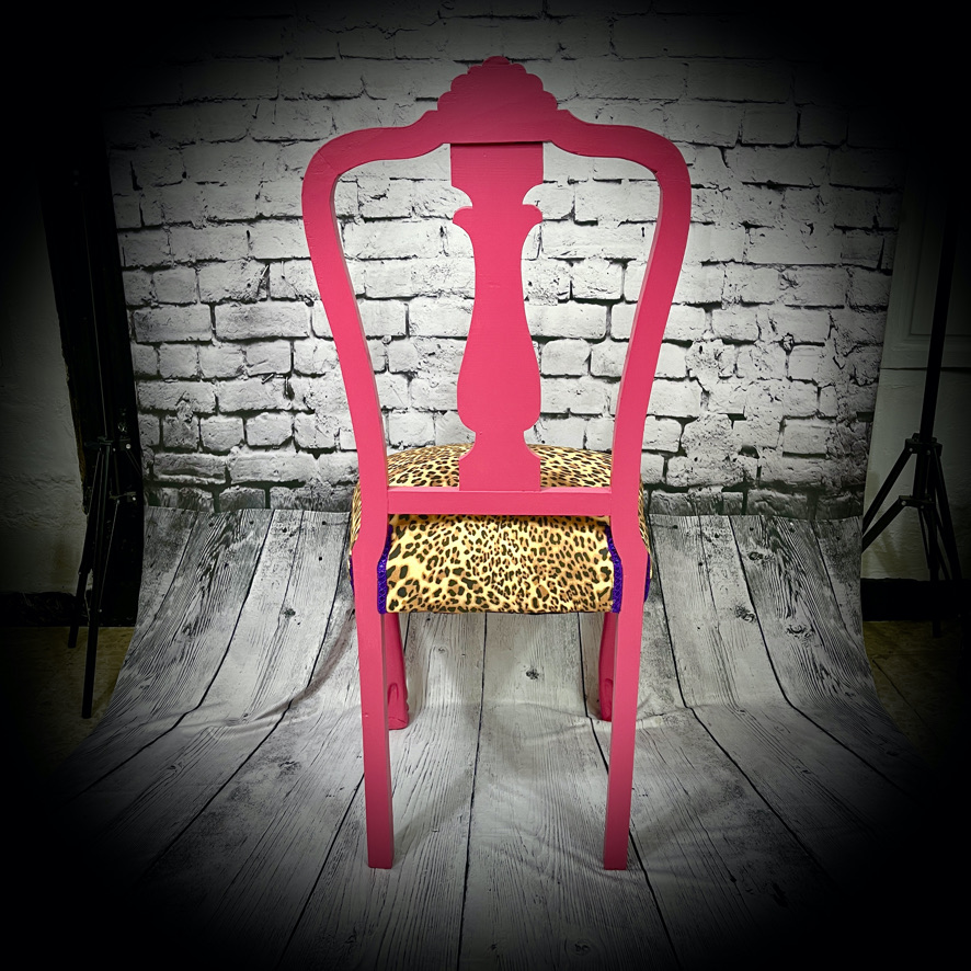 This solid, wooden chair has been re-upholstered in leopeard-print and given a pink makeover to produce a unique and eye-catching piece of furniture.