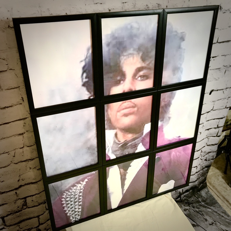 Totally unique large wall art featuring Prince set behind 9 individual black frames, making an standout feature. 2 hanging fixings on the back.