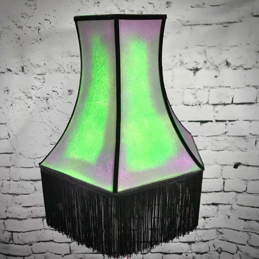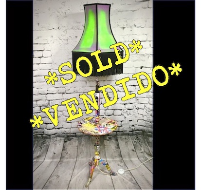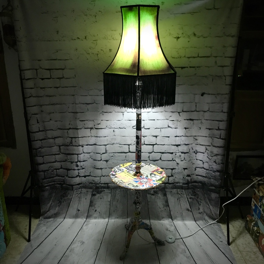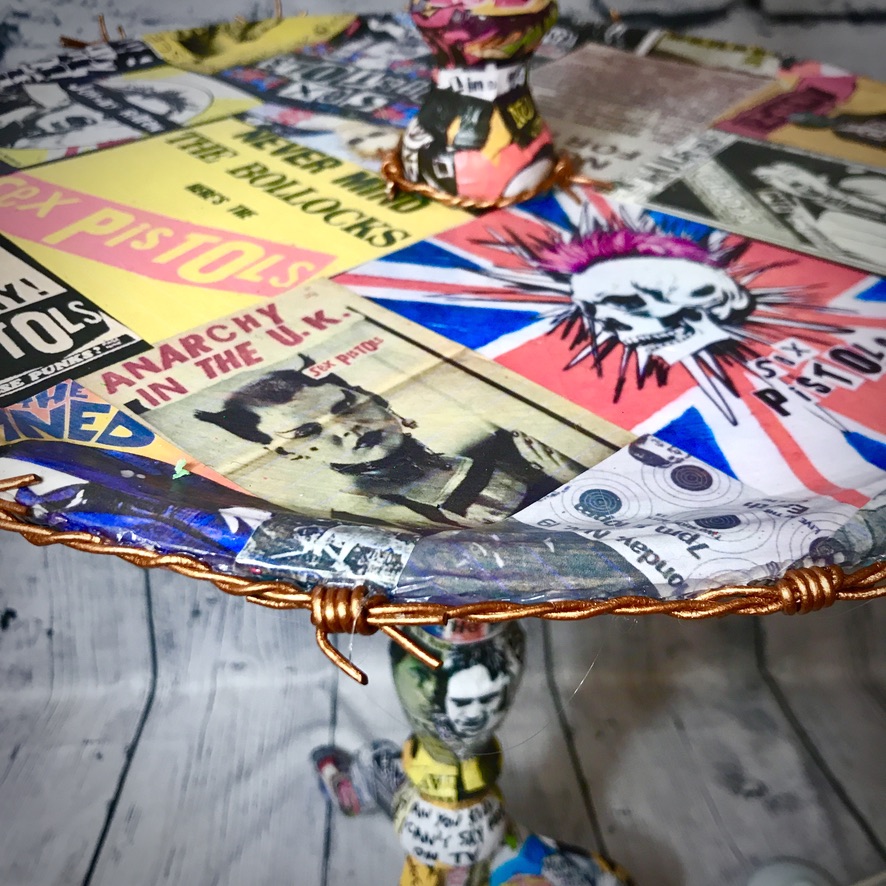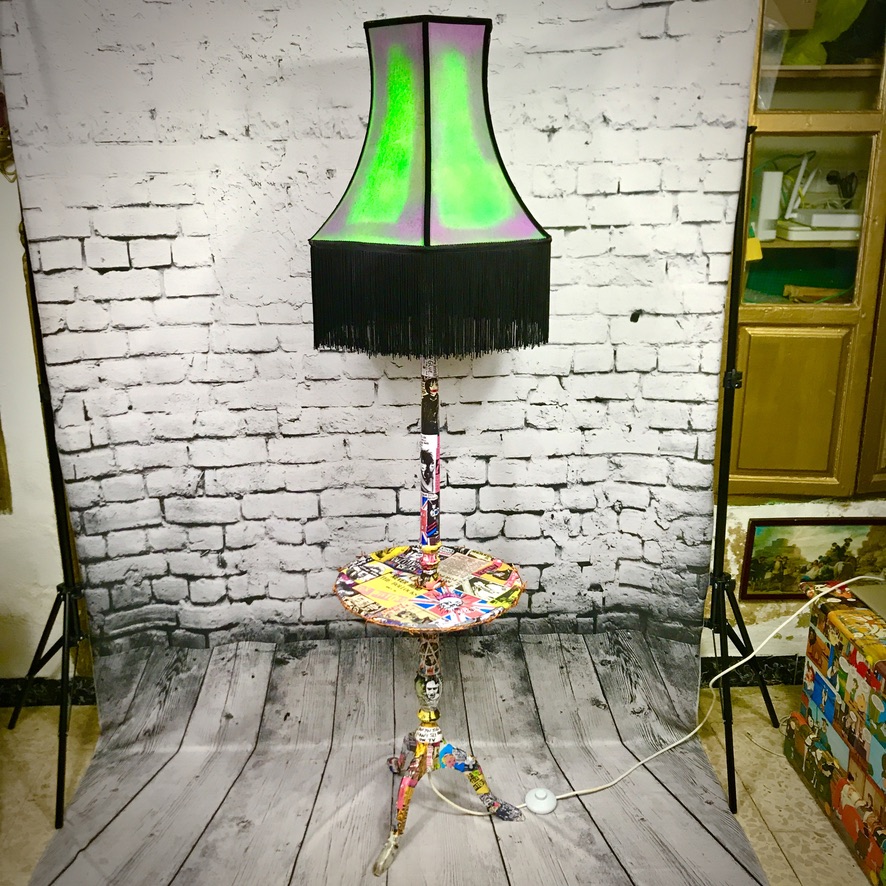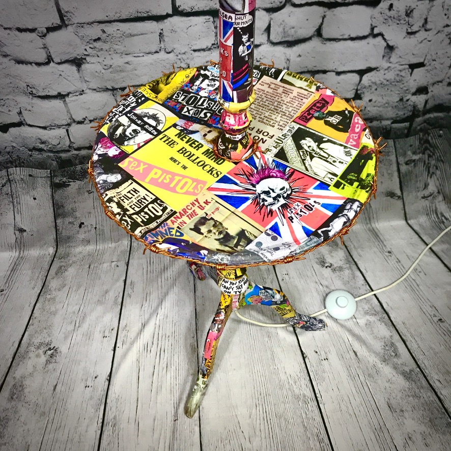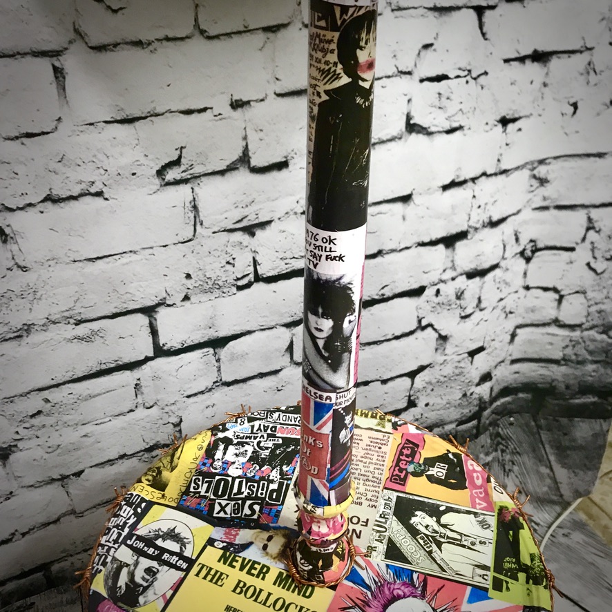 Standing 160cms tall, this floor lamp with an integral table fitting has been given a “punk” makeover! The body and table fitting have been decoupaged with punk images and the shade, with long black fringing, has been spray painted. The table fitting has a fake barbed wire trim!!!!